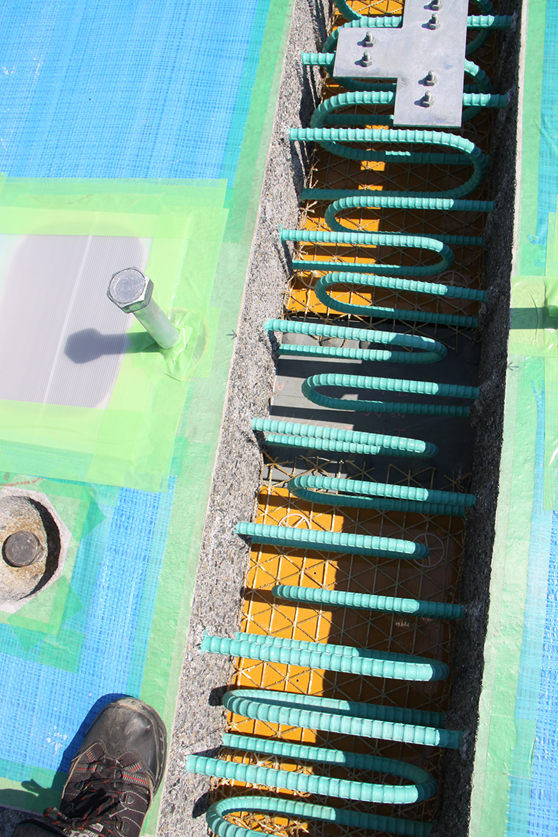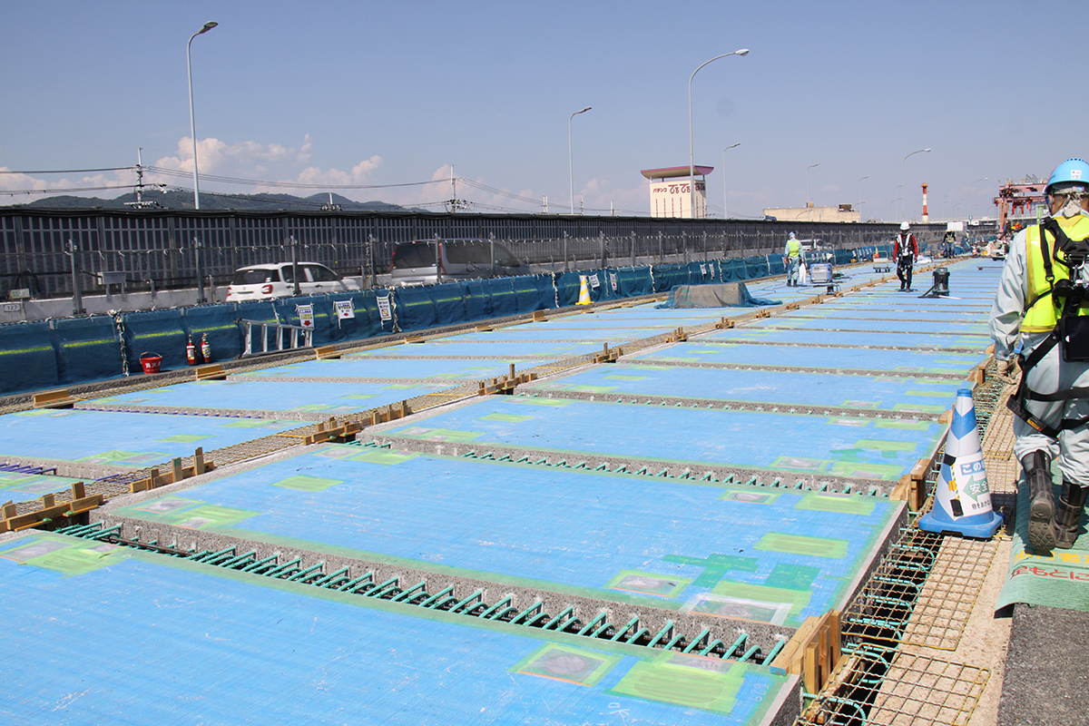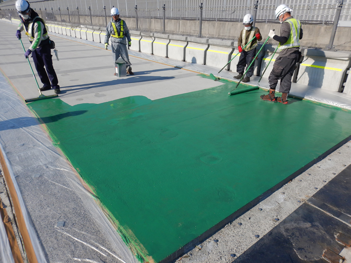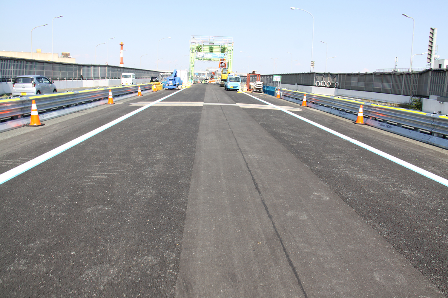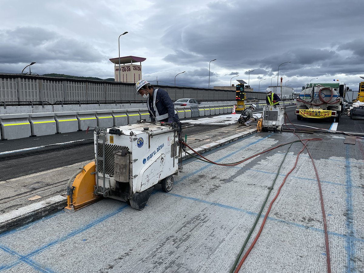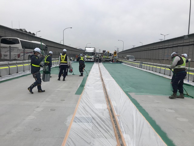 床版防水については、中分部などを除き、高性能床版防水(ここではHQハイブレンAU工法を採用)を施し、本設の舗装を施工している。