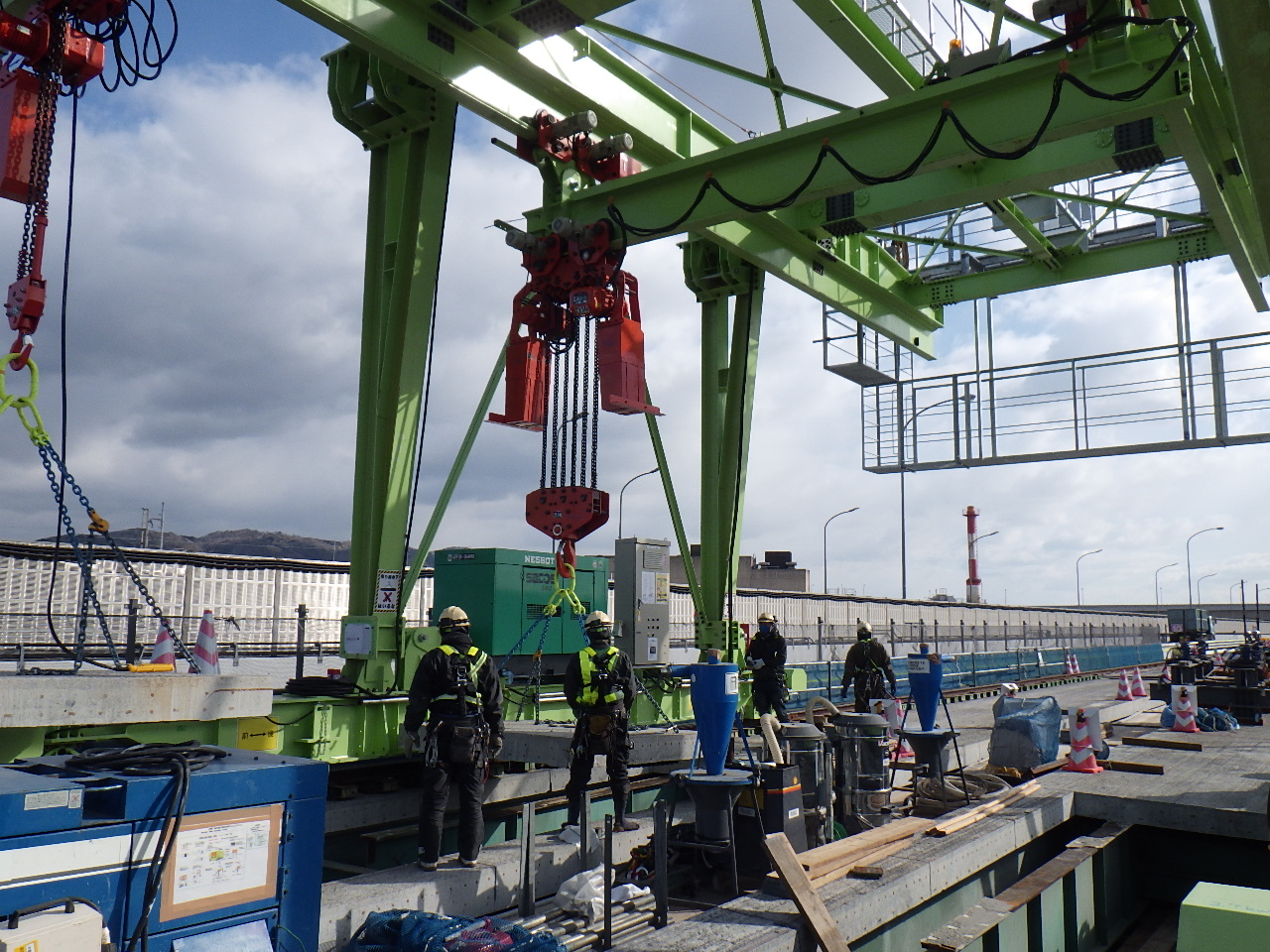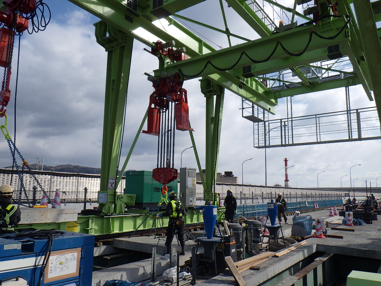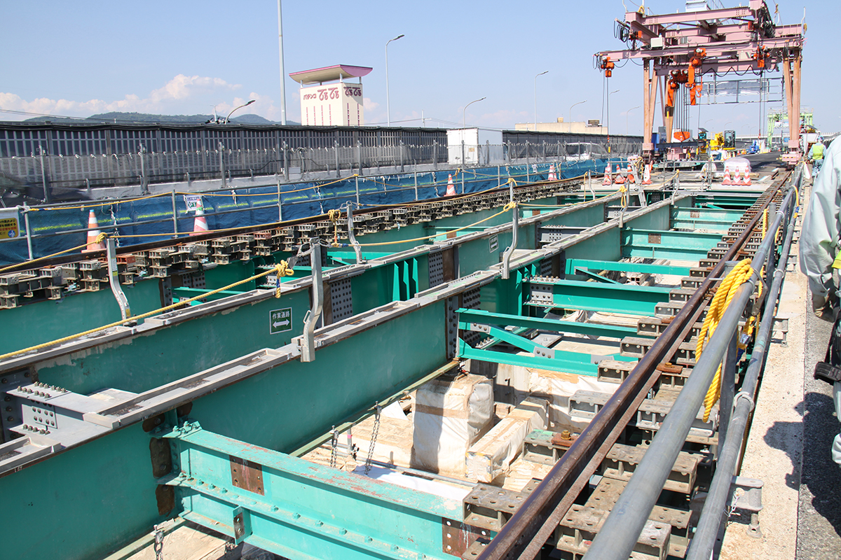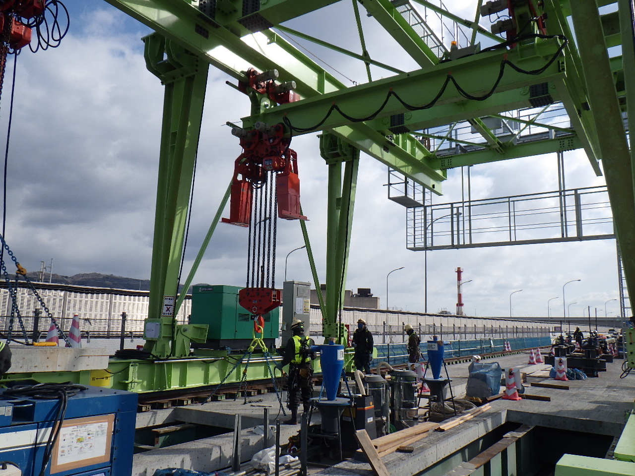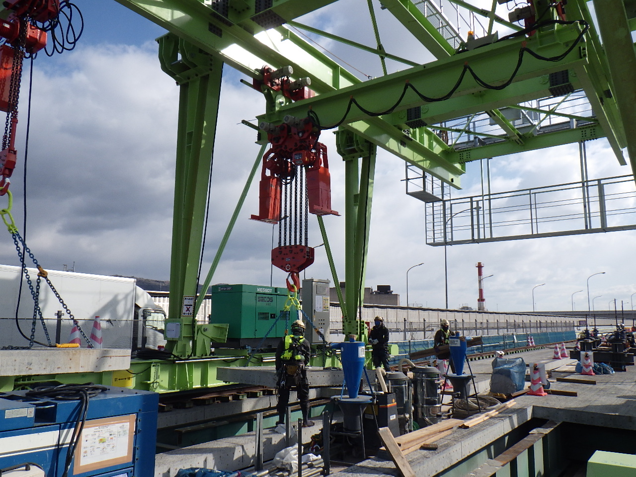 クレーン組立てと並行して、各施工箇所の主桁直上の既設床版上には、最初に撤去する箇所を除いて門型架設機を移動させるためのレールを敷き、そのレール上を門型架設機が移動する。