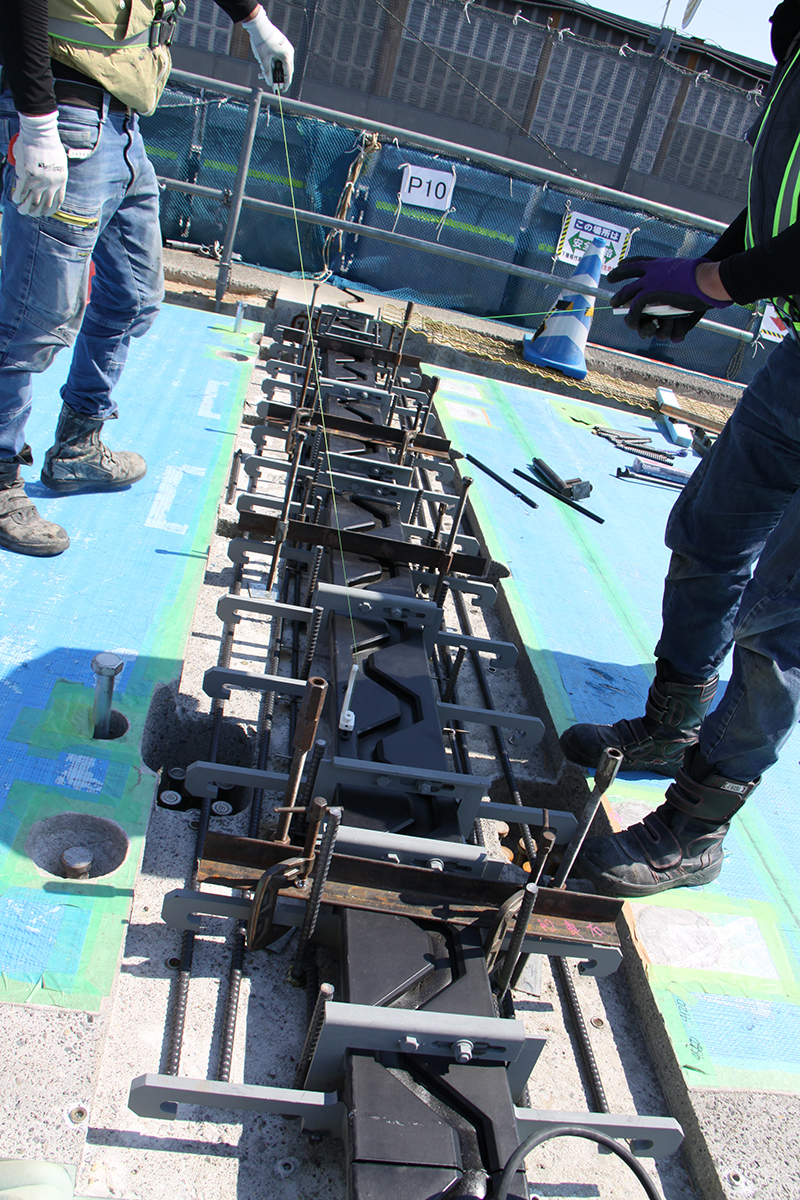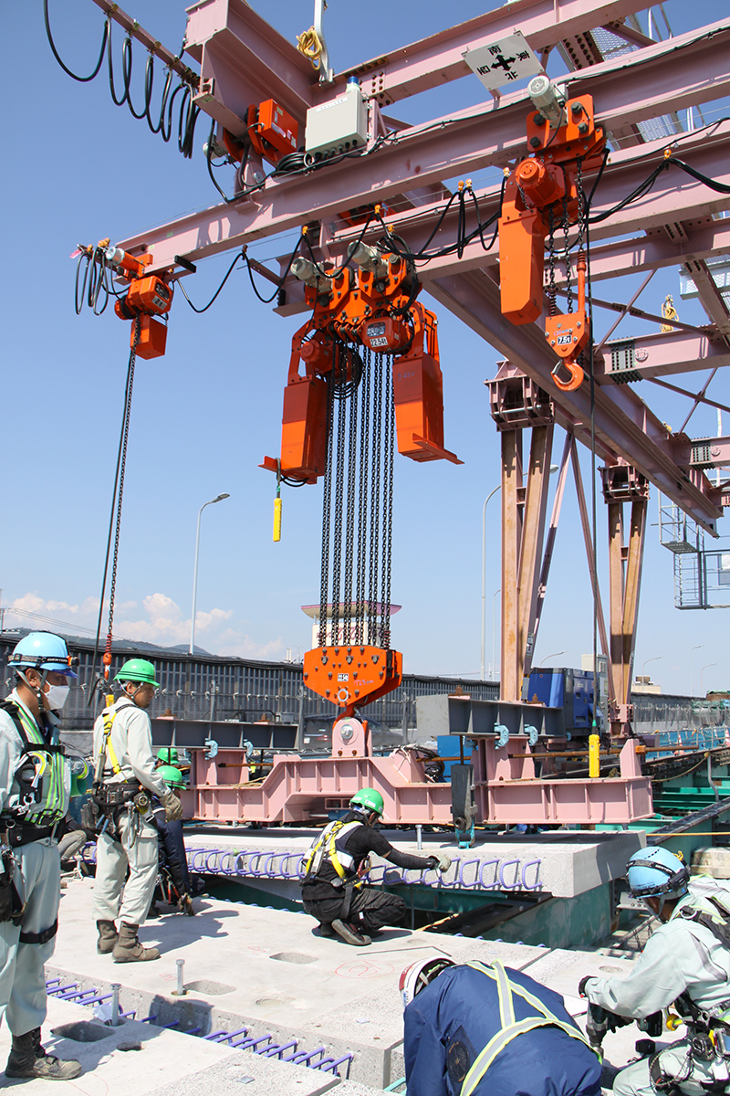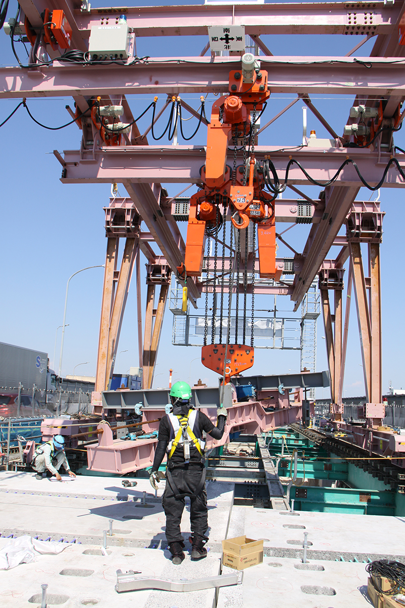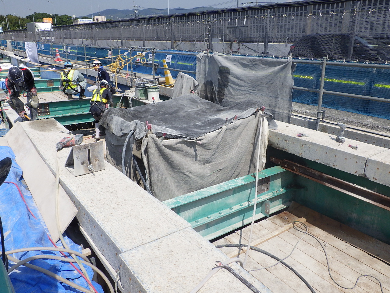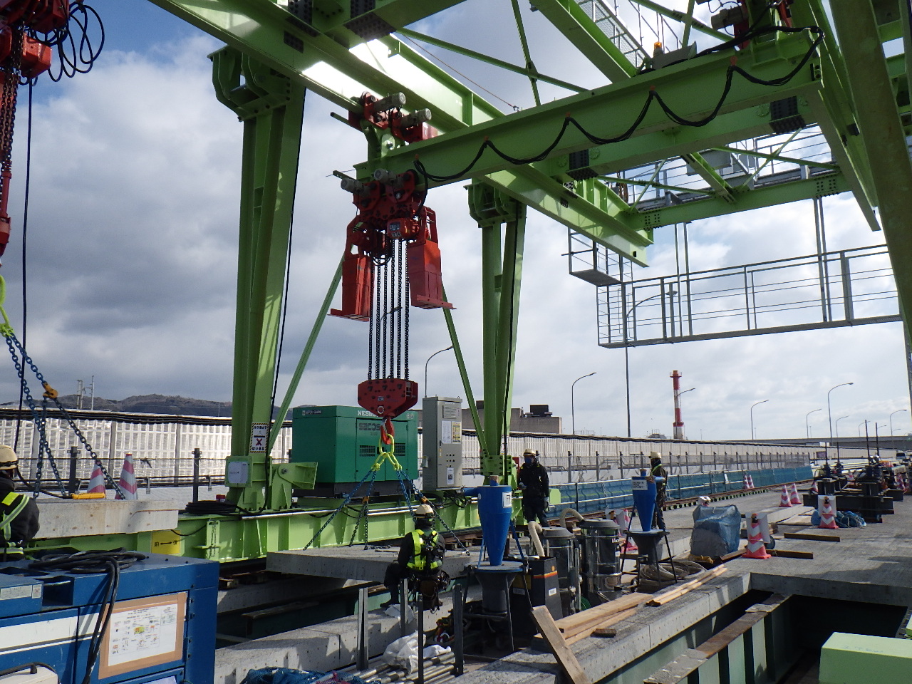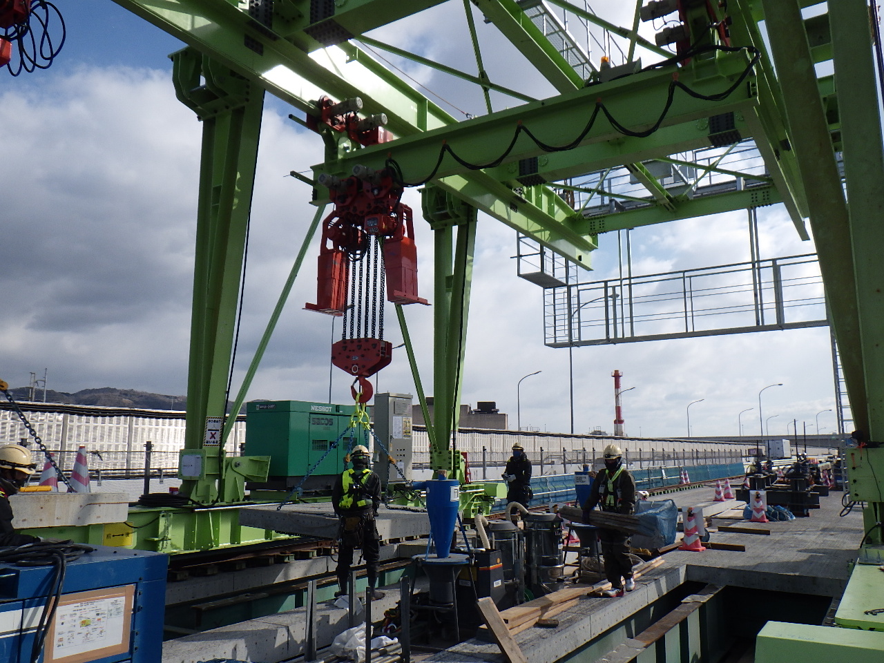クレーン組立てと並行して、各施工箇所の主桁直上の既設床版上には、最初に撤去する箇所を除いて門型架設機を移動させるためのレールを敷き、そのレール上を門型架設機が移動する。