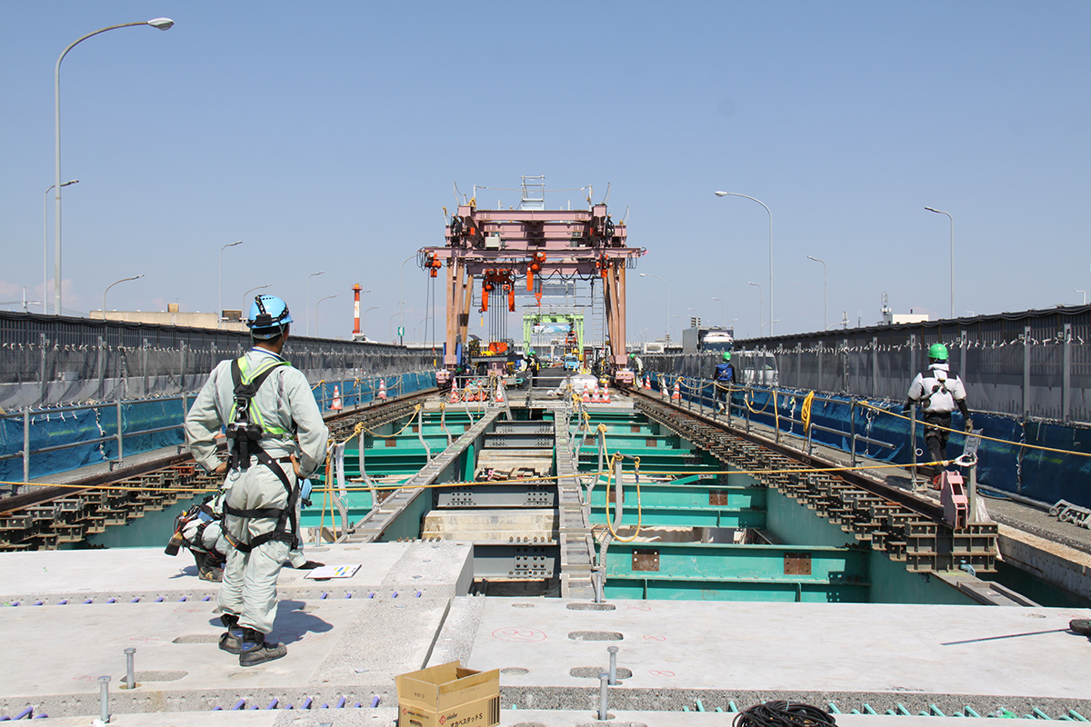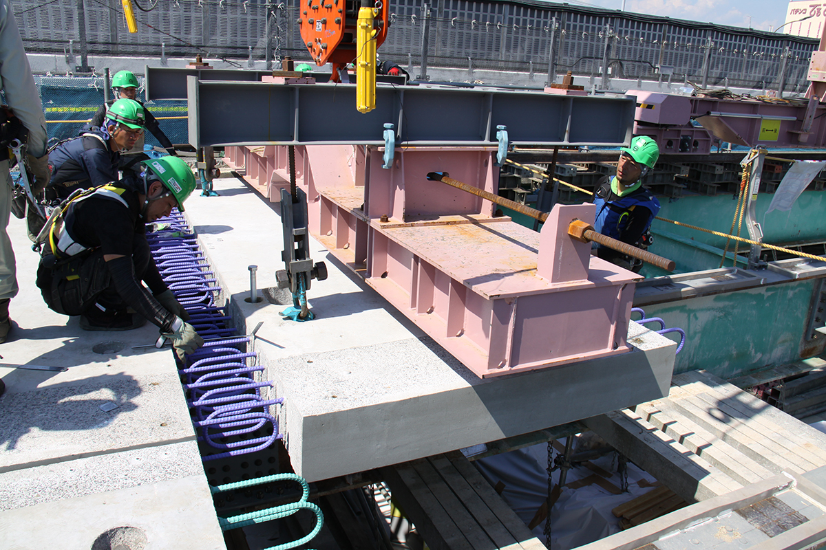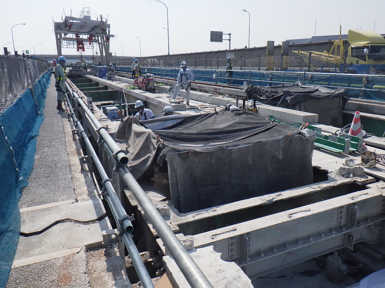 中分部は、その後、上下線の床版取替時に2車線を確保するための車線運用を行わなくてはいけない。そのため、最終的には中分部はセパレートになるが、運用時はその部分をスポンジ材などで埋め、その上に舗装をかけて、車両通行できるように一体化する。また、主桁に想定外の負担が生じないように仮設の横桁を配置する補強も施している。