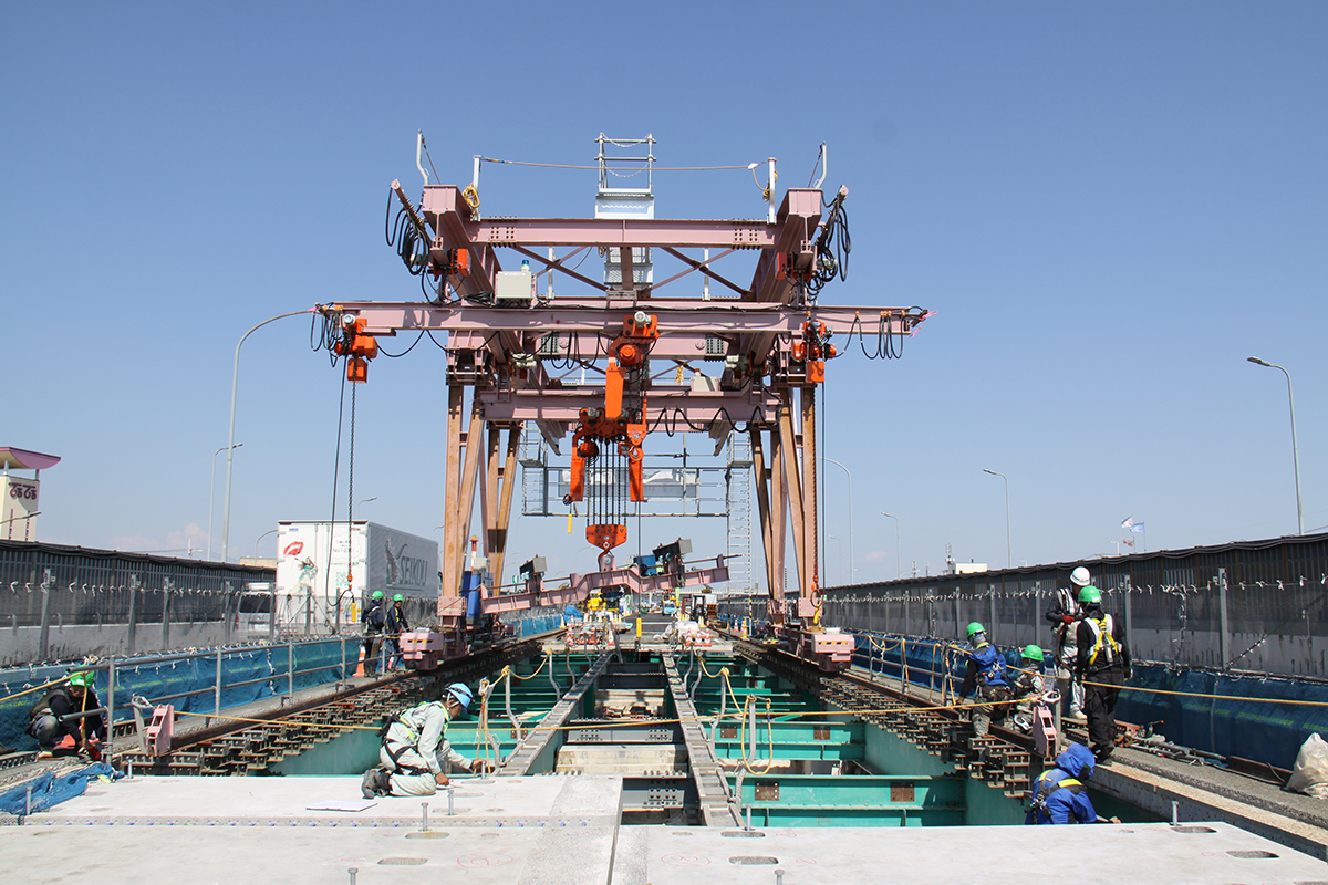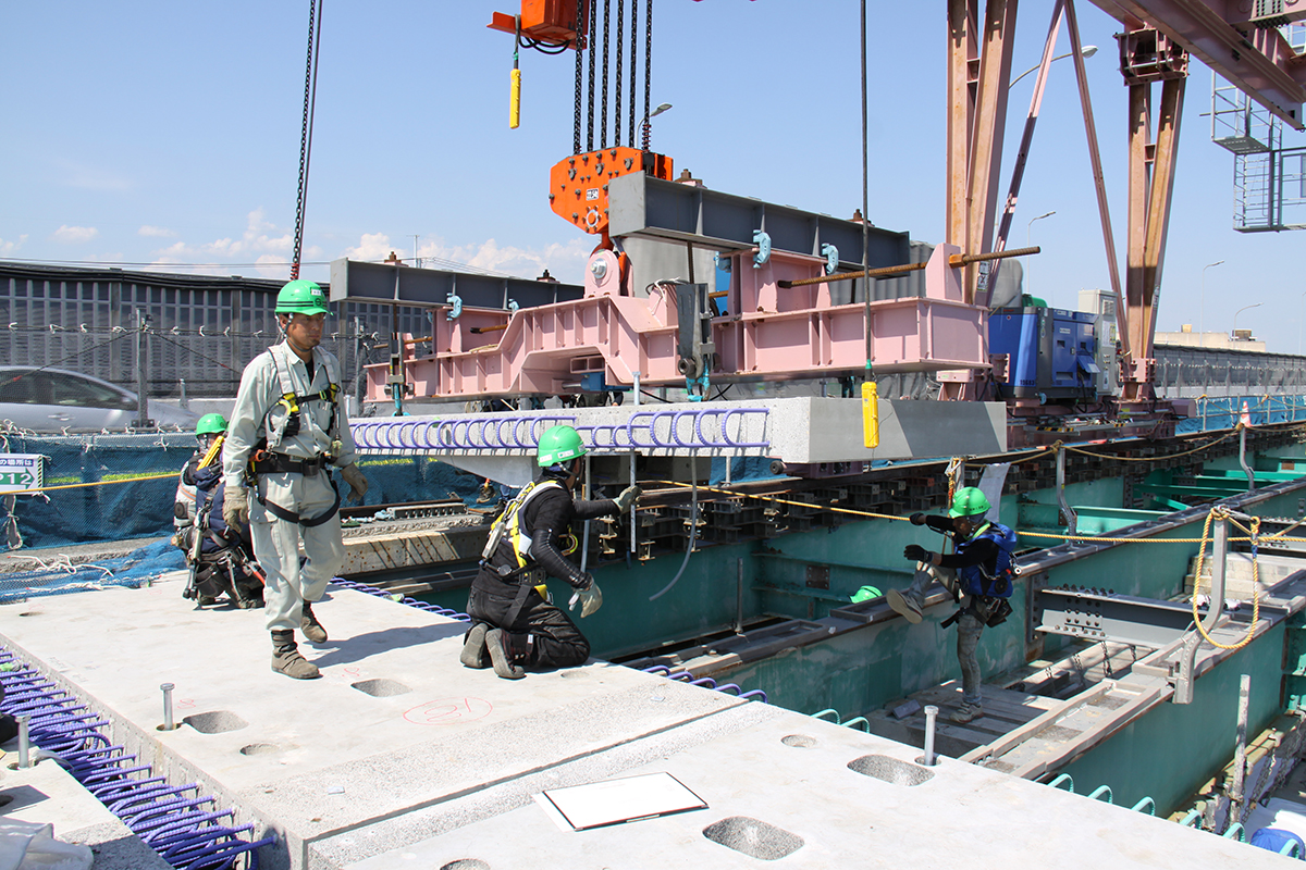 各施工区間内の既設床版を完全に撤去し、主桁上フランジ直上の研掃が完了した後は、その上に再度、最初の新設PCaPC床版パネルを架設する部分を除いてレールを敷設(モルトメールなどを設置)し、門型架設機を自走させPCaPC床版パネルを架設、完了後は次に架設する部分のレールを撤去し、新たに架設していくということを繰り返していく。