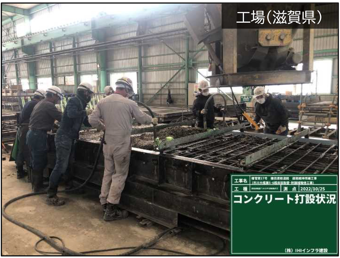 HSLスラブはIHIインフラ建設の滋賀工場で製作しているが、その際はMRデバイスを用いた遠隔臨場による工場検査を実施している。道路公社側と工場を双方向で結び、カメラ画像を事務所と共有することで遠隔立会を実現した。PC床版の配筋モデルを作成し、モデルとの重ね合わせ及びデジタルスケールを使用し測定結果の配筋帳票への自動転送を行う。兵庫県福崎町の公社管理事務所と滋賀県東近江市五箇荘にある滋賀工場の間を行き来することなく工場検査に立ち会えるため、立会に伴う時間的コストを大きく削減している。