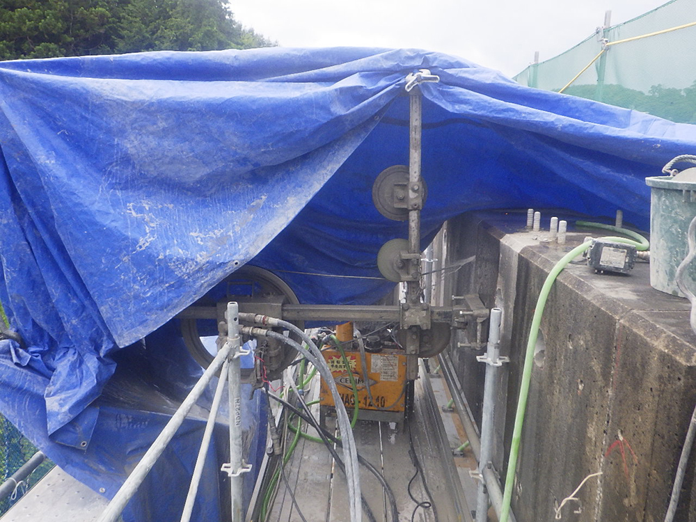 ワイヤーソー施工時には専用防護ネットで囲って飛散防止を図るとともに、排水養生シートを設置して足場上の排水受けから橋梁下のタンクに送水することで、橋梁下の調整池に影響を与えないようにしている。