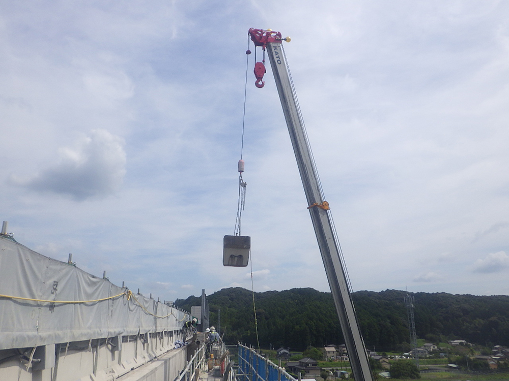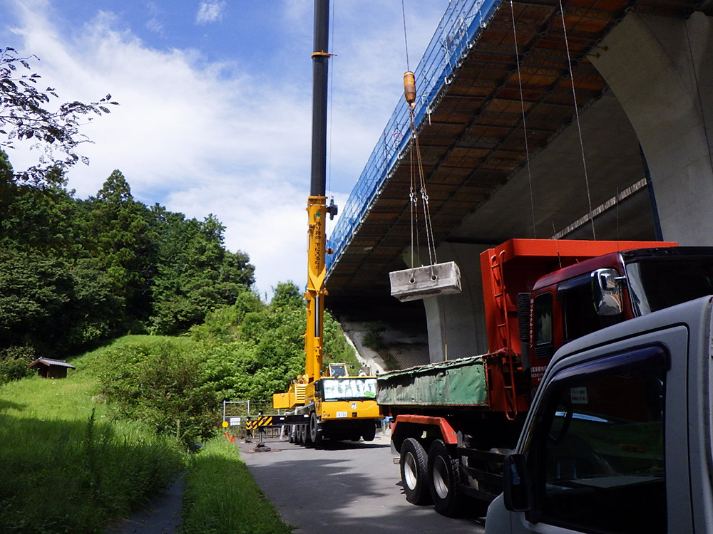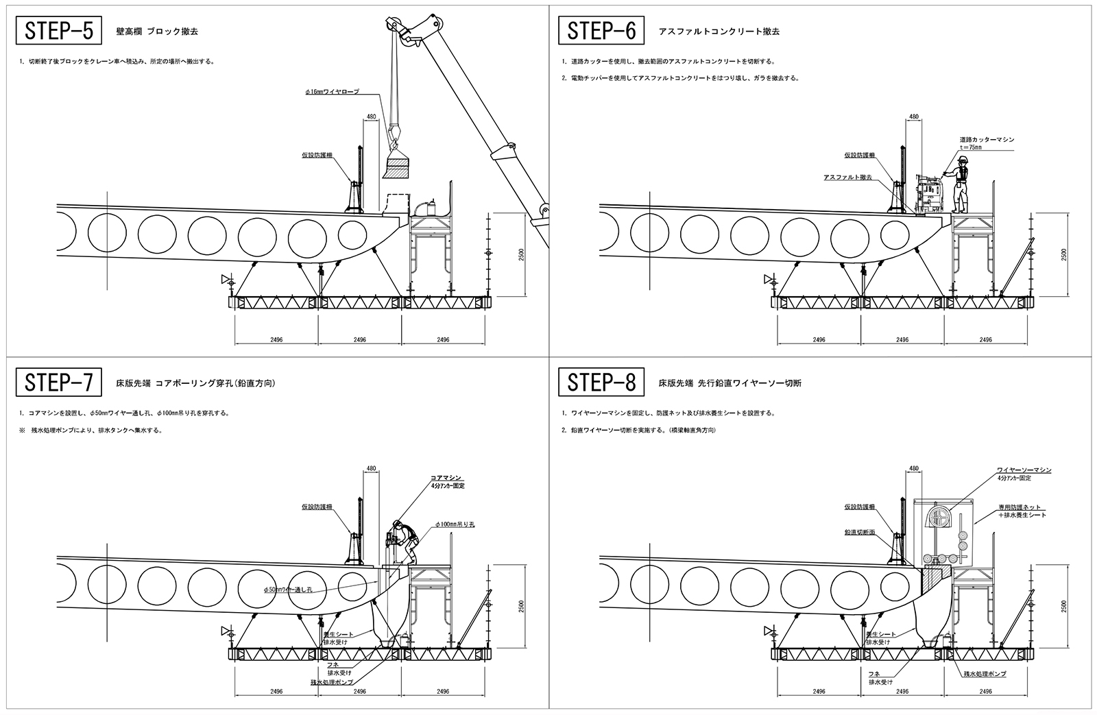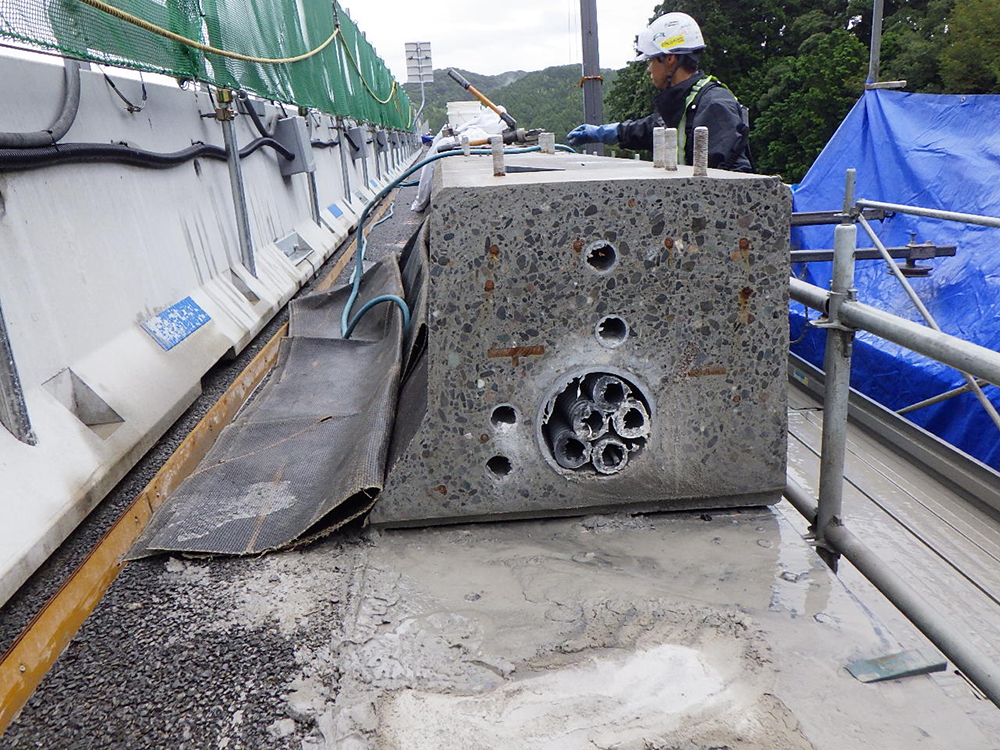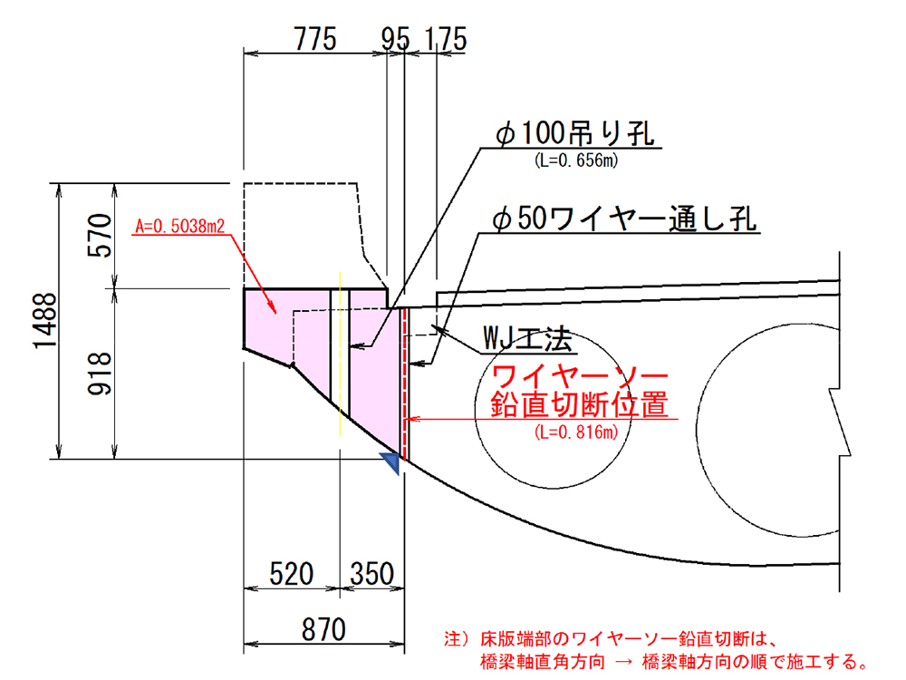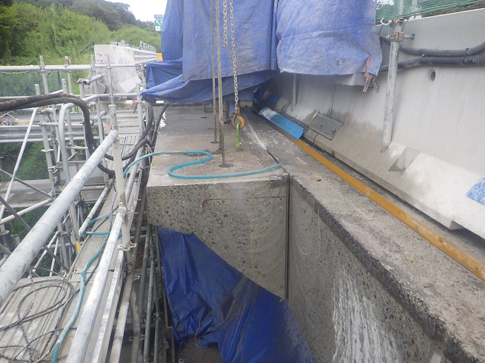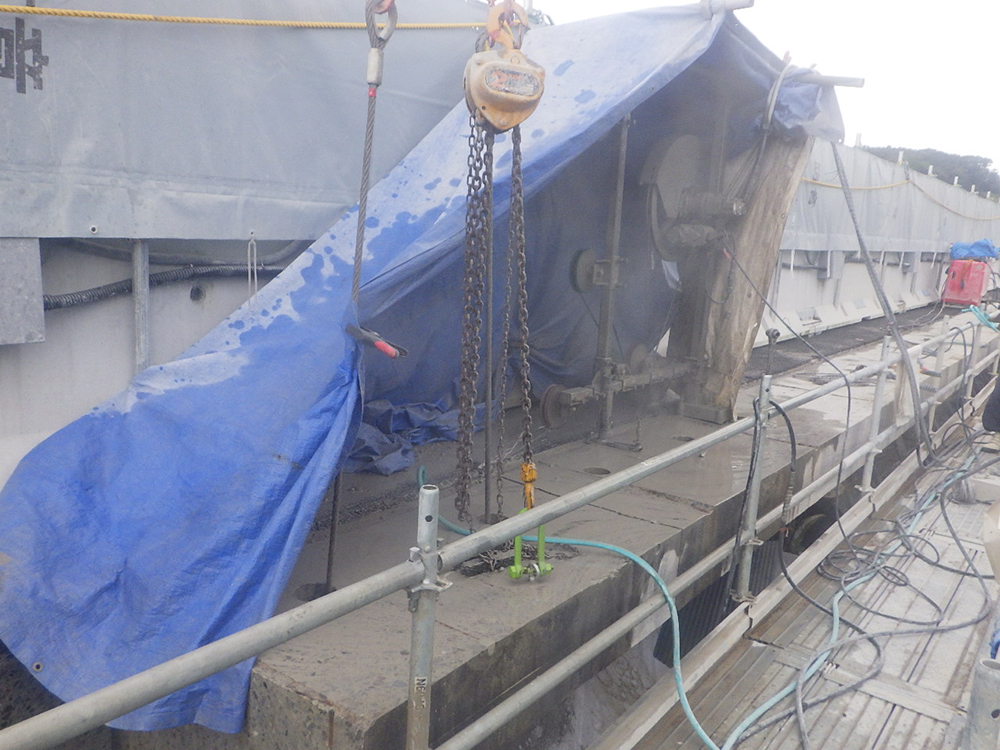 既設床版先端も同様に湿式ワイヤーソーで橋軸直角方向、橋軸方向の順番で切断していき、上下線とも壁高欄と同じブロック数の吊上げ撤去を行っている。切断サイズは橋軸方向平均1.5m(壁高欄と同じ)、橋軸直角方向は壁高欄側面を含めて0.87m(重量1.8t)とした。