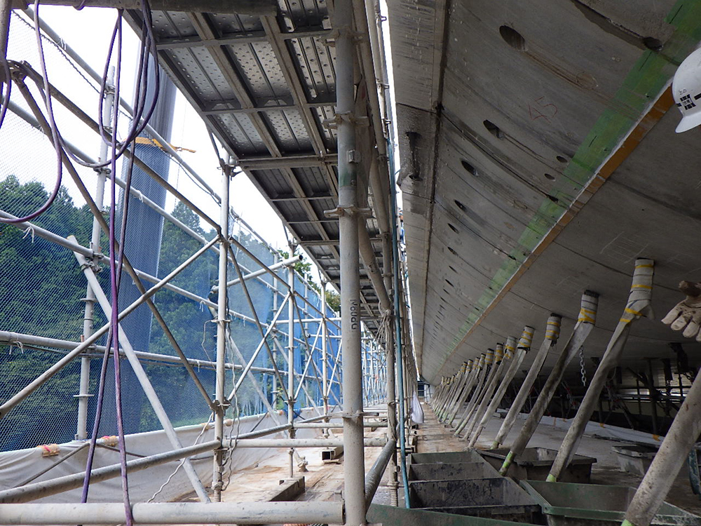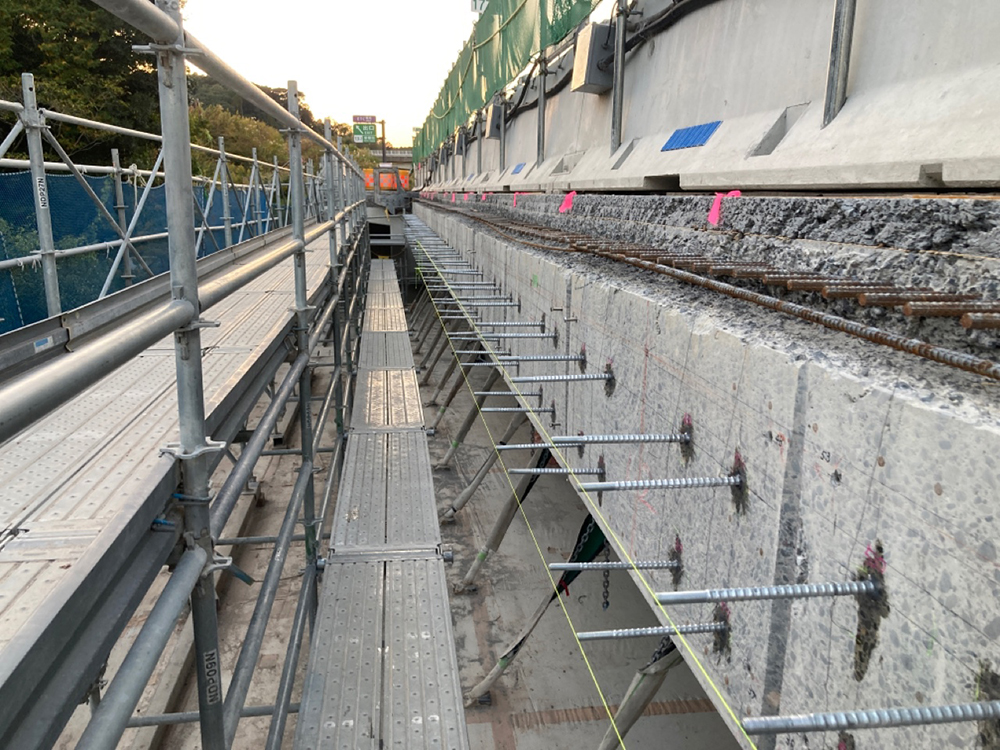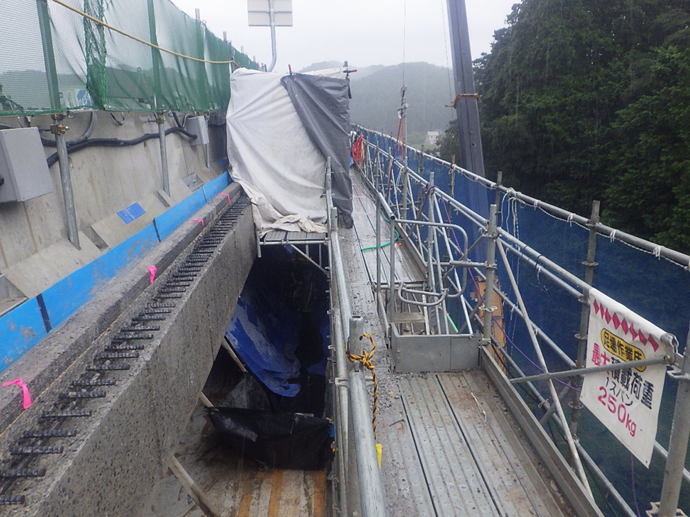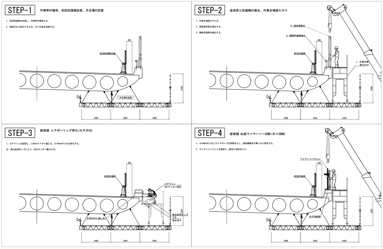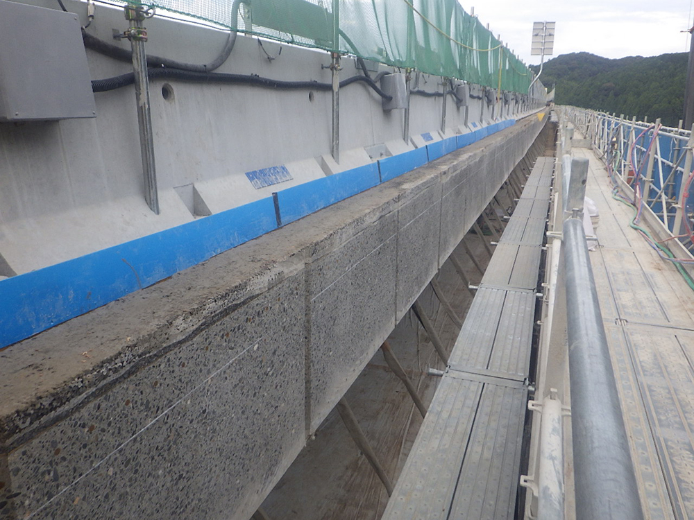 既設壁高欄の撤去は、剛性防護柵と吊足場(張出幅2.5m)を設置して遮音壁と既設防護柵を撤去後、吊足場上に作業足場を据え付けて施工している。クレーンで吊上げた状態で湿式のワイヤーソーを用いて天端から570mmの位置で水平切断を行った。切断サイズは橋軸方向平均1.5m×橋軸直角方向0.8m(重量1.4t)で、上り線121ブロック、下り線77ブロックをクレーンで吊上げ撤去していった。