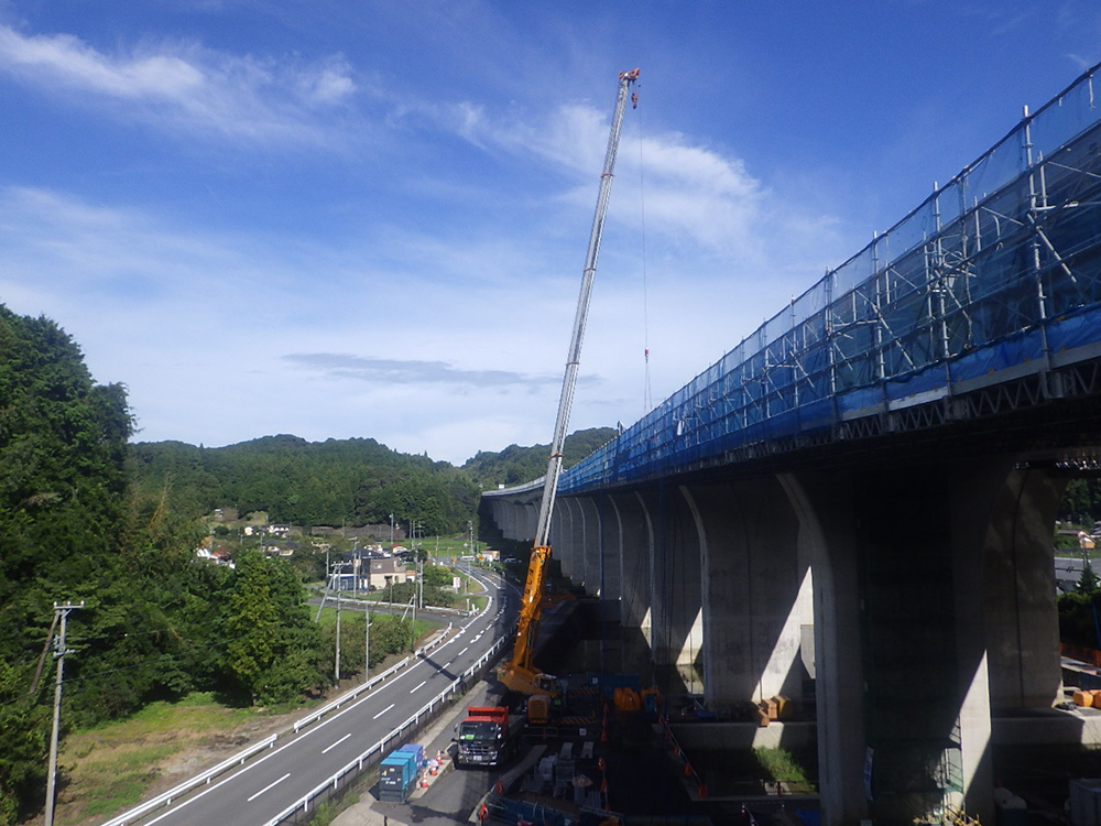 吊り撤去での盛替えにも想定以上の時間を要することとなった。前述したように上り線では220t吊クレーンをP2およびP6付近にしか配置できないという制限があり、P4付近の施工ではブーム長が63mに達するなど、クレーンの稼働に慎重を期さなければならなかったためだ。また、撤去部材から2.7mの位置に吊足場の朝顔があり、それに干渉しないように施工することも求められた。これは、プレキャストリブの架設とPC板版の設置でも同様だった。
