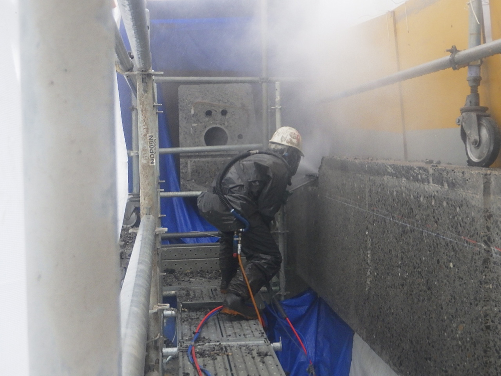 供用路線側はコンパネで養生し、ワイヤーソーと同じ防護ネットと排水養生シートを設置して、最大水圧240MPaのハンドガンを用いて施工したが、「コンクリートの品質が良くて硬かったので、1日の作業が捗らなかった」(熊谷組)。