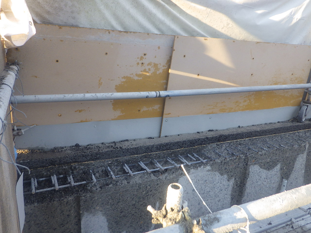 リブ付き張出床版と接続する範囲の既設床版の上縁側鉄筋はウォータージェット(WJ)工法ではつり出した。既設鉄筋のかぶり厚は45mmで、WJによるはつり範囲は厚さ150mm、橋軸直角方向175mmとした。
