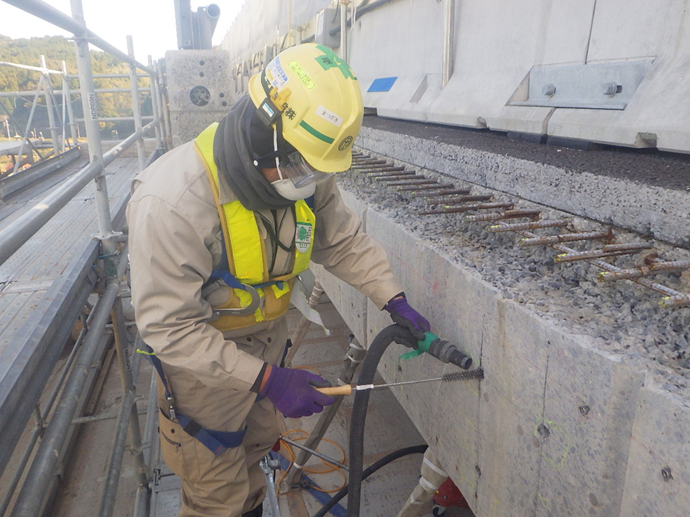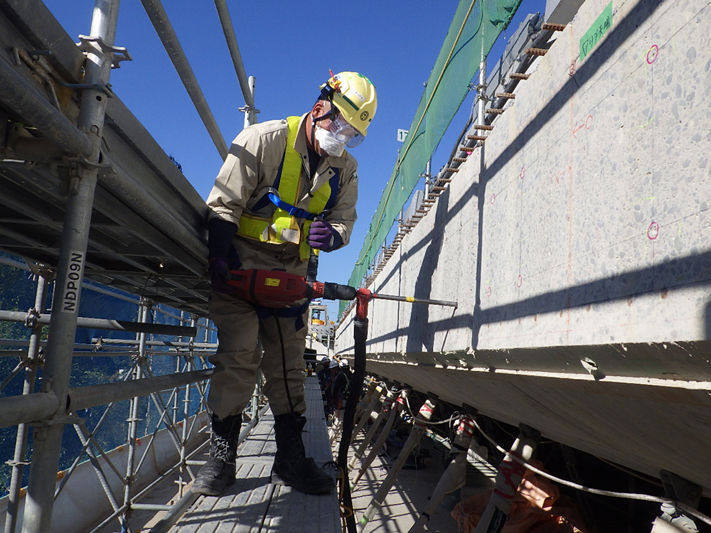 既設床版上縁側鉄のはつり作業。コンクリートが硬く、施工班を増やして対応した