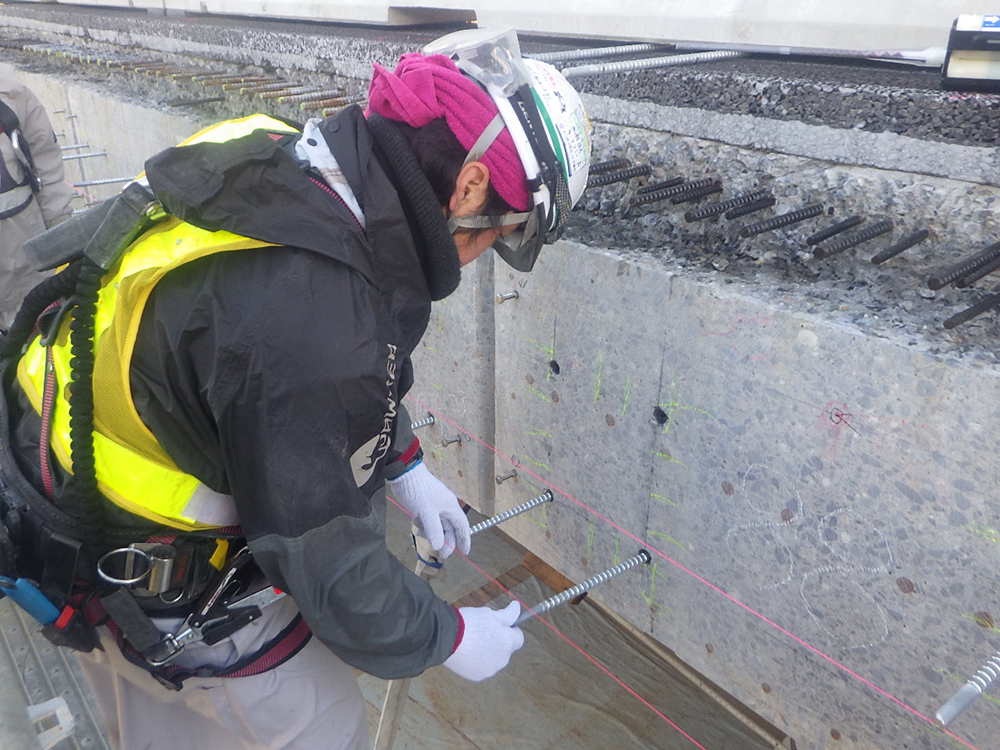 プレキャストリブの架設では、まず既設床版側に接着系アンカーをリブ1基に対して8本打設している。同アンカーは施工効率に優れるカートリッジ型の「ARケミカルセッター EX-350」(旭化成)を採用している。プレキャストリブと接続するアンカーとなるので1本ごとの打設精度が求められたが、2液混合注入タイプのアンカーであり硬化までにアンカーが規定位置から下がってしまうことが想定された。そのため、接着剤を注入後にアンカーを1本ずつ吊って固定し、規定位置に収める作業を行っている。