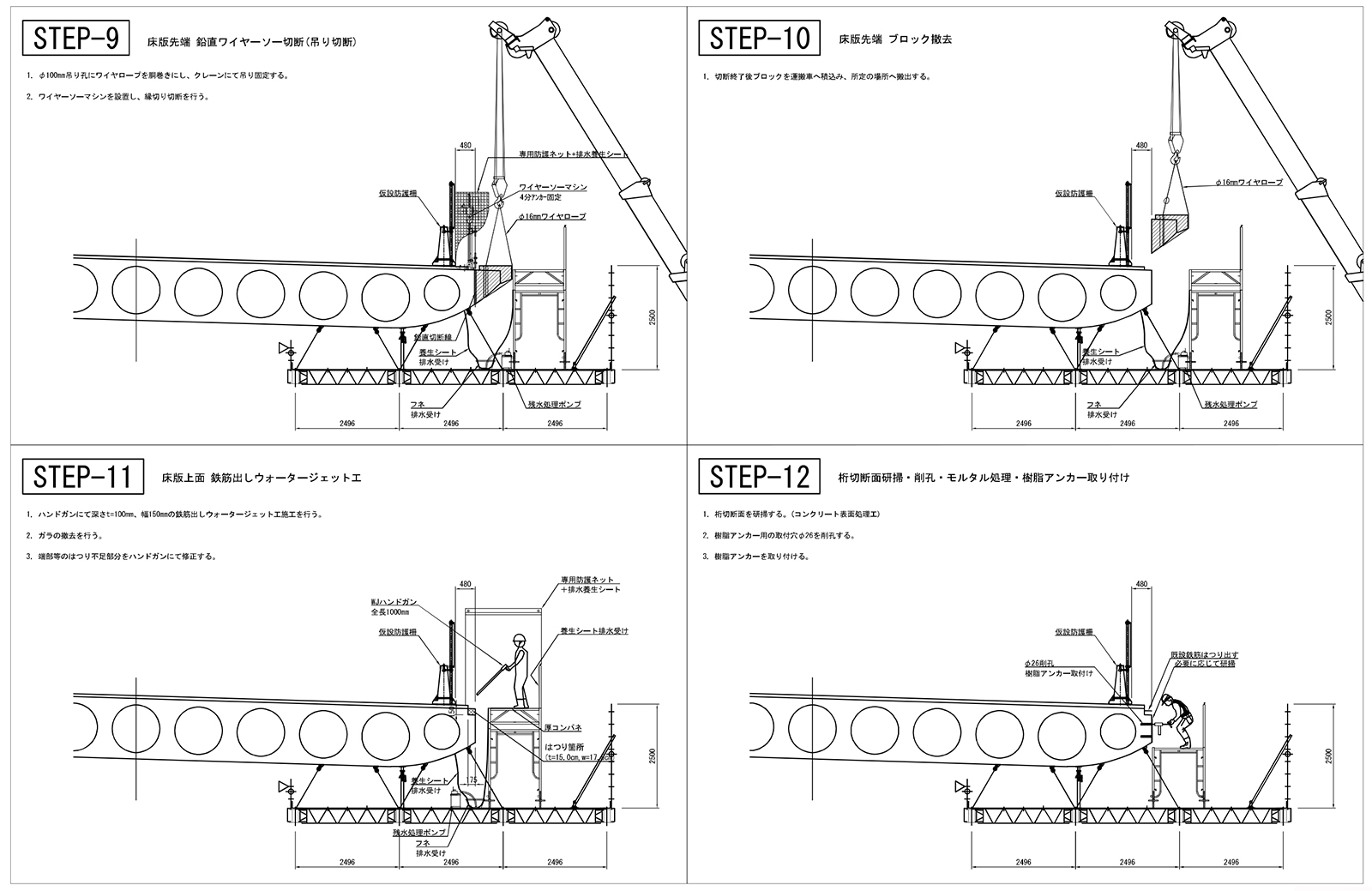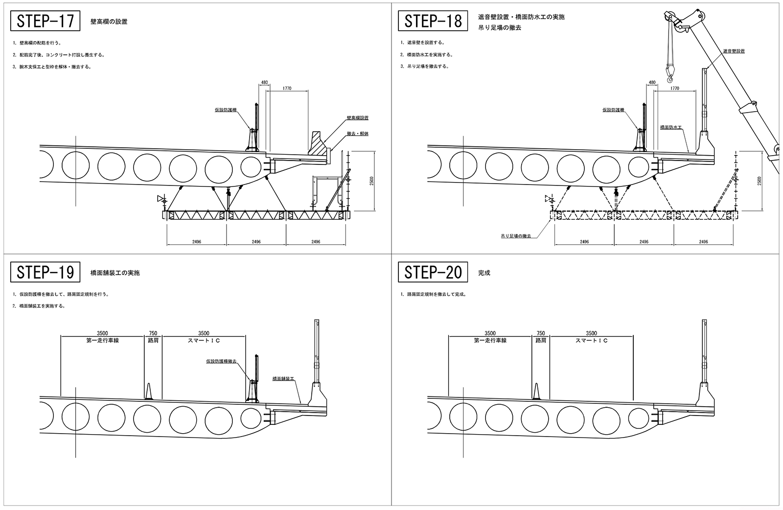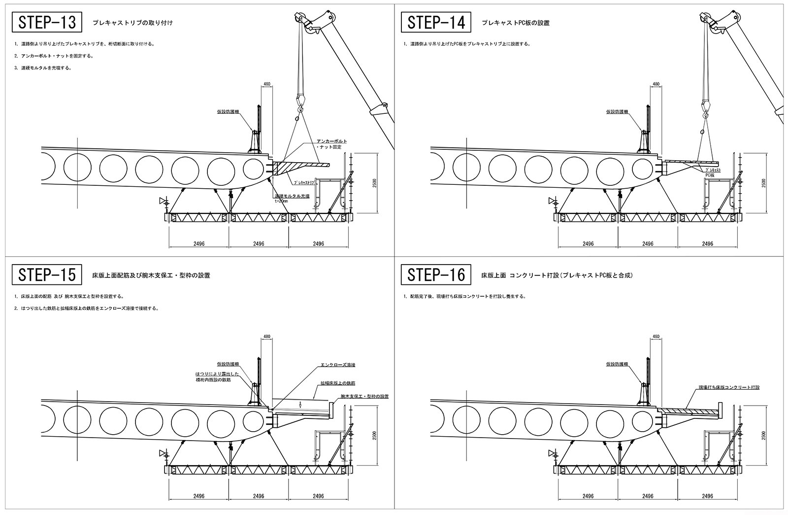 床版拡幅の主な施工ステップは、既設壁高欄撤去⇒路面切削⇒既設床版先端ブロック撤去⇒既設床版上面の鉄筋出し⇒リブ架設⇒PC板設置⇒床版上面の配筋および腕木支保工・型枠設置⇒コンクリート打設⇒新設壁高欄の設置⇒防水工・舗装工となっている。