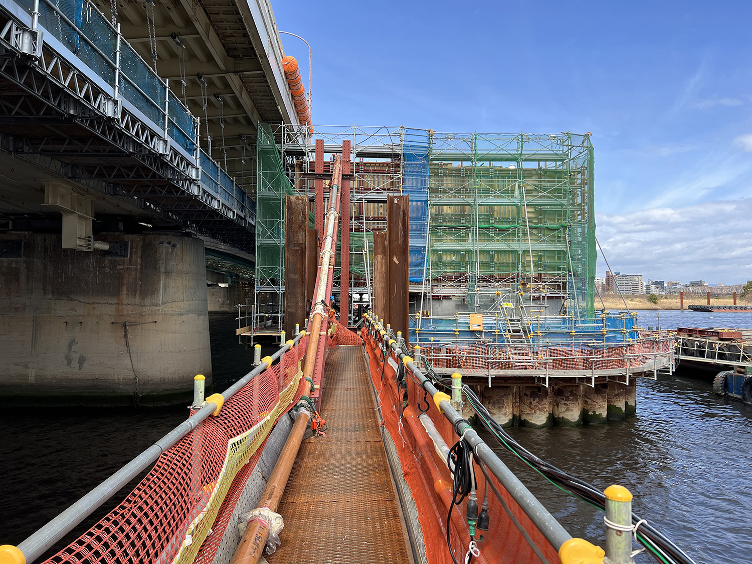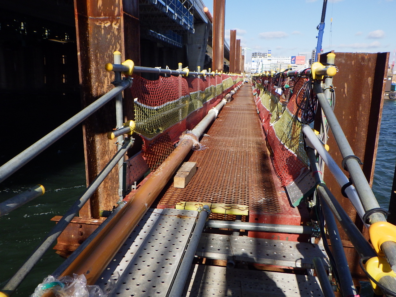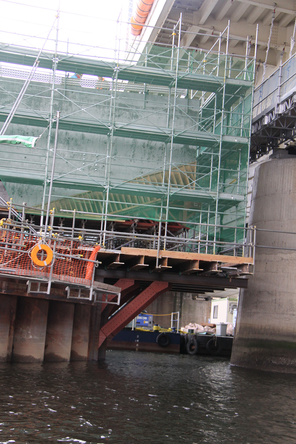 設桁やブラケット、足場の撤去は既設の新御堂筋線新淀川大橋から最小0.65m、最大でも1.5mしか離れていない狭隘箇所での施工が求められた。そのため、クレーン付台船により横から資材を抜く形で解体していった。
