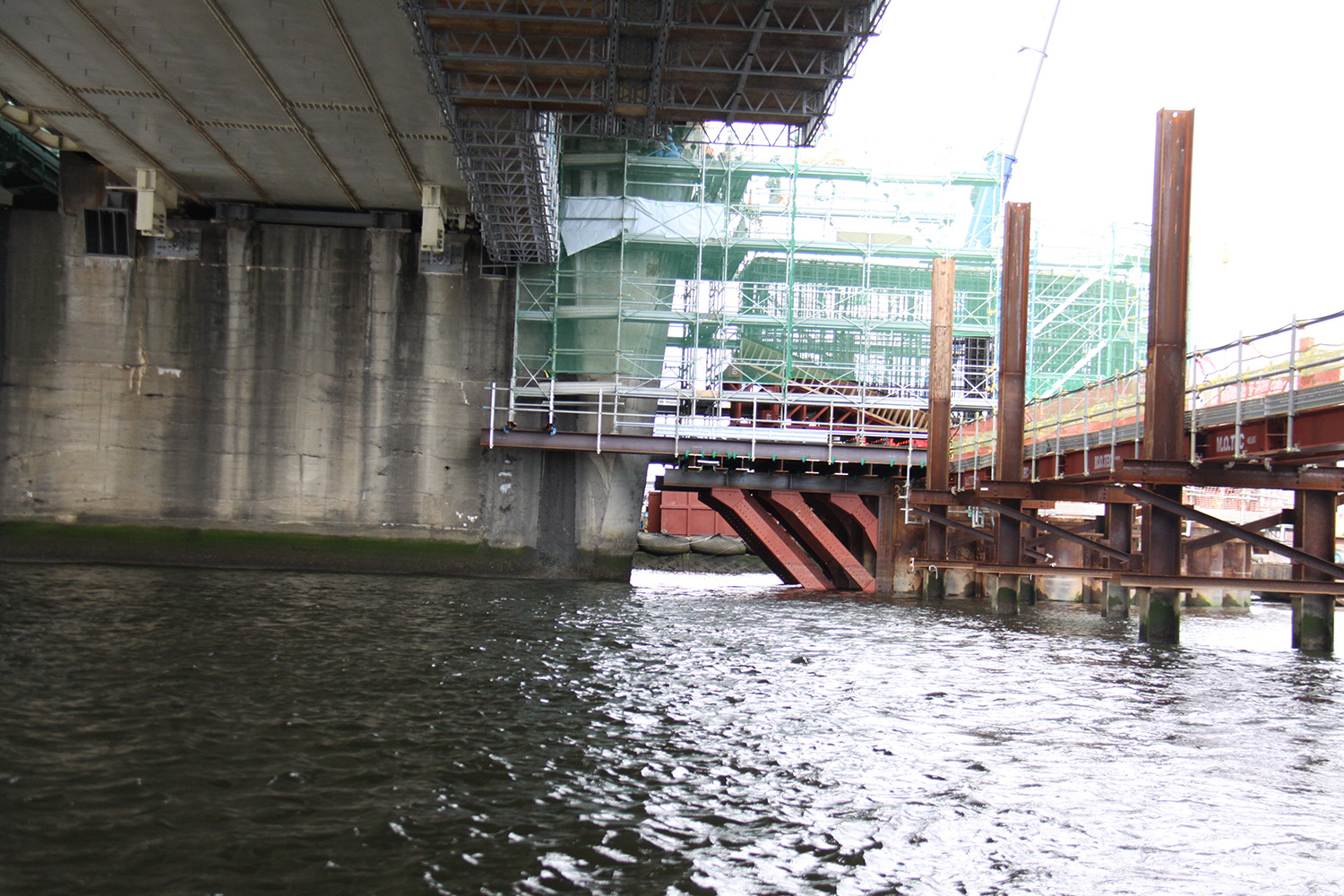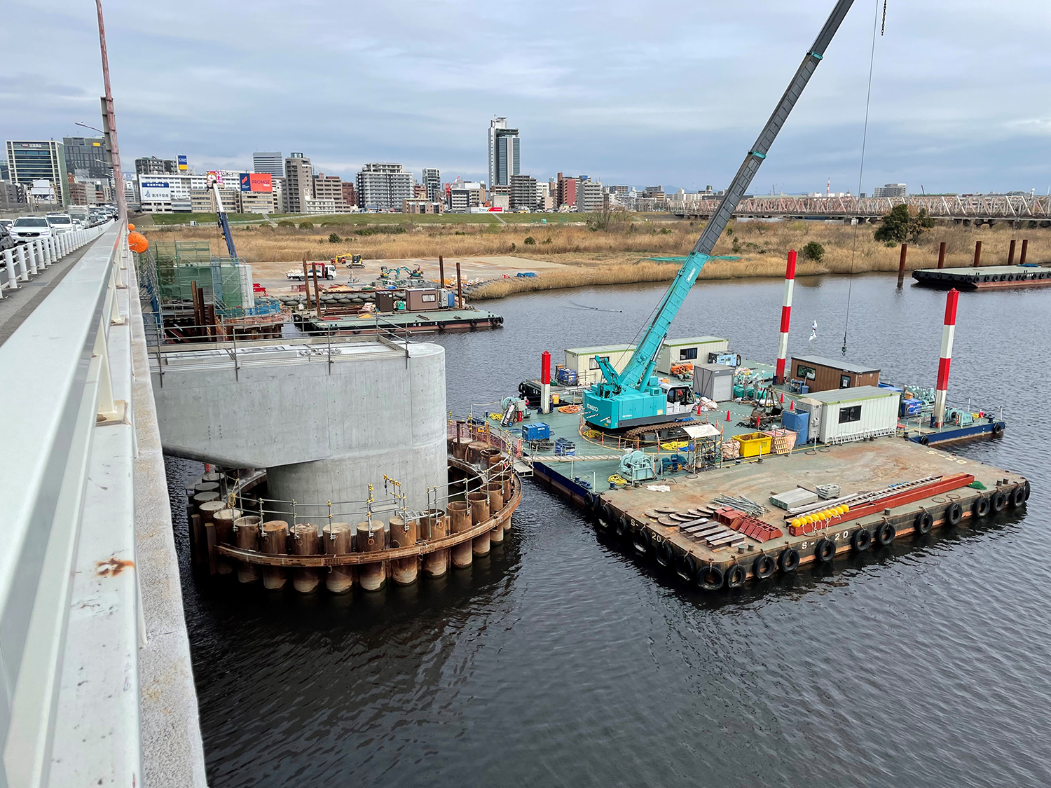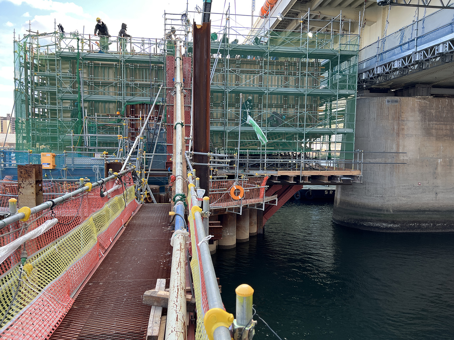 設桁やブラケット、足場の撤去は既設の新御堂筋線新淀川大橋から最小0.65m、最大でも1.5mしか離れていない狭隘箇所での施工が求められた。そのため、クレーン付台船により横から資材を抜く形で解体していった。
