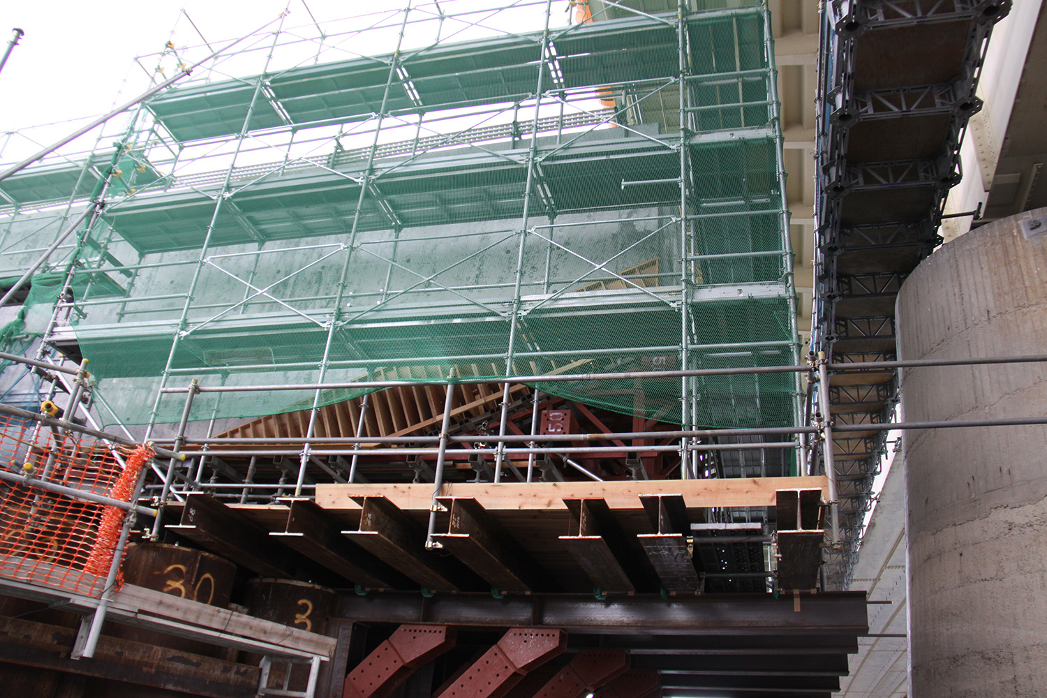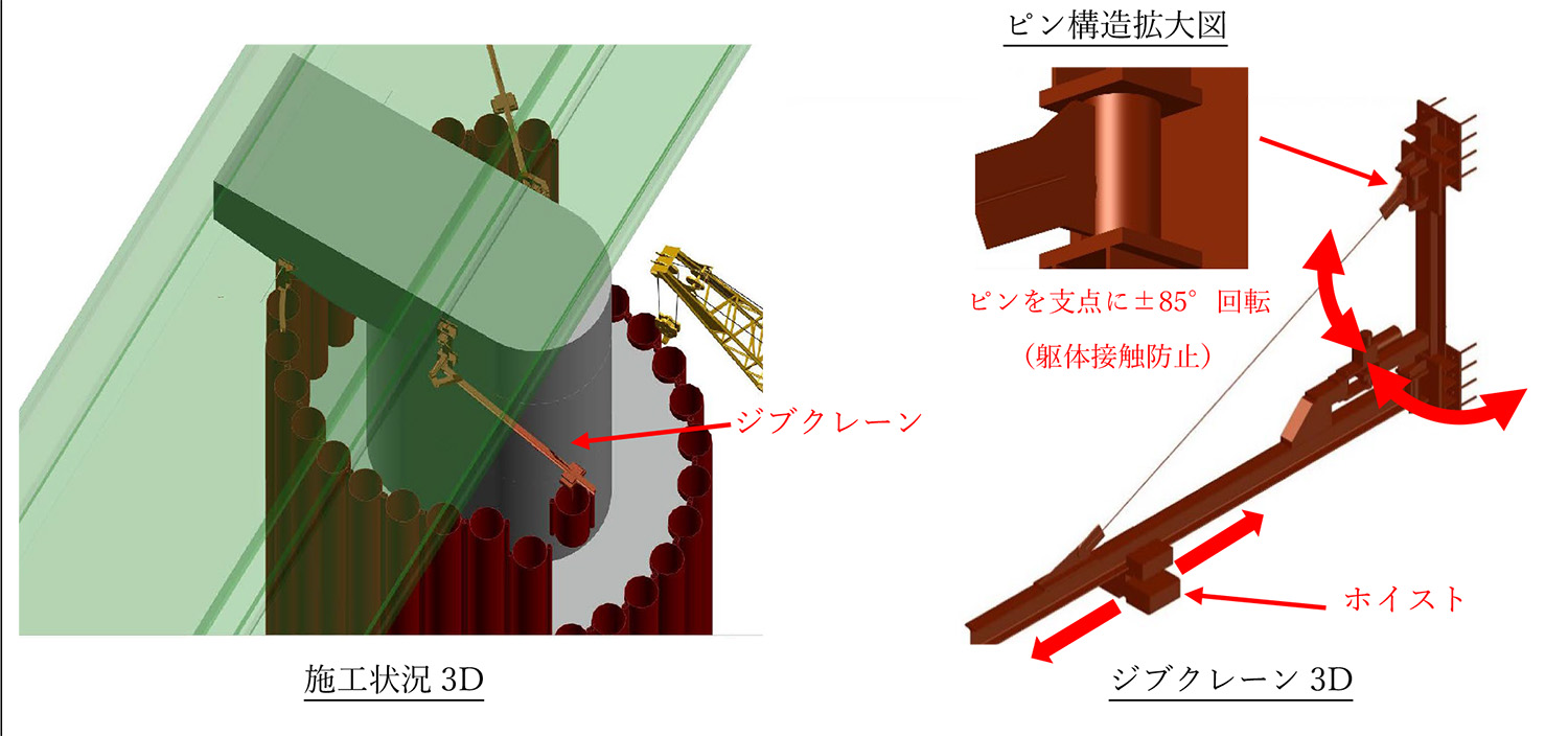 そのため、梁下部にローヘッドホイストクレーンを設置し、空頭制限が厳しい鋼管矢板を撤去する工法を考案した。ローヘッドホイストクレーン設置のためには、可動用のレールが必要となるが、梁コンクリート打設前に可動レールを支持するためのアンカーボルトを梁側面に仕込んでおくことで対応した。