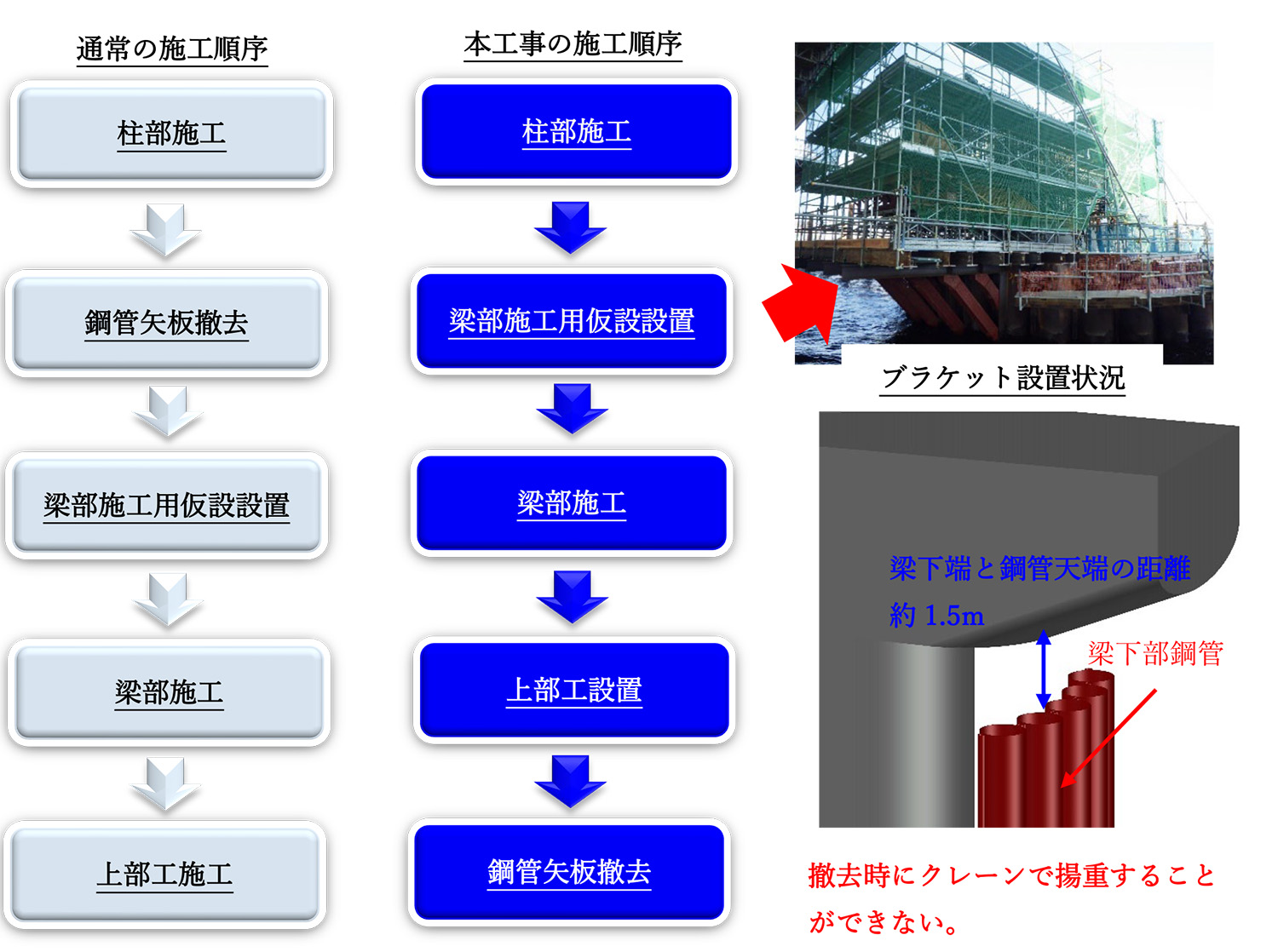 鋼管矢板の撤去は、台船上のクレーンにて切断機をまず鋼管矢板内部に吊り込み、内側から杭を切断し、その後バイブロハンマにて引抜く方法が一般的である。ここで問題となるのは橋脚梁下部の5本の鋼管矢板の撤去である(下図)。鋼管矢板天端から梁下端までの離隔が約1.5mしかなく、空頭制限により切断機の挿入と引抜き作業ができないのだ。