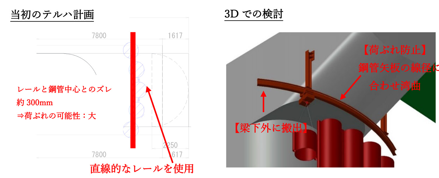 可動レールは当初、直線のものを検討していたが、レールと鋼管矢板の中心とのずれが最大で約300mmに達し、荷ぶれする可能性があることから、3Dモデリングを用いて検討し、レールを鋼管矢板の位置に合わせて湾曲させた(上図)。