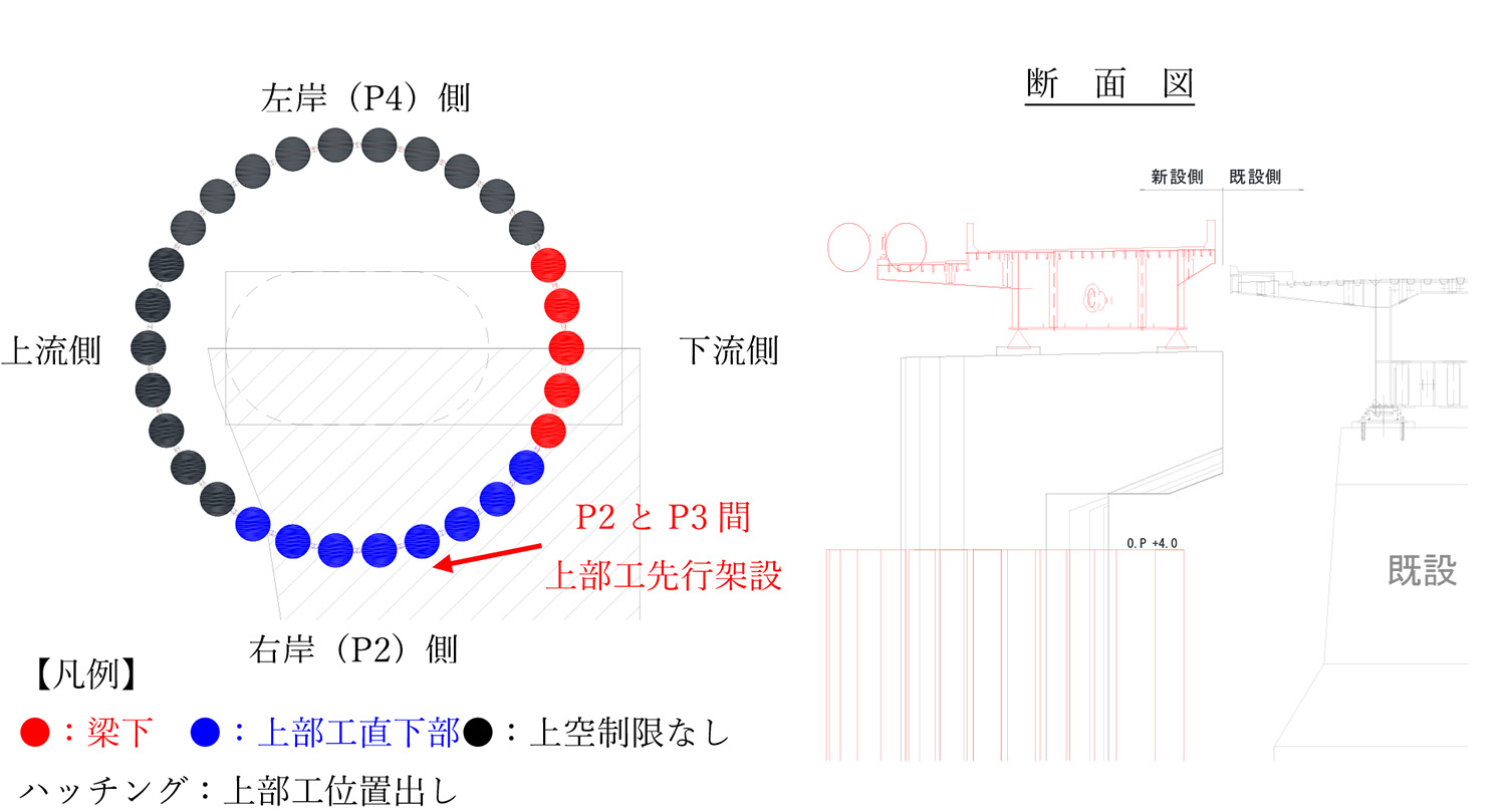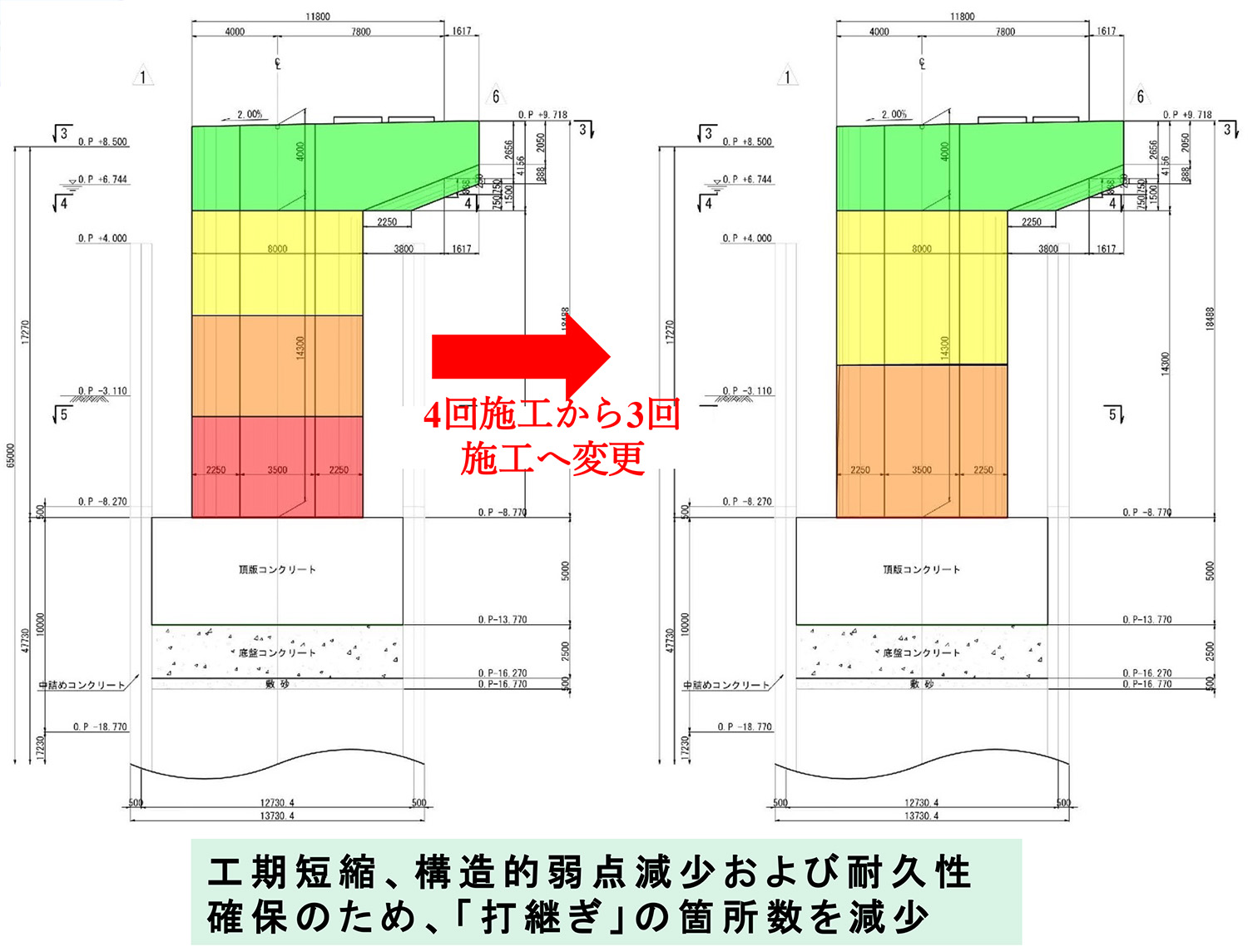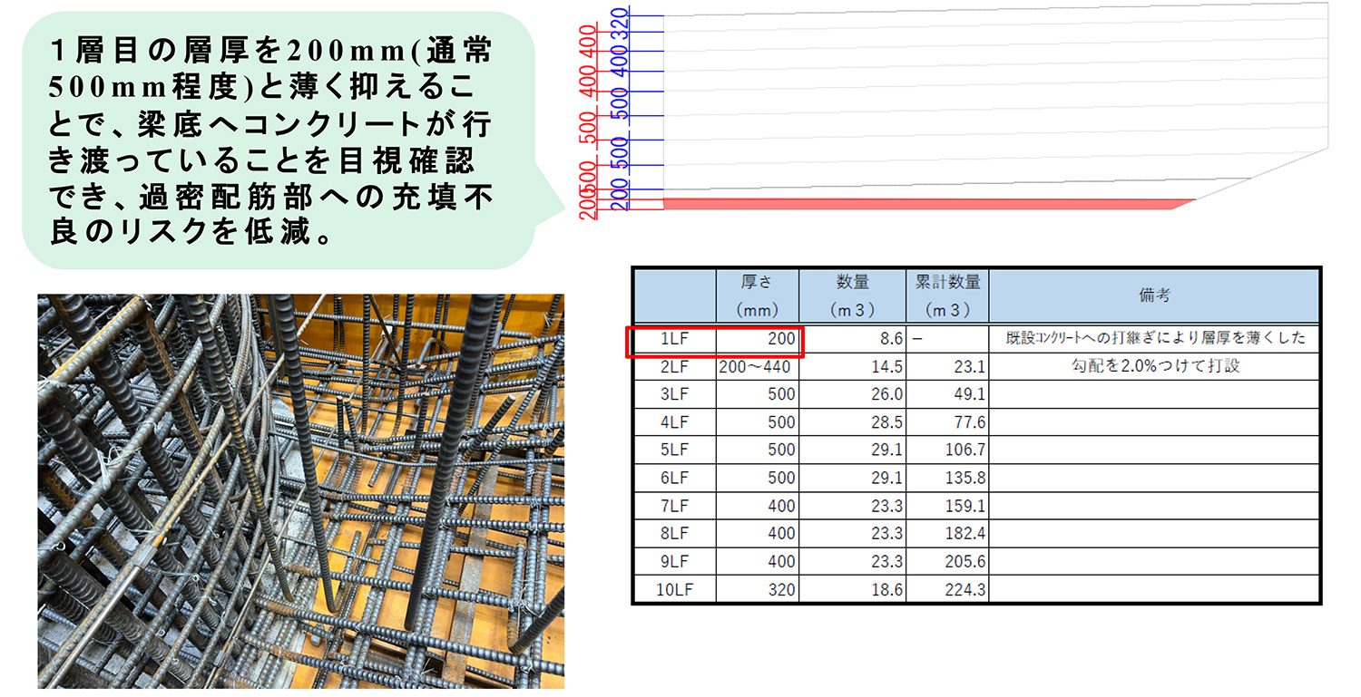 本工事におけるコンクリート打設の大きな特徴は、当初の4回打ちを3回打ちに変え、工期を半月も短縮したことである。これは「下部工を早く完了させないと、2023年度渇水期の鋼桁架設に間に合わないからである。但し、リフト数を減らすことで打ち継ぎが減り、品質が向上する」(坂井氏)というメリットもある。