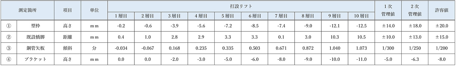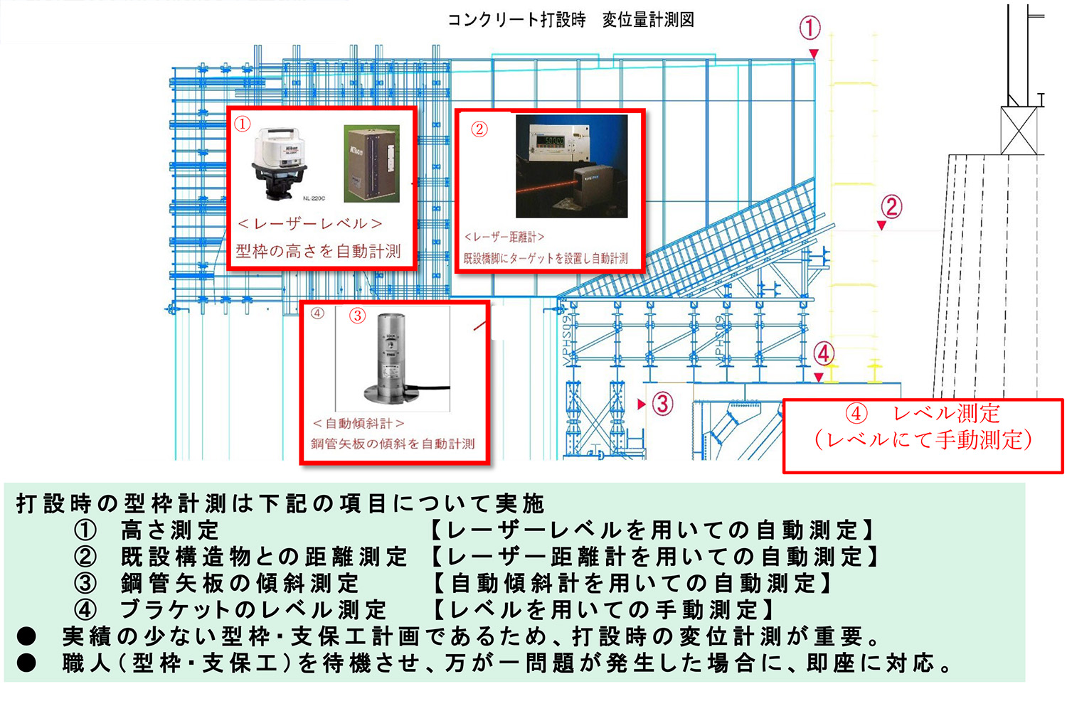 コンクリート打設時には、型枠・支保工の異常変位や崩壊を防ぐため、レーザーレベルやレーザー距離計、光波を使用して、型枠・支保工の変位と沈下量の計測管理を実施した(下図参照)。