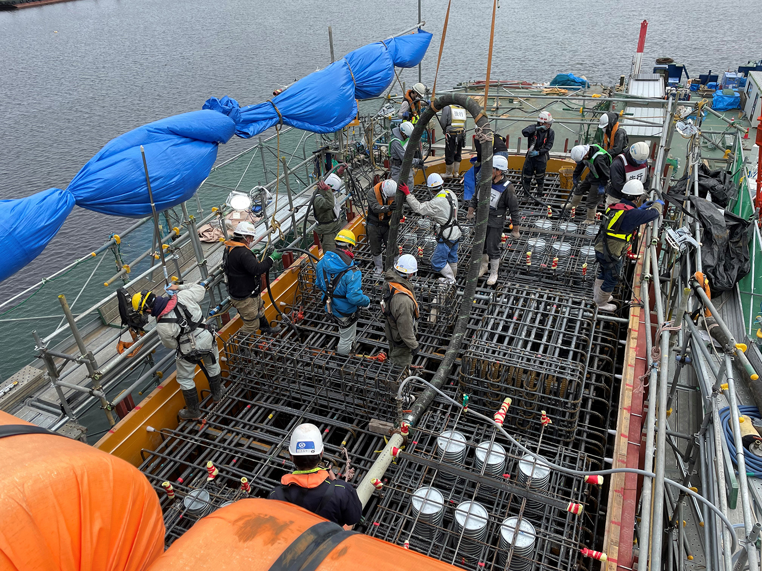 打設高は1回当たり50cmを標準とし、1橋脚辺り20人以上の人員をつぎ込んで施工にあたった。