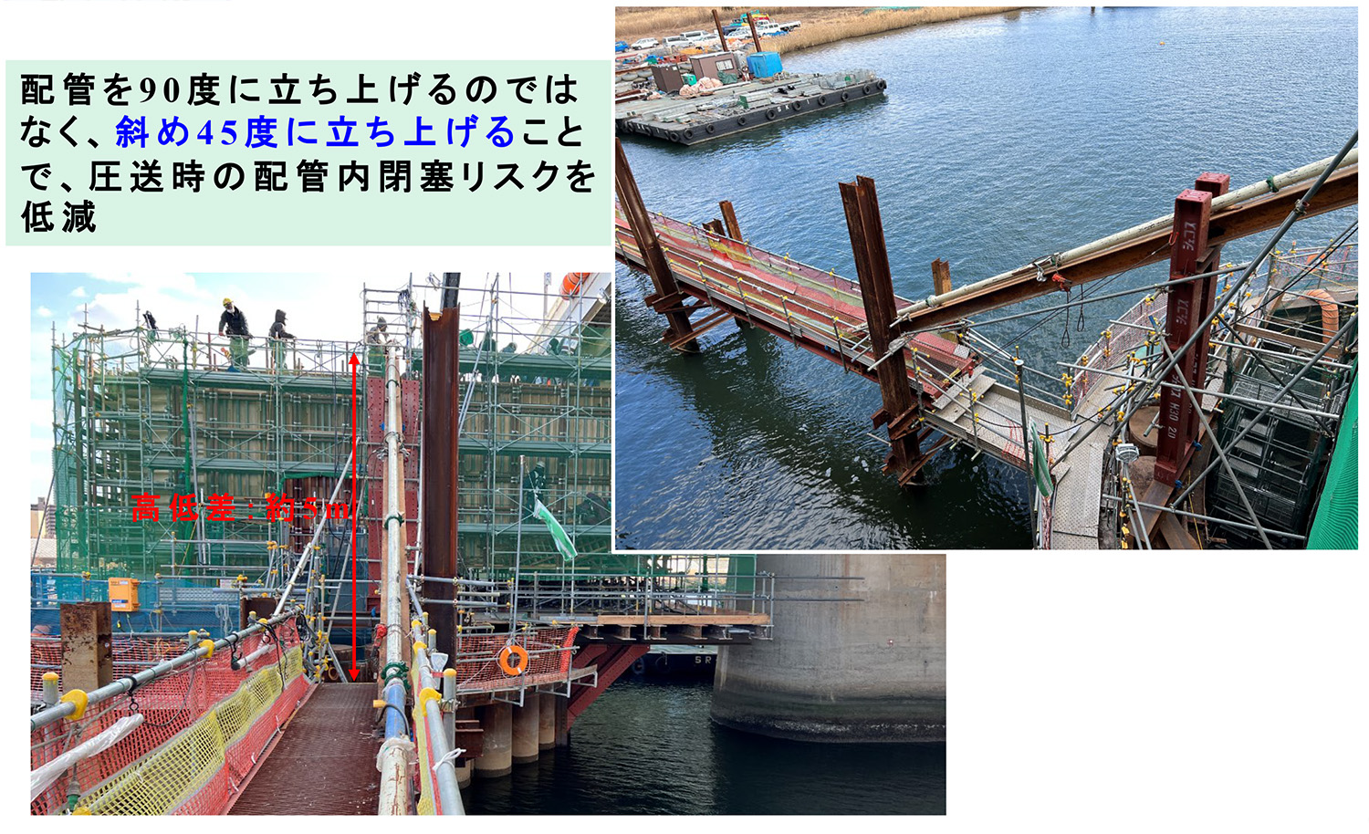 コンクリート圧送距離は最大で150mにおよぶ。河岸からの距離が近いP1はポンプ車ブームで直打ちするが、河岸からの距離が遠いP3は配管車+配管橋による配管を約30m、P2に至ってはP1を経由して配管橋を120m伸ばした上で打設している。生コン投入は全て特注ホッパーにサニーホースを接続して吊るし打ちを行い、高周波フレキを用いてバイビングする手法で打設した。取り分けP2梁については圧送距離が長く、打設箇所への高低差が大きい条件であったが、45°配管の使用による工夫を施した結果、閉塞することなくスムーズな圧送を実現した(下図参照)。