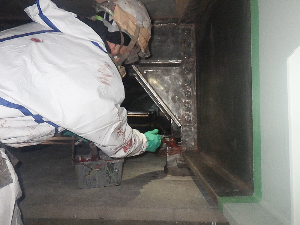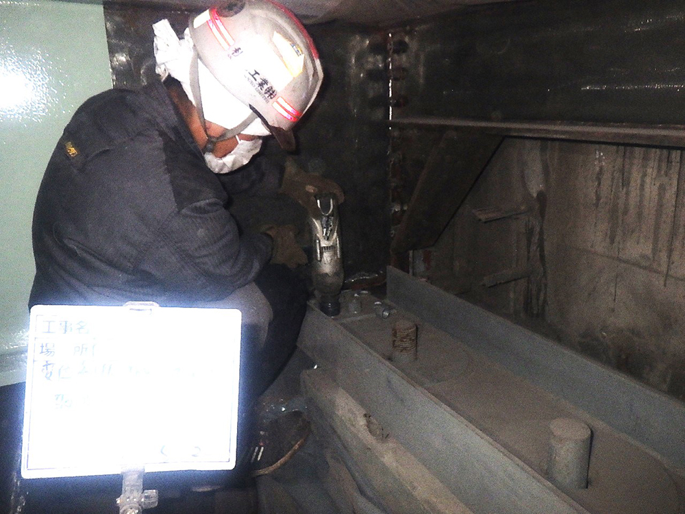 また、端部と支点部の塗装は変位制限装置撤去箇所にあたり、他の箇所とは別工程(錆転換型)となったが、塗膜剥離作業は撤去箇所も可能なところは完了させて、一部を撤去後に行った。