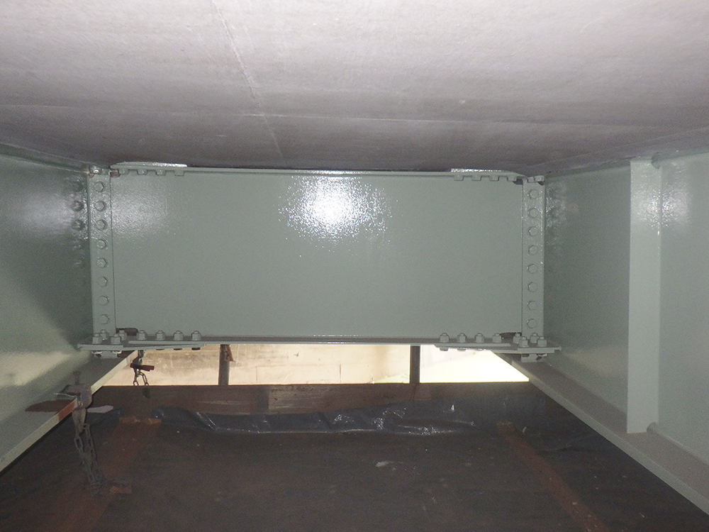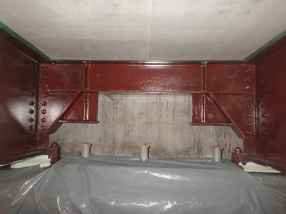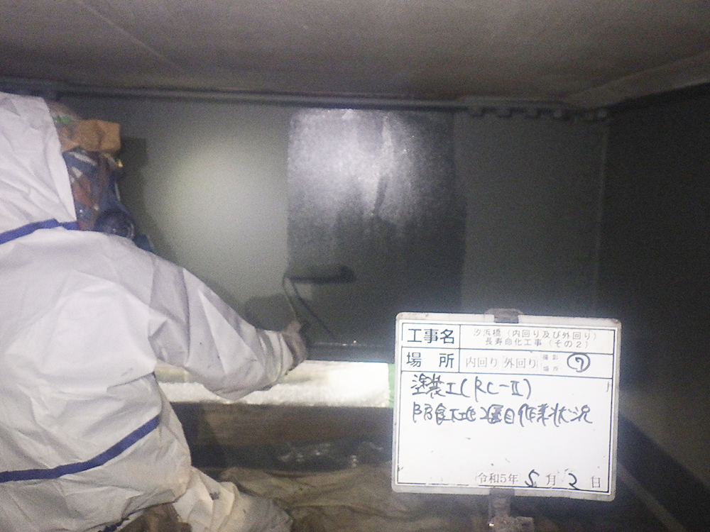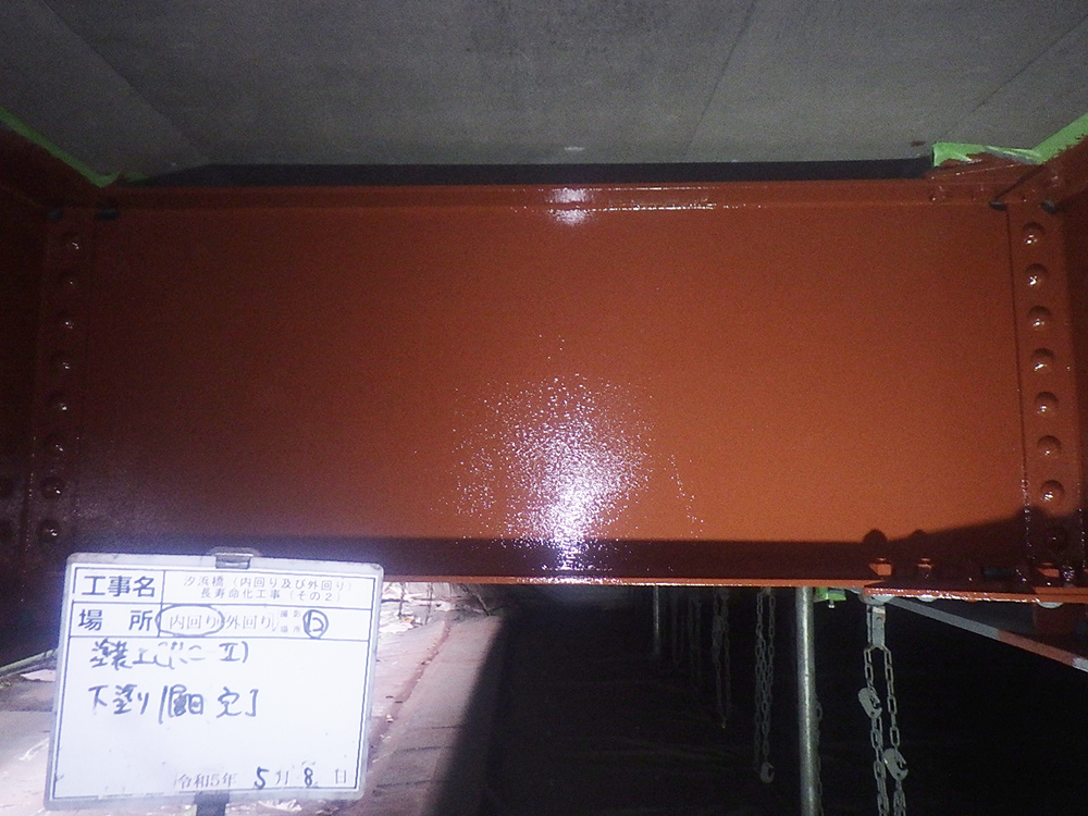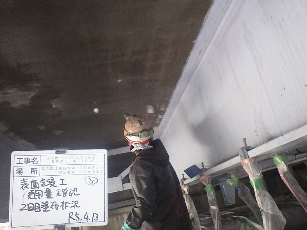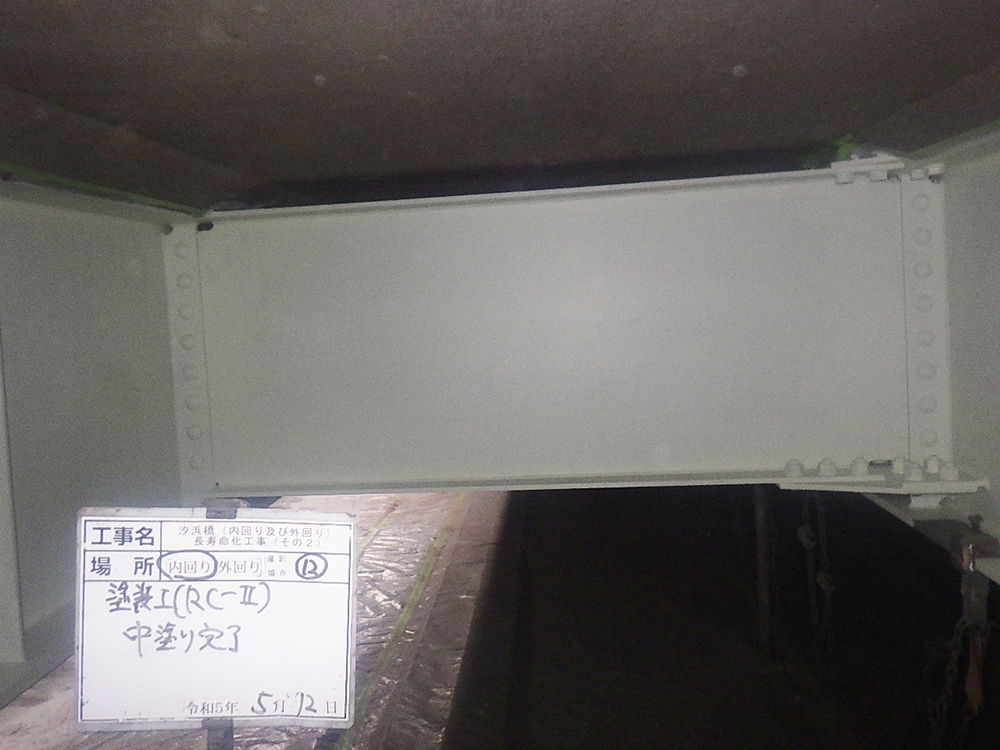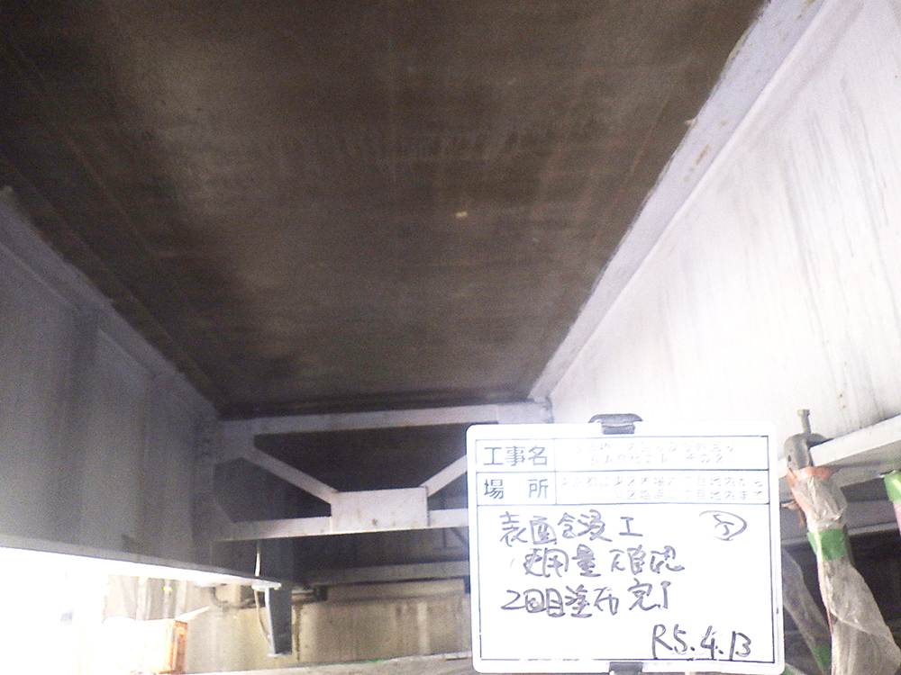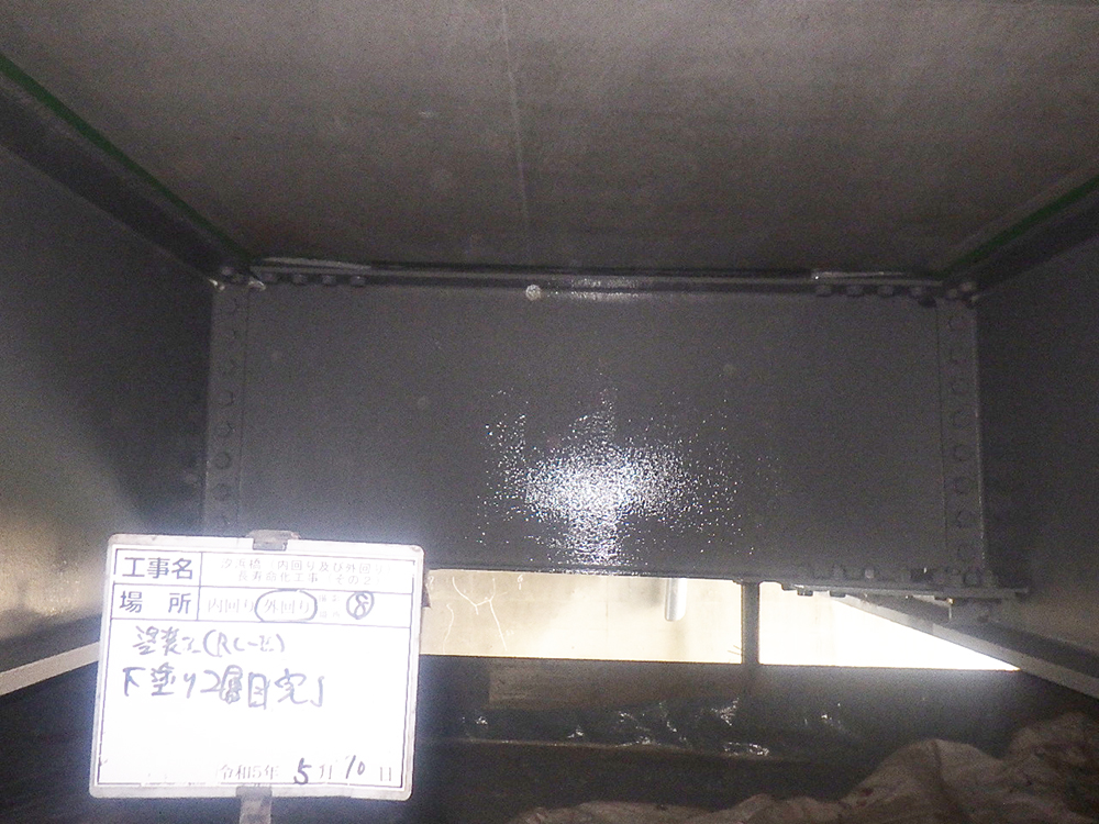 塗装(Rc-Ⅱ塗装系)は、有機ジンクリッチペイント(下塗り1層)を塗布(75μm)し、さらに下塗り2層(弱溶性編変性エポキシ樹脂塗料、各60μm)、中塗り(弱溶剤形ふっ素樹脂用中塗、30μm)、上塗り(同上塗、25μm)を塗布していく(特殊部も同様)。合計膜厚は250μmとなる。施工は5人/1班×2班体制で1日1層、合計12日間で完了した。塗料は大日本塗料製を採用した。