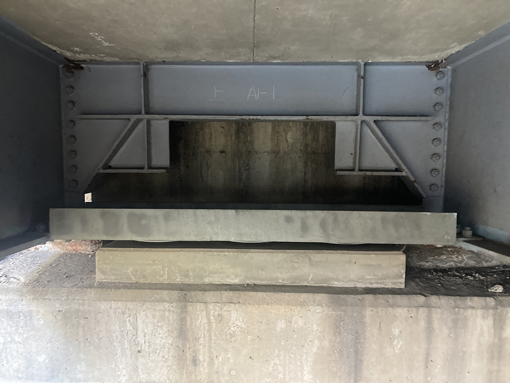 本工事で最大の課題となったのは、橋台部と橋脚部に変位制限装置が設置されていたことだ。塗装工や沓座モルタル打替え工、表面被覆工などを実施する際にそれらが支障となることから、一時的に撤去して施工後に再設置をしなければならなかった。当初計画段階では、上記のような多岐にわたる工種を施工するには約3カ月の撤去期間が想定された。しかし、撤去期間が長くなれば、地震などの災害発生リスクも大きくなるので、その期間をなるべく短縮することが求められたのである。