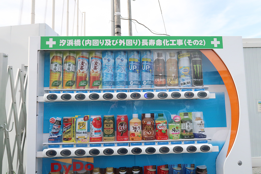 熱中症対策では、こまめな休憩を設けるとともに、現場詰所にある自動販売機で水とスポーツドリンクを制限なく入手できるように作業員に専用コインを渡す取り組みも行っている。