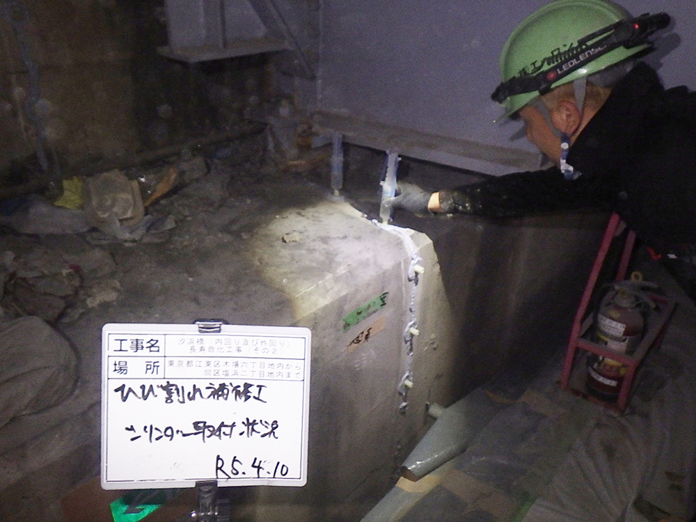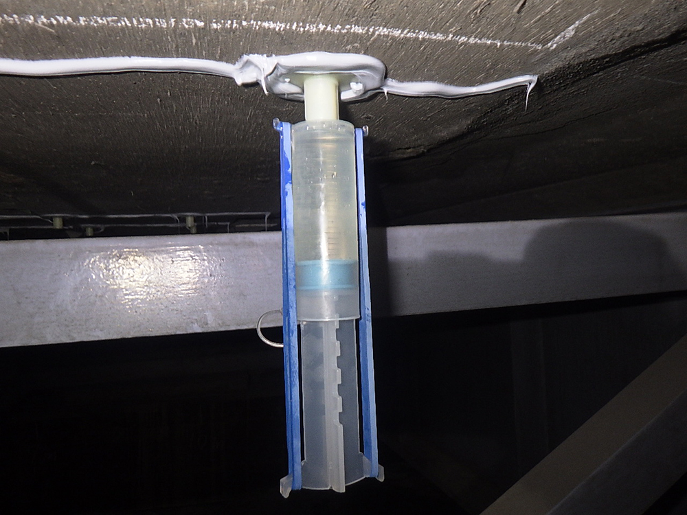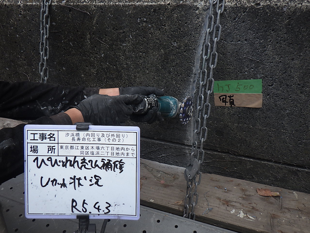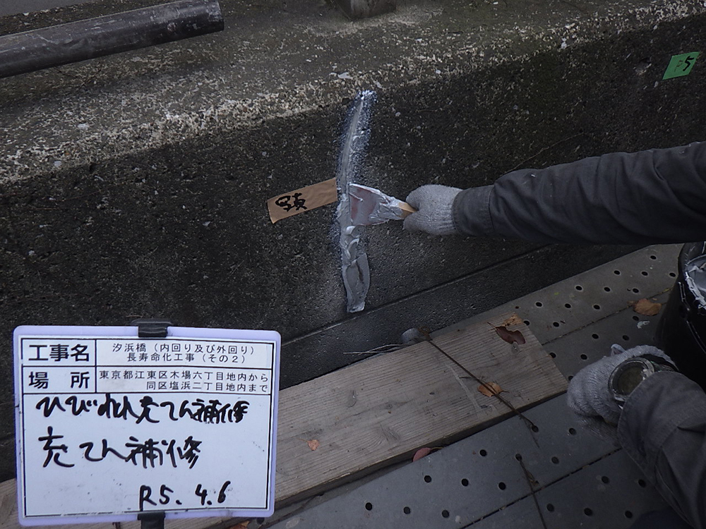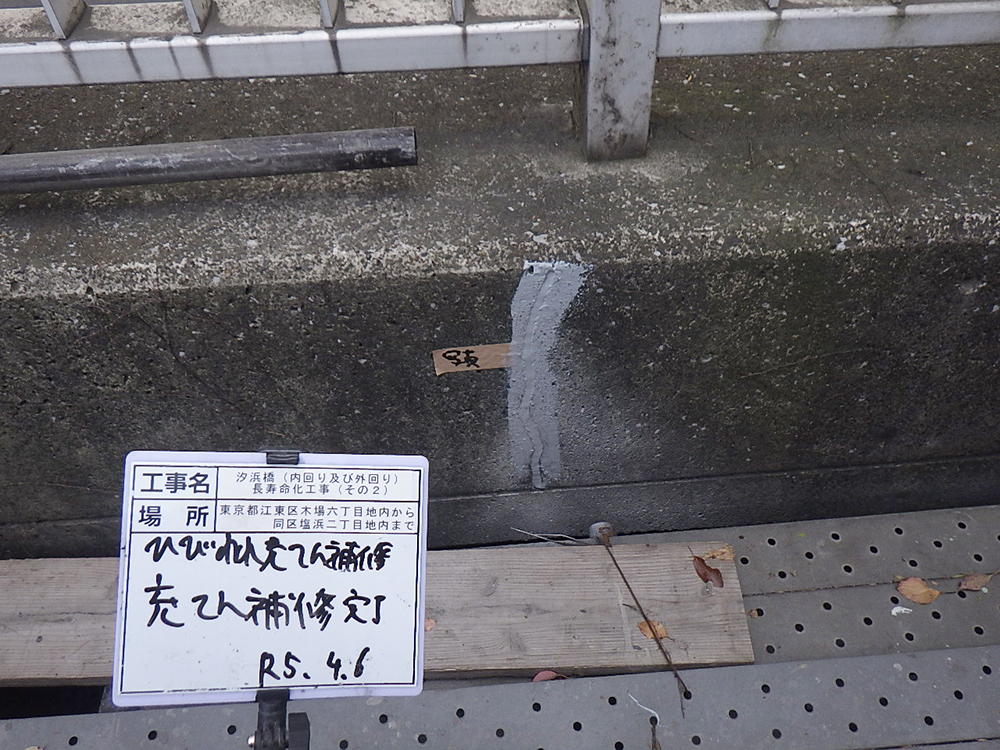 ひび割れ対策では、主に床版下面の遊離石灰が析出したひび割れに対して幅0.2mm~1.0mmでは注入工(95m)、幅1.0mm以上では充填工(24m)を行う。注入材は低粘土形エポキシ樹脂接着剤「ボンドE206」(コニシ)を、充填材はパテ状可とう性エポキシ樹脂「ボンドE600」(同)を採用している。