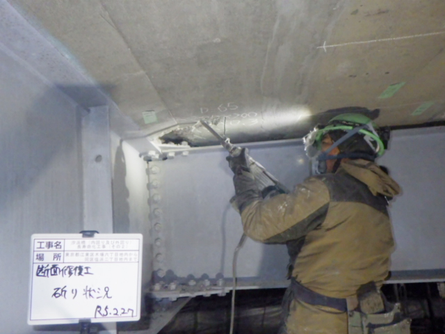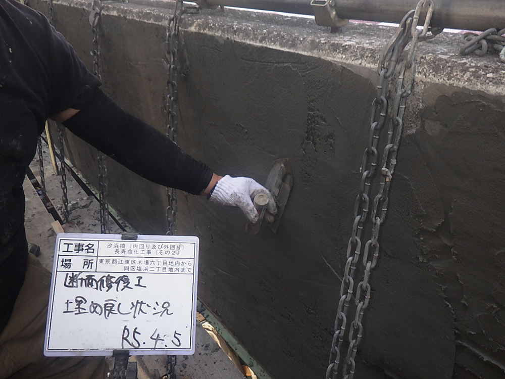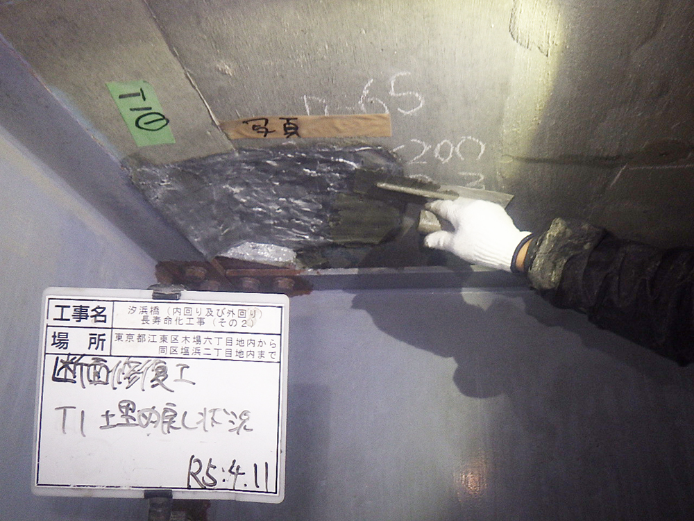 断面修復は、床版下面、高欄、橋脚の鉄筋露出箇所の補修を目的として、合計2.5㎡(2023年3月末時点)に左官工法でコンクリート補修用セメント系断面修復材を充填している。