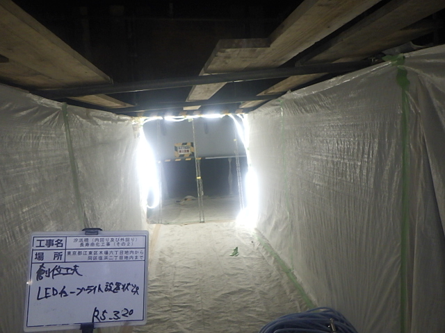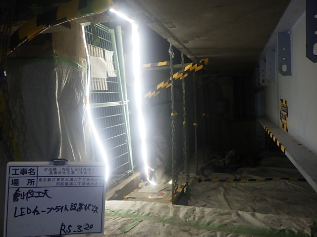 災害時および緊急事態時の対策では、足場内部から外部に避難する際に非常口がひと目で分かるように非常口にLEDチューブライトを設置して、視認性を高めた。また、万が一の火災に備えて、足場内には無線型火災報知器(煙式・熱式)を設置。報知器は連動式で火災発生時にはすべての報知器が一斉に鳴って作業者に避難を促すことができるようにした。