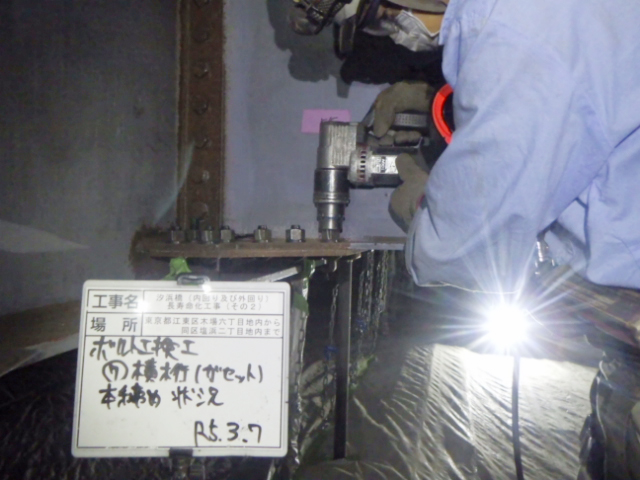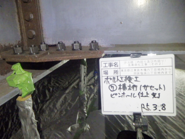 高力ボルト交換工はF11Tボルトの遅れ破壊対策として実施している。ボルトの破断は確認されていないが、ボルト先端が床版内に埋められている上フランジ添接部以外の内回りのF11T全数である1,392本を交換した。外回りについてはF10Tボルトが採用されていることから、交換対象外となった。