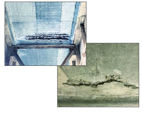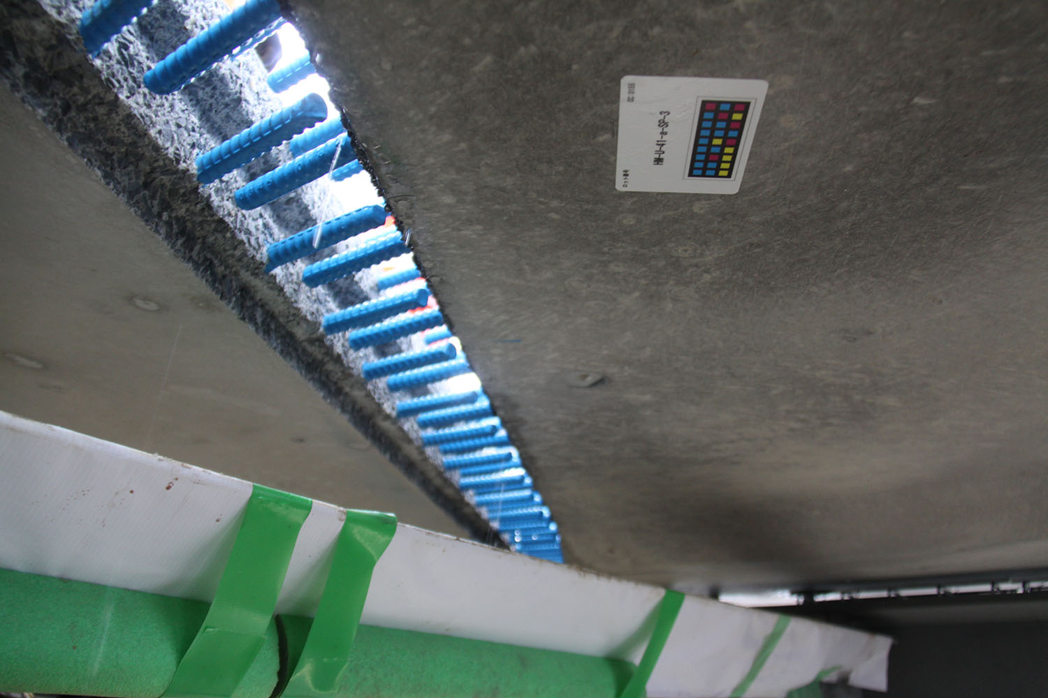 同橋は上下線とも1973年に供用された橋梁であり、上下線のRC床版とも下面は被りコンクリートが剥離して鉄筋が露出、一部鉄筋が腐食膨張によってコンクリート爆裂が生じている状態であり、床版上面も被りコンクリートが薄く、下面同様の損傷が生じている他、一部土砂化も進んでいる状況にある。交通量が多く、大型車混入率も相当数に上ることや床版防水を長期間設置していない状況から、疲労や浸水による損傷が生じていることは想像に難くない。構造物内の塩分濃度も高く鉄筋近傍の塩化物イオン濃度は1.77kg/m3と発錆限界値(1.2kg/m3)を超える量が検出された。同橋のパネル損傷率は床版取替の目安となる40%を超えたことから、今回床版取替を選択するに至った。床版取替面積は上下線合計約4,800㎡である。
