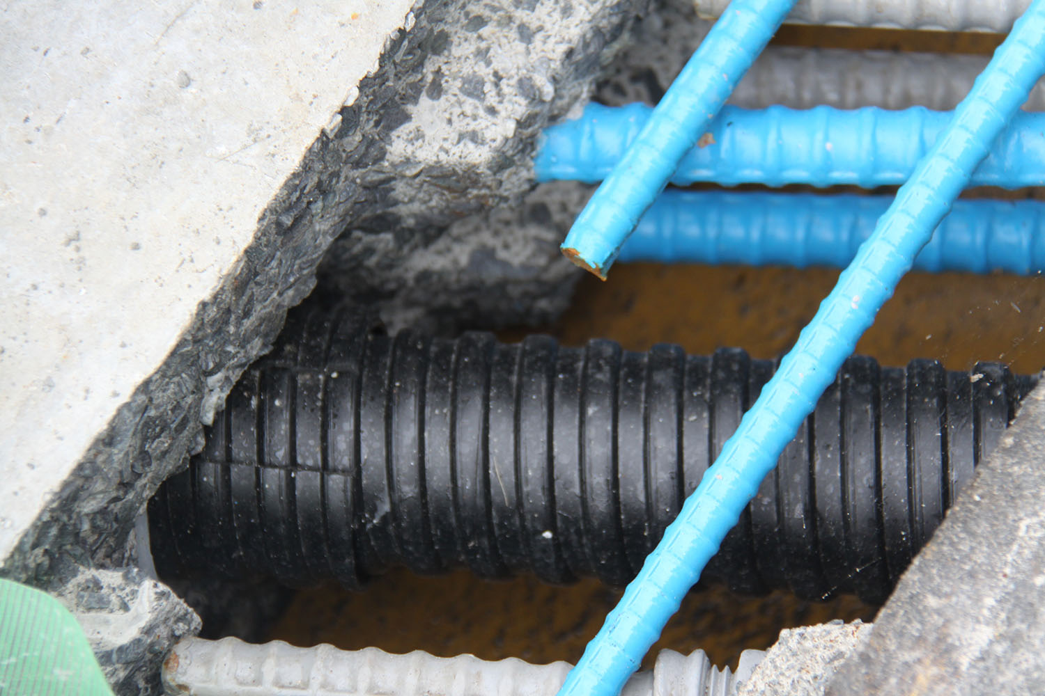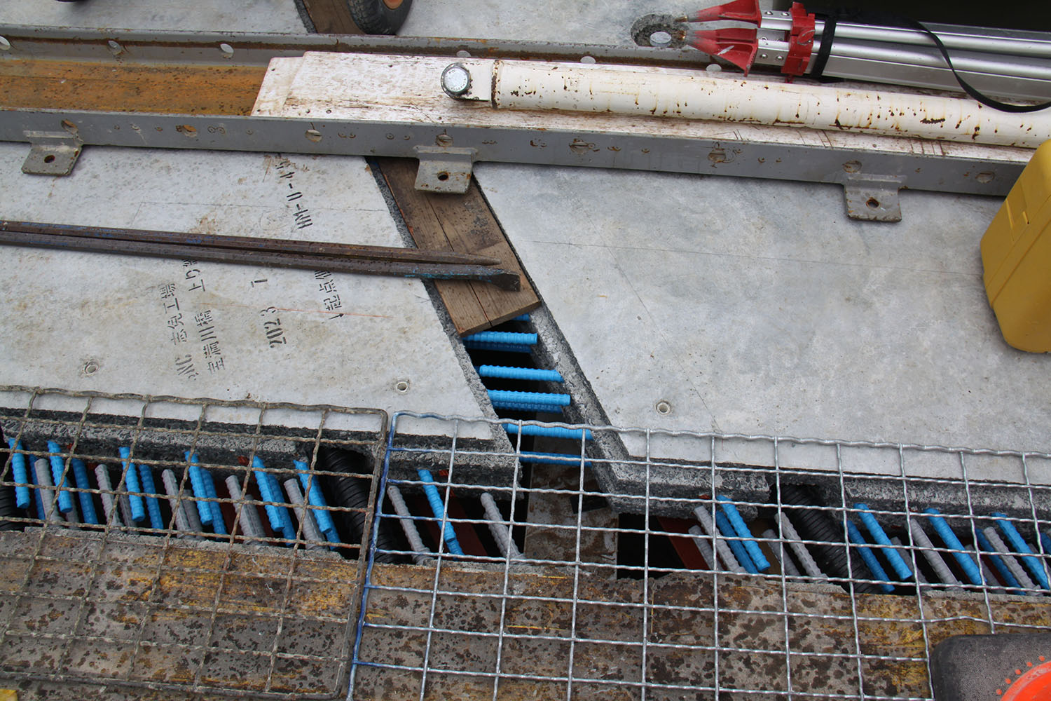 3分割施工のため、今次現場では横締めPC鋼材を一列につき3本配置している。縦目地部は横目地部に用いる超高強度繊維補強コンクリートで十分対応可能だが、間詰部付近でもひび割れを許容しないため横締めPC鋼材を配置したという事である。但し床版架設時には従来、シース継手同士の雄雌のカップラーが施工上の邪魔になっていたが、それを回避するため、本現場のパネルは架設時はジョイントシースをパネル内に格納し、架設後にそれを引き出して隣り合う床版内のシースと接続する構造としている。