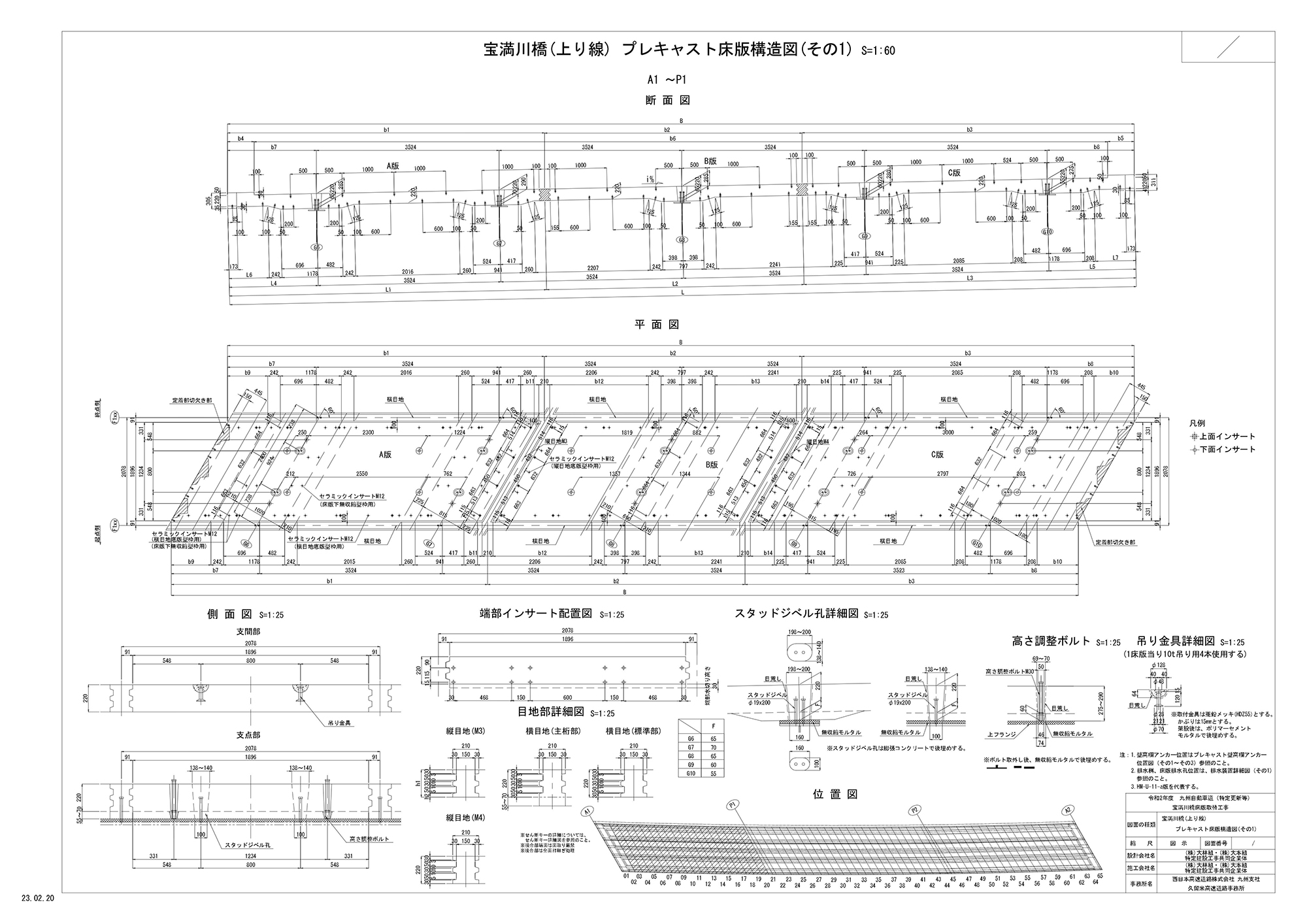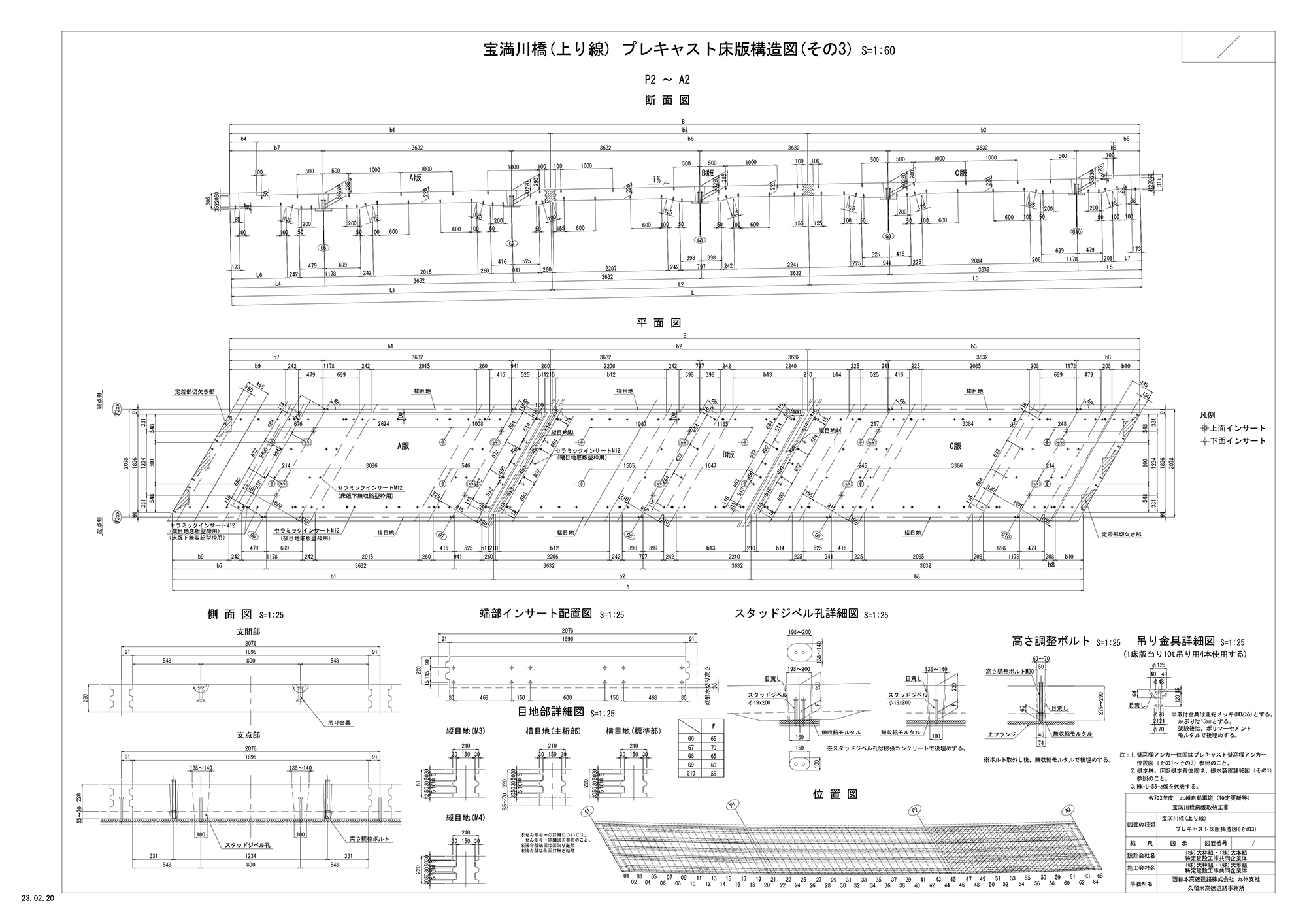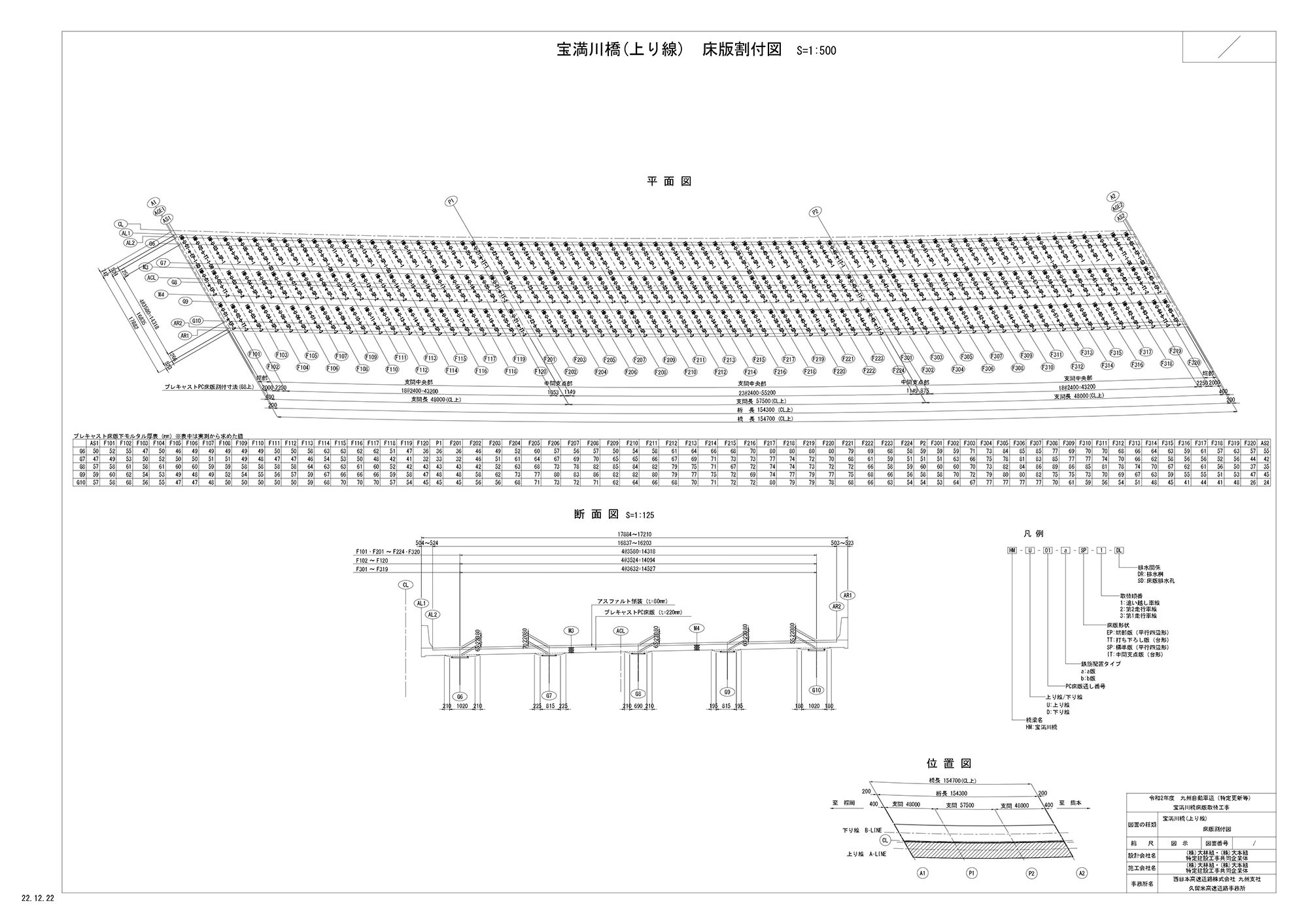 西日本高速道路九州支社は、九州縦貫道鳥栖JCT~久留米IC間の宝満川渡河部にある宝満川橋上下線の大規模リニューアル工事を進めている。同橋は上下線とも1973年に1964年鋼道路橋設計示方書に準じて設計された橋長154.7m、有効幅員14.5mの鋼3径間連続5主鈑桁橋で、支間長はいずれも48.0+57.5+48.0mである。横断勾配は2%、縦断勾配は-0.11%~0.16%、斜角は60°と非常にきつい。また直下の宝満川はH.W.Lが非常に高く桁下10cmに迫るほどの河川である。上下線とも一日交通量は約35,000台超、断面交通量7万台を超える重交通路線であり、大型車混入率も非常に高くなっている。既設床版は210mm厚のRC床版で、当初は防水工を施工しておらず、防水工を設置したのは、供用から実に四半世紀以上が過ぎた2000年12月(上り線)、2001年12月(下り線)であった。これを220mm厚のプレキャストPC床版に取り替える。施工にあたっては重交通であることを考慮して片側3車線中、2車線を確保しながら3断面に分割して施工する手法を採用している。縦横目地とも間詰め材に超高強度繊維補強コンクリートを採用しているが、縦目地部については1パネルにつき3本のポストテンション方式の横締めPC鋼材も併用している。その現場を取材した。(井手迫瑞樹)