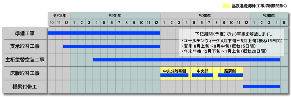 床版取替上の課題となったのが、その立地条件と交通量である。同橋は宝満川渡河部にあり付近に断面交通量70,000台を超える交通量を転換できる迂回路は無い。そのため、交通影響を如何に最小限に抑えつつ、床版取替を行うかが課題となった。その結果、採用されたのが3断面に分割した床版取替工法と、それに応じた道路規制の導入である。