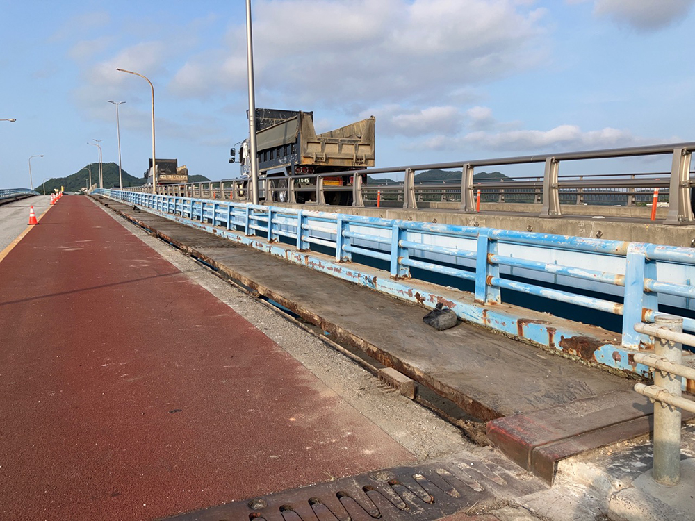 歩道・地覆部改造工は4車線化対応のために行う。現況では海側と陸側の両方に歩道があるが、4車線化により陸側(新本部大橋側)の歩道は不要になることから地覆化して中央分離帯とし、海側は歩道を若干拡幅するために歩道と地覆を再構築する。