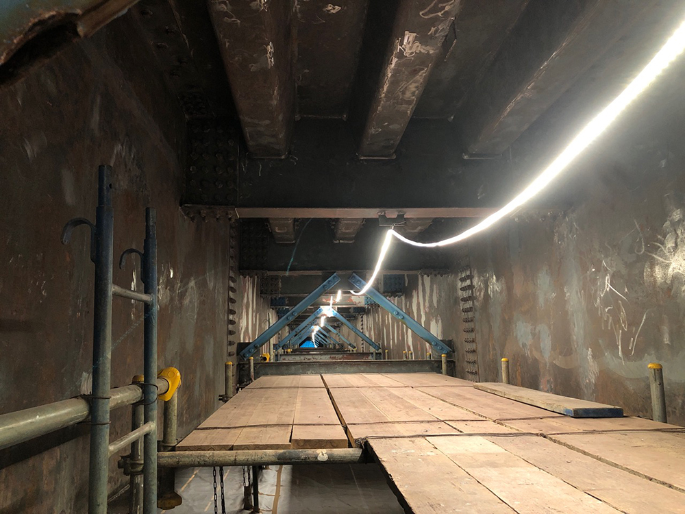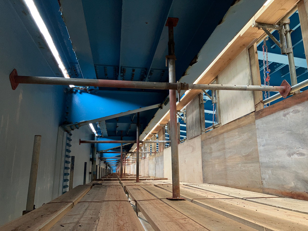 本工事では足場設置後の詳細調査で、下フランジエッジ部の孔食や対傾構とブラケットの著しい損傷、F11Tの腐食の進展などが新たに確認され、その対策検討が必要となった。その結果、工程が後ろ倒しとなり、2024年2月20日までの予定だった工期を延長せざるを得なかった。