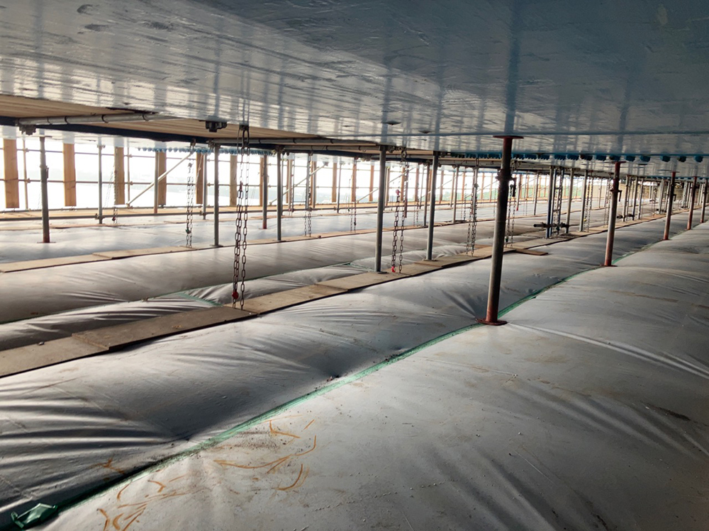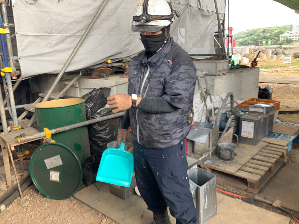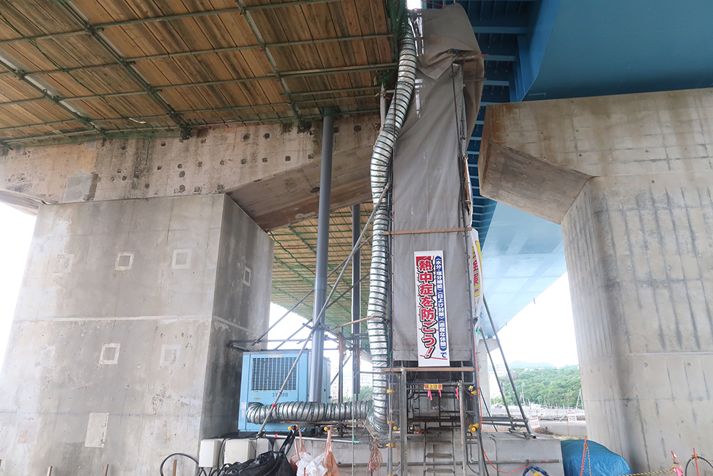 本現場で課題のひとつとなったのが、熱中症対策だ。塗膜除去作業と素地調整の一部が、沖縄の梅雨が明ける7月から10月にかけての施工となり、ブラスト時の粉塵が足場内から外に飛散しないように足場内にシートを2重に敷設して密封性を確保したことから、高温多湿の作業環境になり、作業員の作業効率低下や熱中症の発生が考えられた。