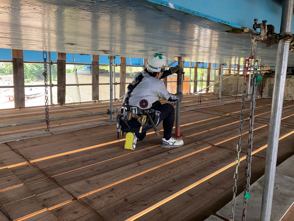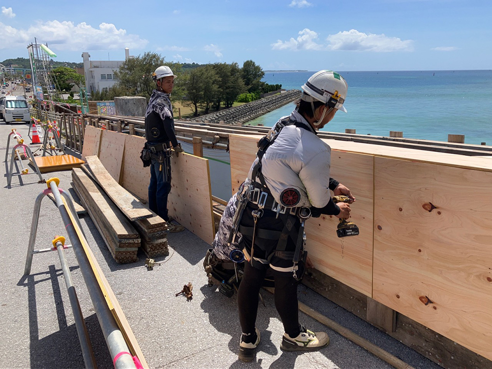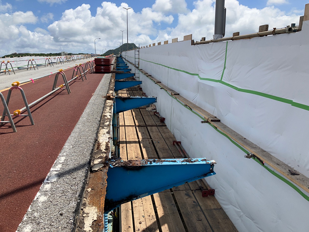 吊足場の安全対策では、台風の襲来が多い沖縄での工事であることから独自の対策も行っている。強風により吊足場が浮き上がり、チェーンが緩むことで落下することを防ぐため、足場内に鋼製支保材を準備しておき、台風の影響を受ける際には各箱桁の下フランジ両エッジ部に橋軸方向4m間隔で支保材を設置して、足場が浮き上がらないように固定することにしたのだ。7月の台風6号では2日ほど暴風域(名護市の最大瞬間風速40.7m/s)に入っていたが、まったく問題なかったという。