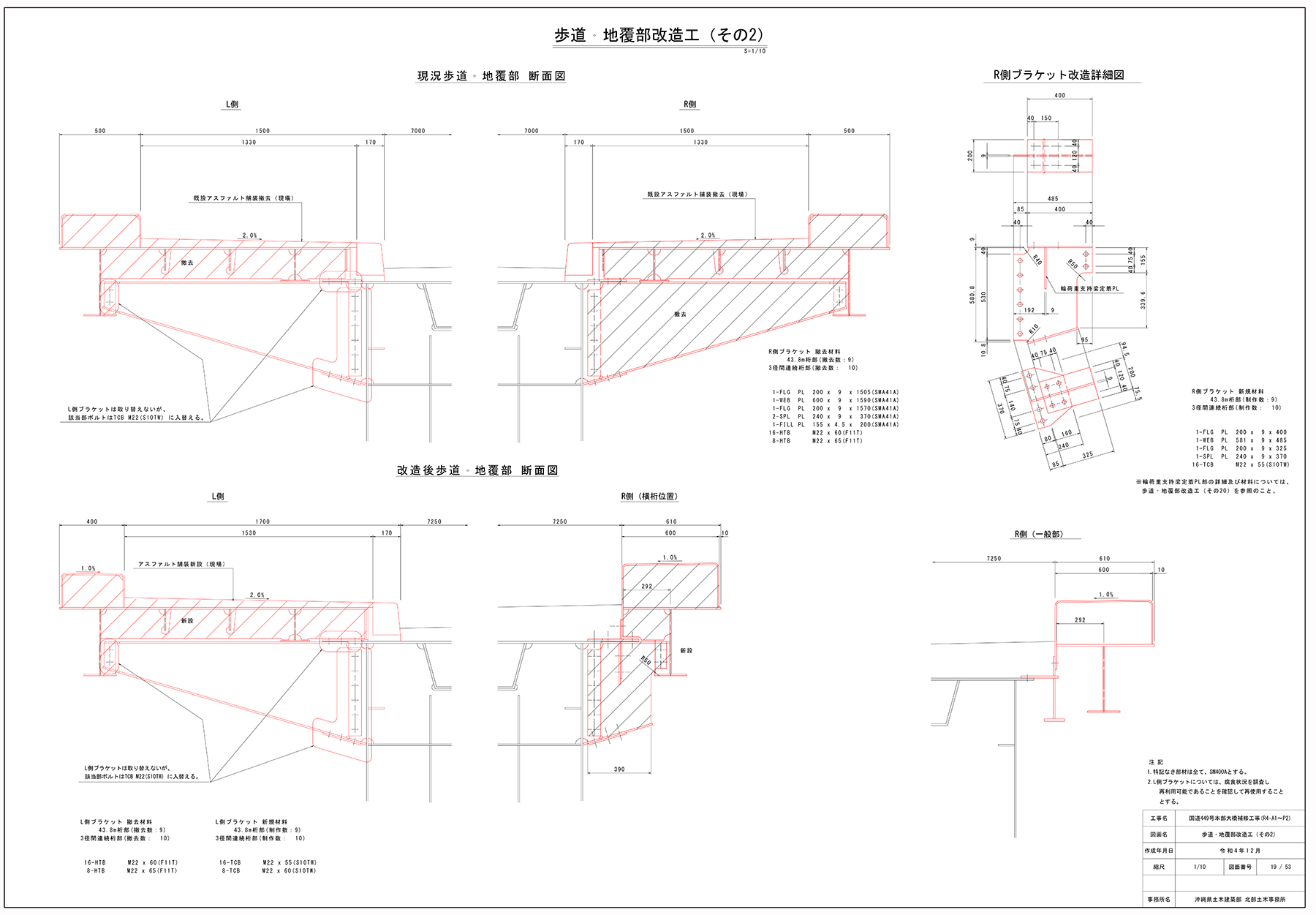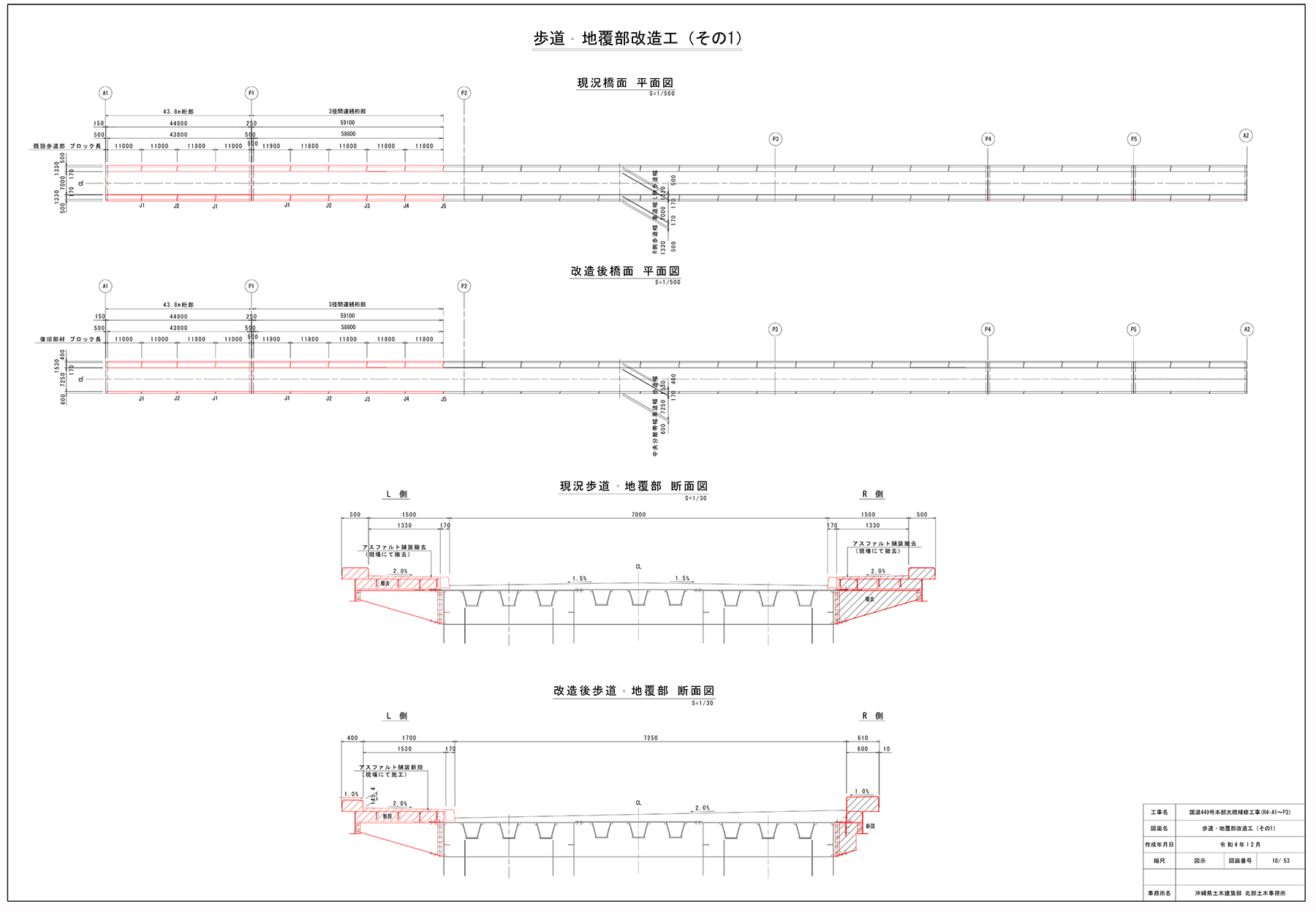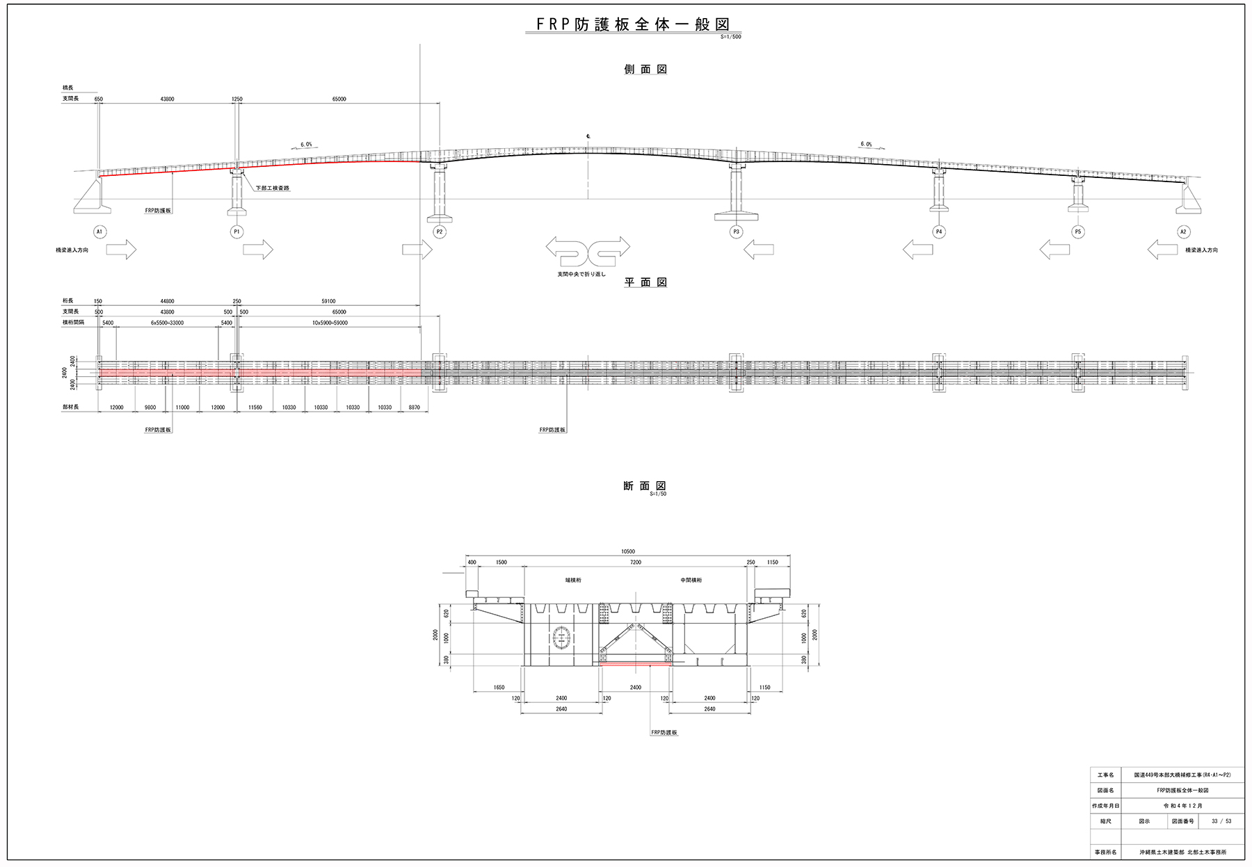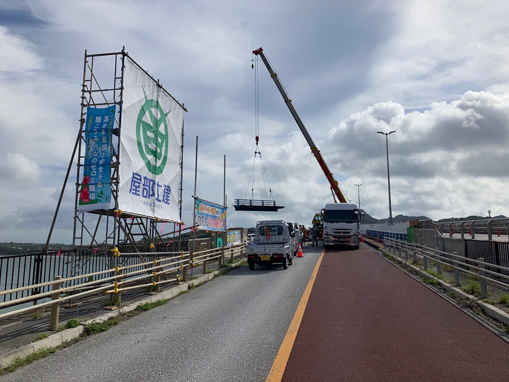 設計は、ホープ設計。A1~P2工事の元請は、屋部土建。一次下請けは、沖縄装美工業(塗装・地覆防水工)、金秀鉄工(地覆・FRP防護板製作・地覆撤去・設置工・FRP防護板設置工・高力ボルト取替工)、ナミト工業(足場工)、本部造園(既設舗装版・境界ブロック撤去運搬工)など。