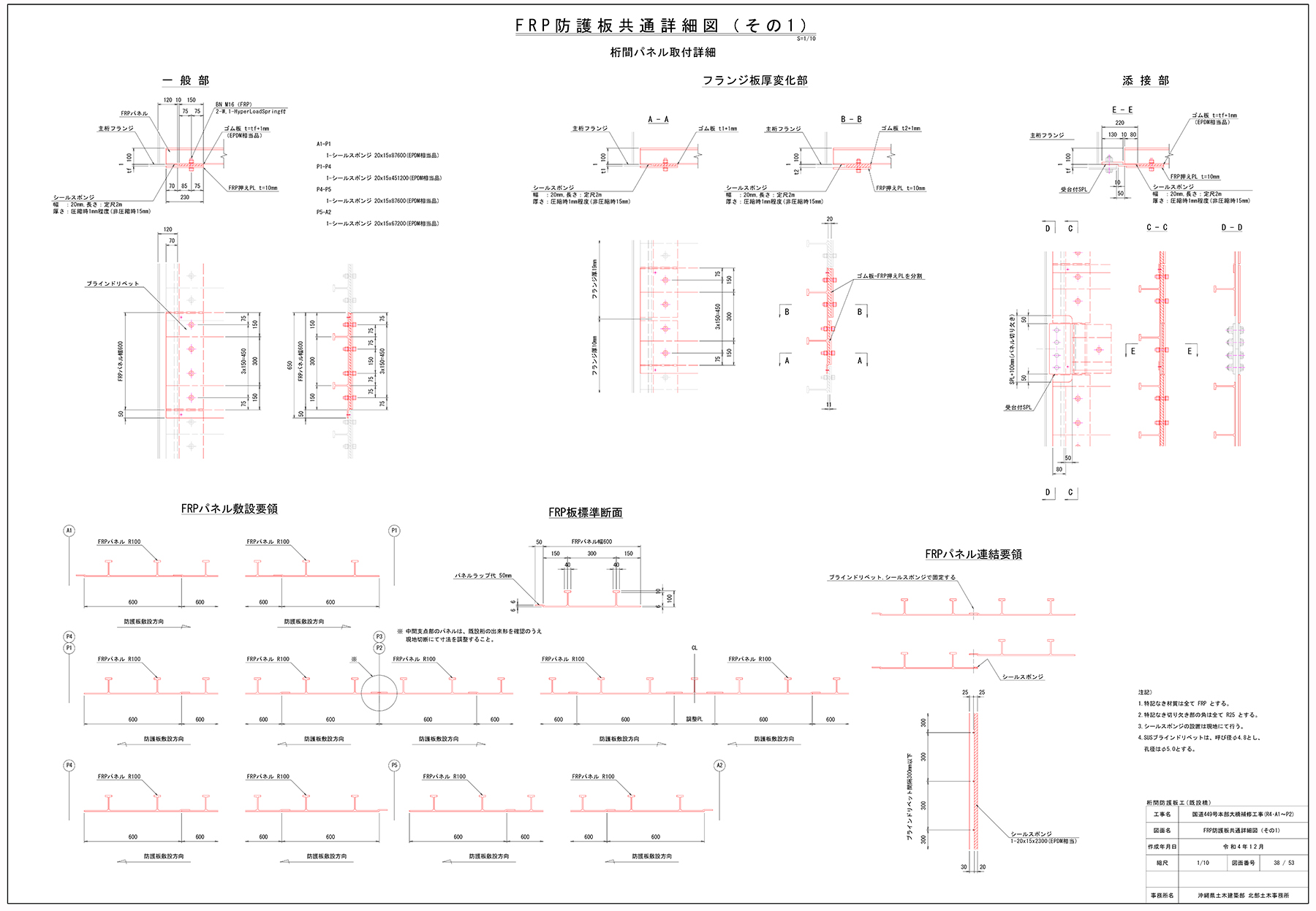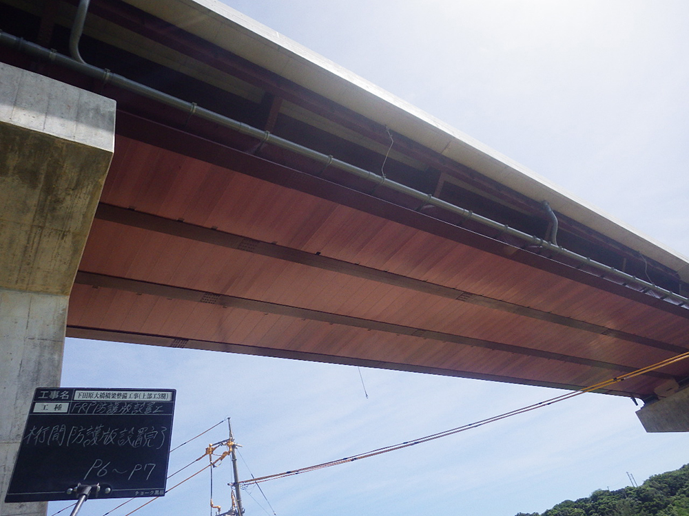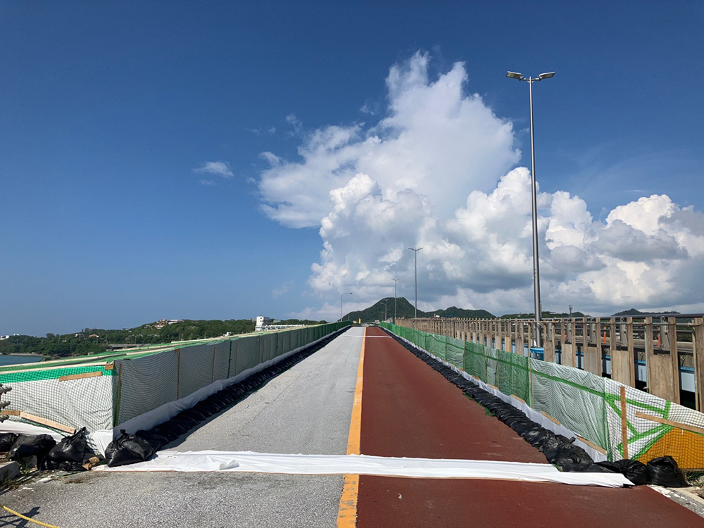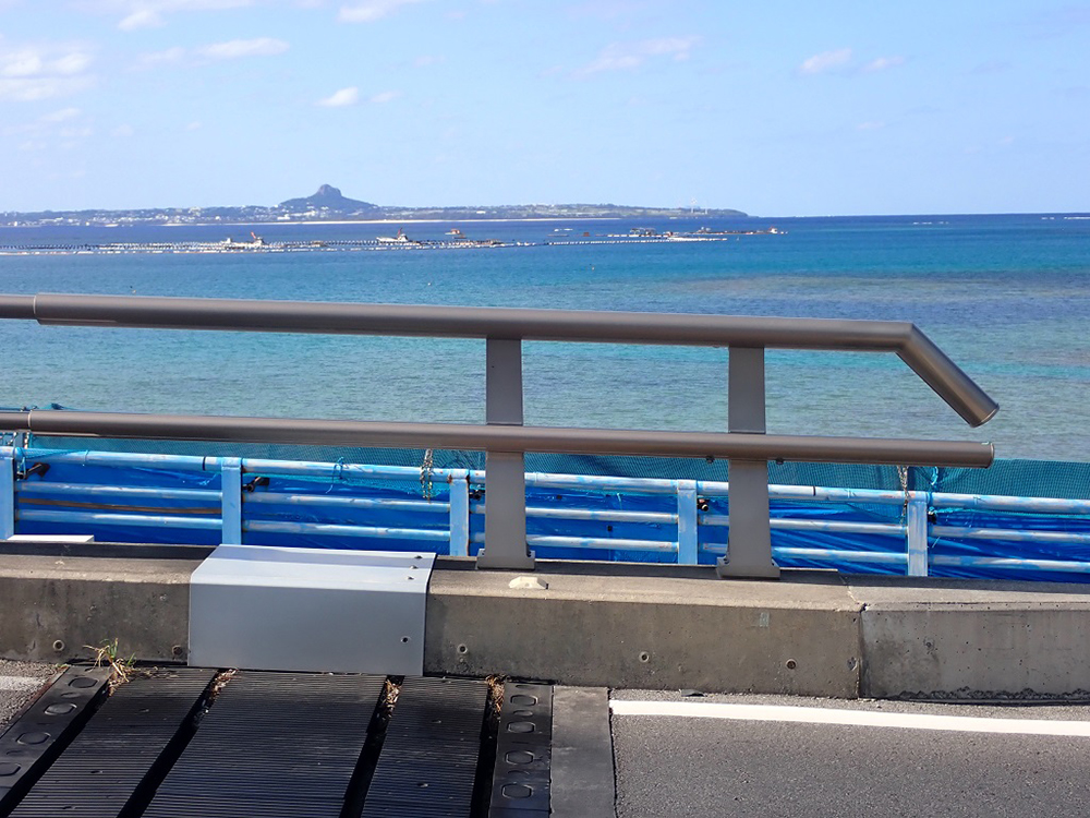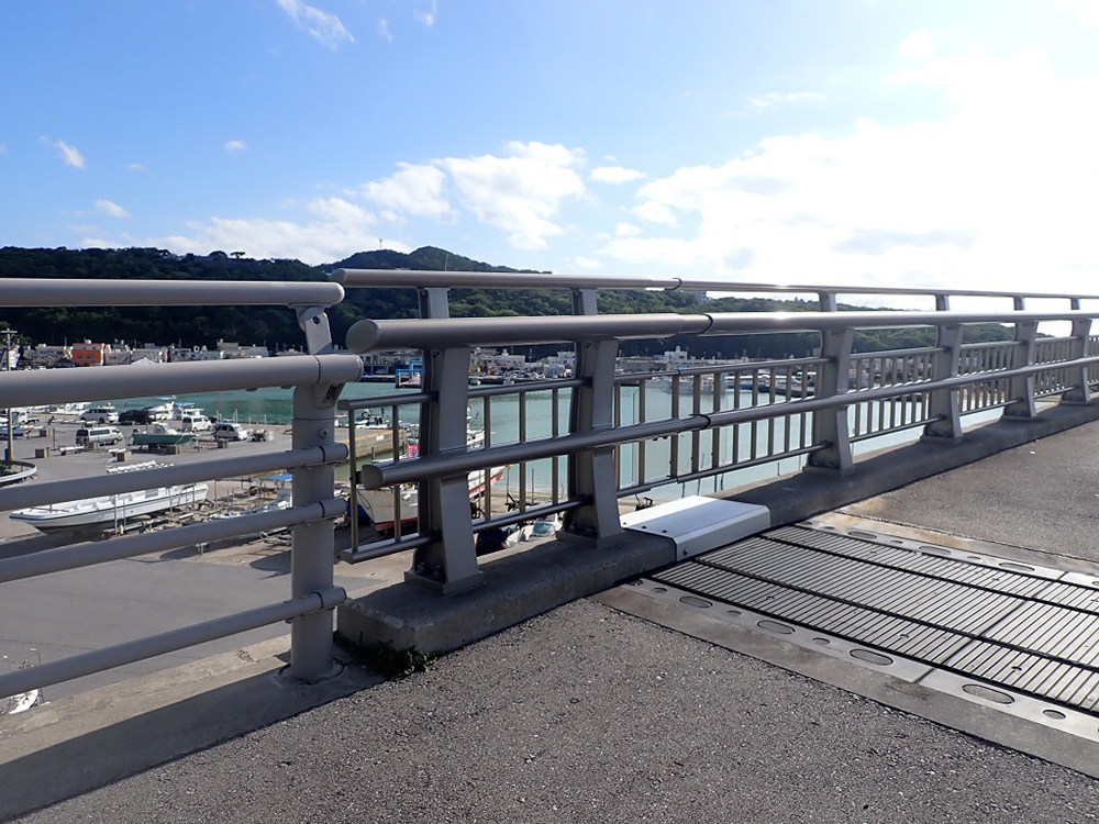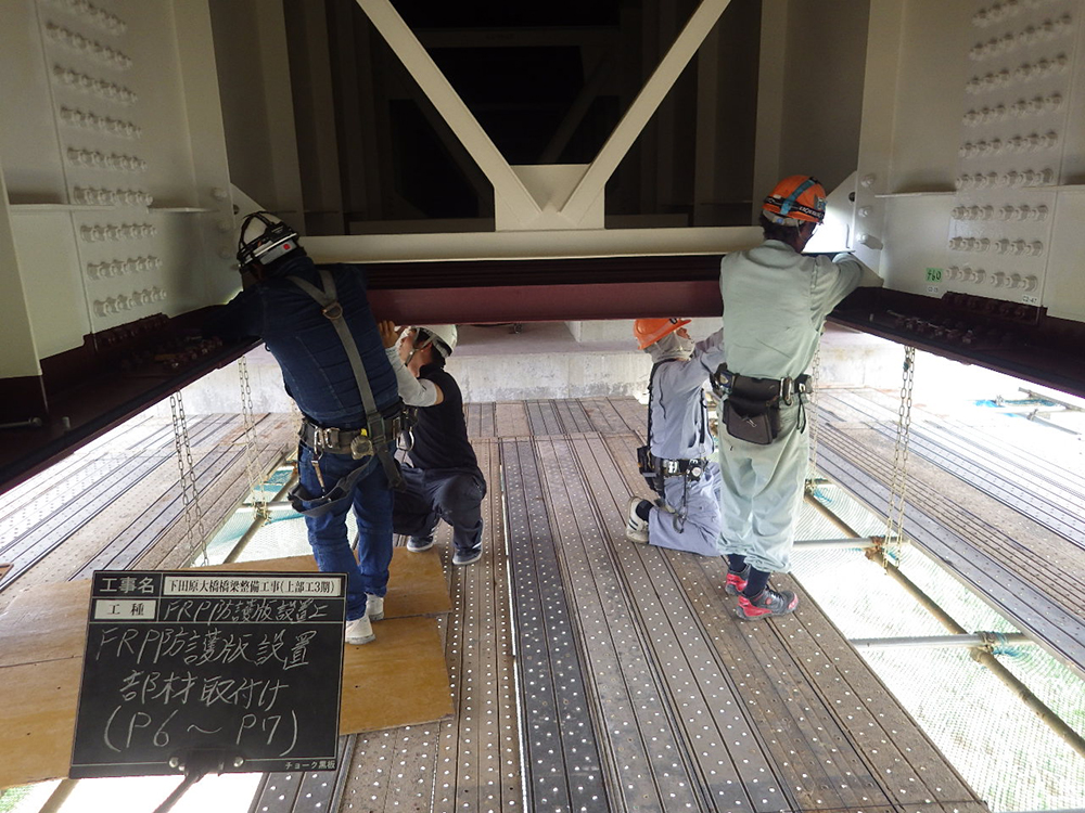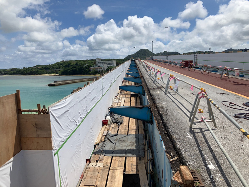 塗替え塗装完了後にはFRP防護板設置工を実施する。沖縄県では「沖縄地区鋼橋防食マニュアル」に記載されている飛来塩分防護板を新設橋梁、および塗替え橋梁の桁間に検査路も兼ねて設置し、多機能防食デッキによる環境改善の防食法は有効としていることから、近年採用が増えている。FRP防護板(宮地エンジニアリング)としたのは、軽量で後付け設置が容易であること、および経済性からで、沖縄県では2020年度に完成した下田原大橋(八重山土木事務所)でも採用されている。