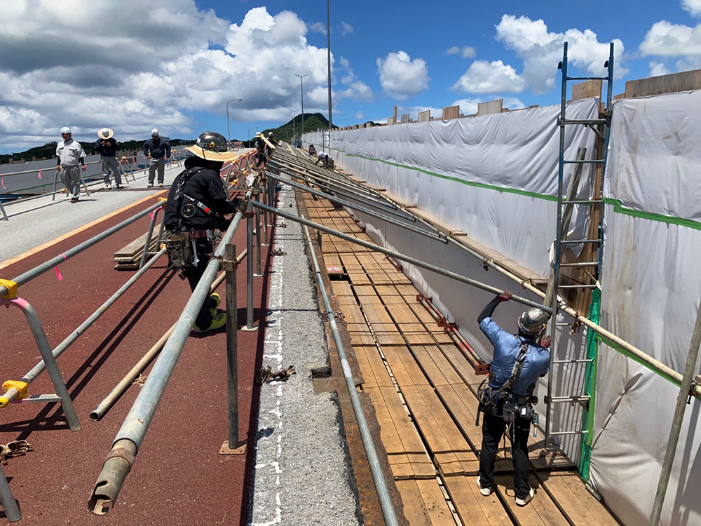 足場は単管吊足場を採用している。本工事では地覆改造工で既存の地覆撤去を行うことから、撤去箇所からブラストなどによる粉塵流出の可能性があり、養生足場を設置する必要があった。そこで、工程に応じて臨機応変に対応でき、容易に設置が可能な単管足場とした。