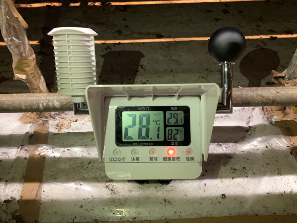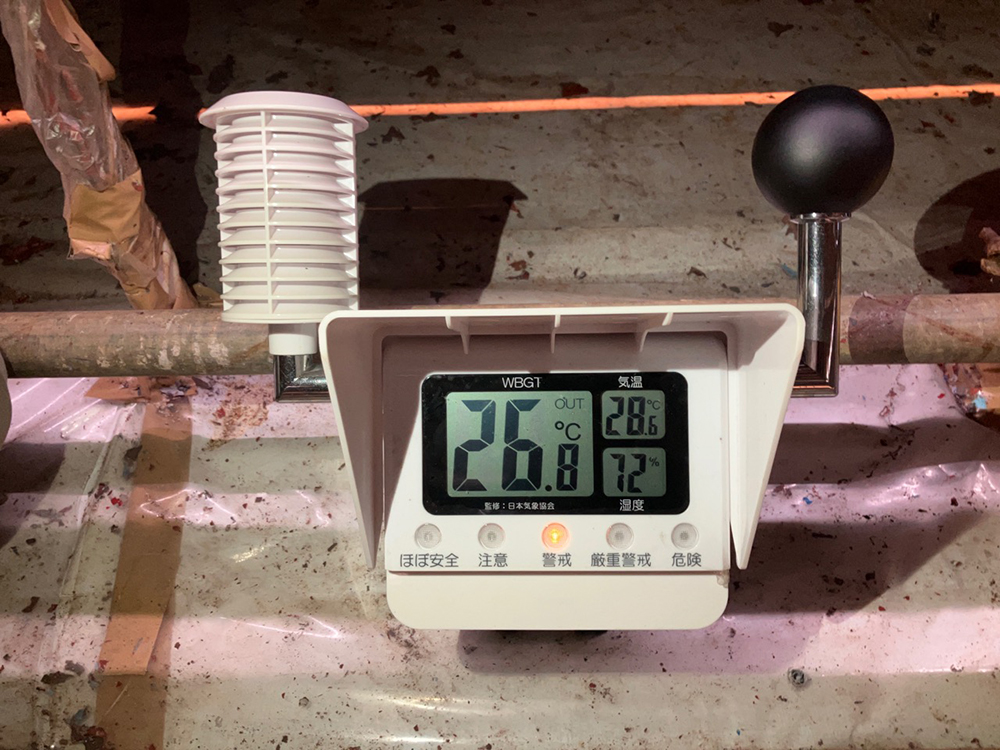 そこで屋部土建では、ドライクーラーを設置して足場内に冷風を送り、作業環境の改善に努めた。その効果は大きく、ドライクーラー稼働前の足場内の温度/湿度が29.1℃/82%、暑さ指数(WBGT)が厳重警戒の28.1℃であったのが、稼働1時間後には同28.6℃/72%、WBGTは警戒の26.8℃まで下げることができた。