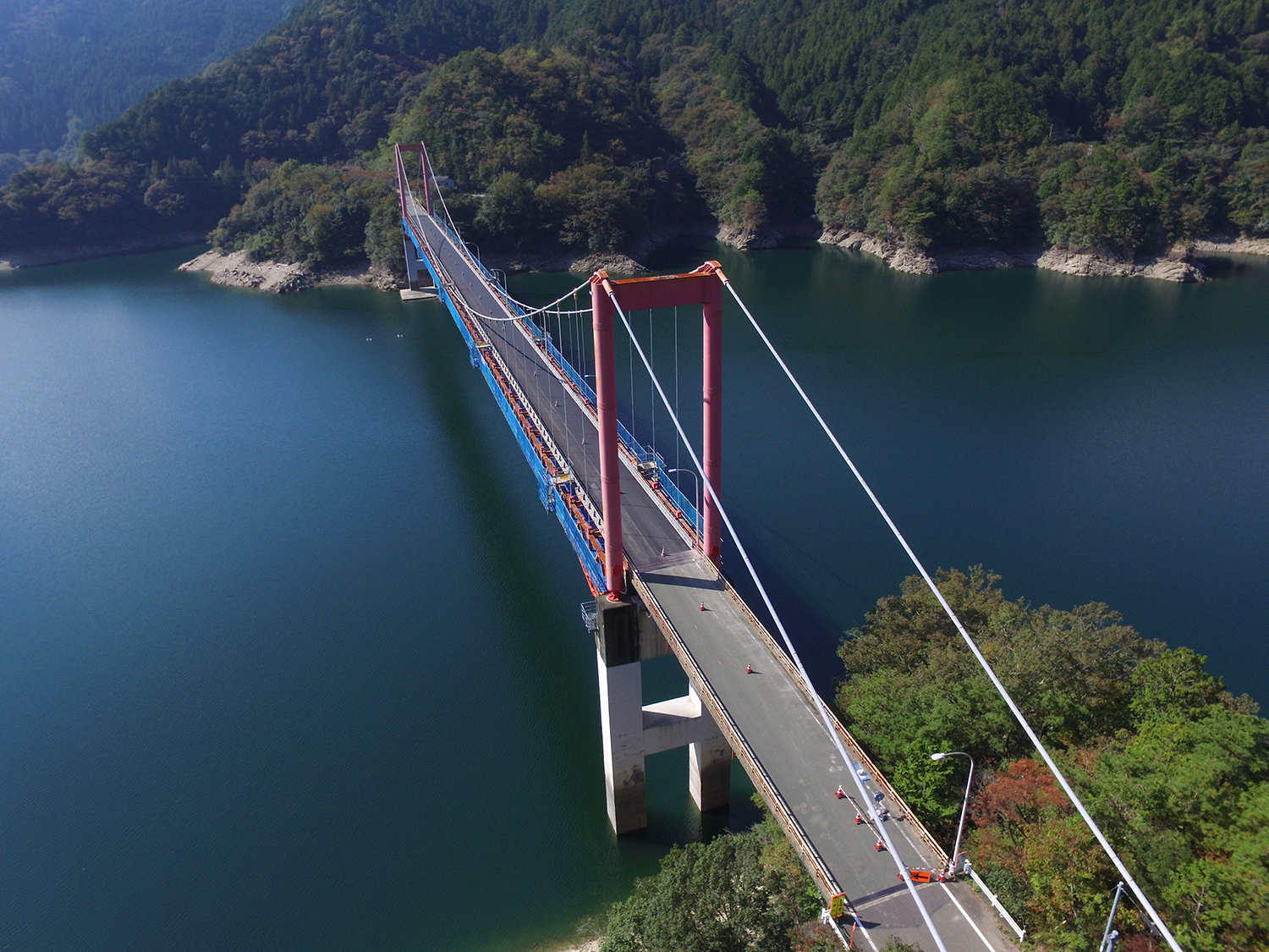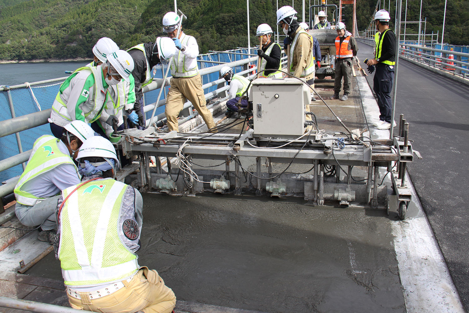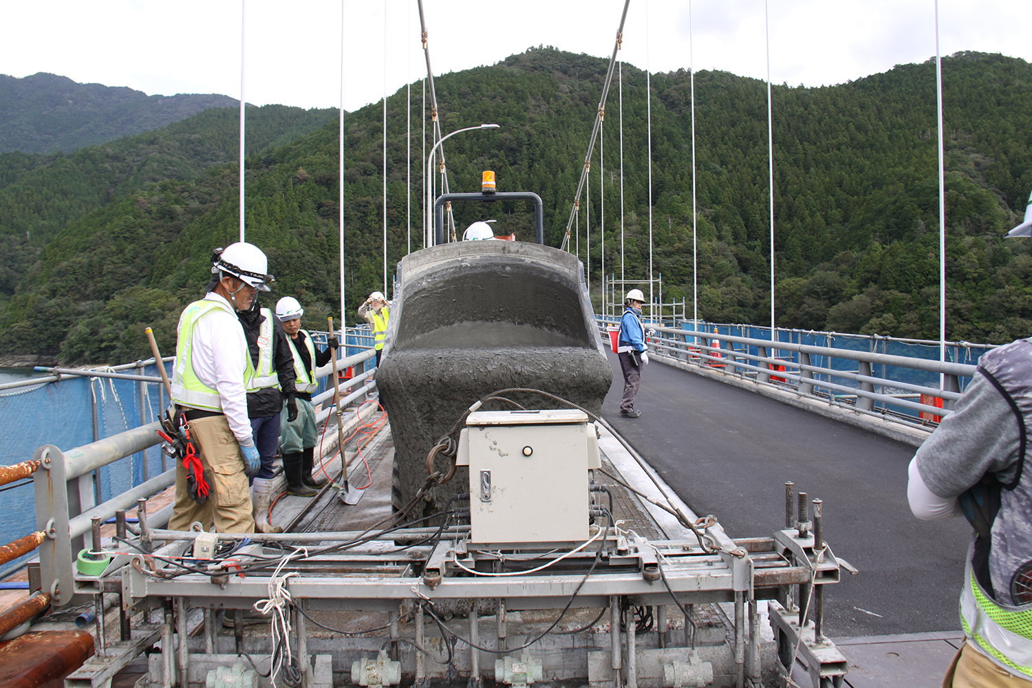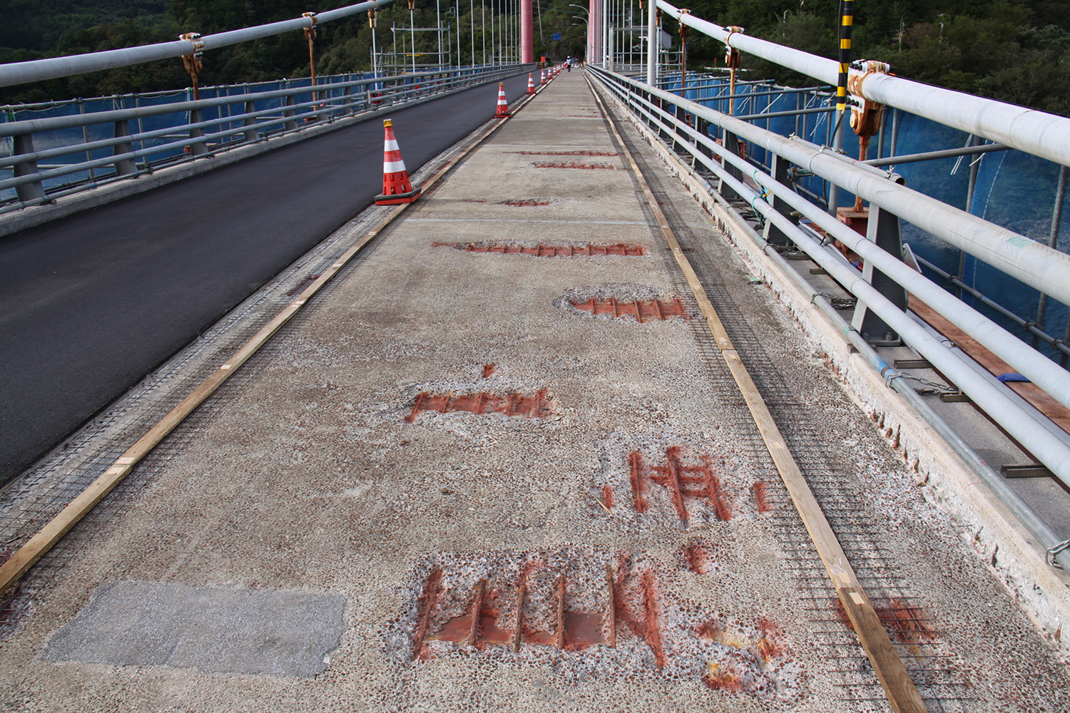 高知県は、早明浦ダムに架かる上吉野川橋吊橋部の床版補修を行った。同橋は1971年3月に当時の本四公団が、本四連絡橋を作る前のパイロット工事として建設した橋梁である。橋長321.36m、有効幅員6mの3径間連続鋼吊橋で、吊橋主塔間の中央径間長は250m、補剛桁は3主の床組トラス構造であり、既設床版は180mm厚の天然軽量骨材を用いた当時としては珍しいプレキャストRC床版である。プレキャストRC床版とはいっても、パネル同士の間詰部は延長方向には鉄筋は無く、幅員方向は鉄筋が入っており。それに間詰モルタルを打設した程度である。林業が盛んな地域のダムを跨ぐ箇所に架けられているため、大型車の往来がかなり頻繁で、かつ地域の生活道路としても使用されており、山間の一般道路橋としてはかなり交通量が多い印象だ。今回はその床版を取り替えるのではなく、床版上面を薄くはつり、圧縮強度の特性値が130N/mm2を有する超緻密高強度繊維補強コンクリート『J-Thifcom』を用いて、平均20mm厚で薄層補修し、補修後の床版たわみ量を6/100に抑えた現場を取材した。(井手迫瑞樹)