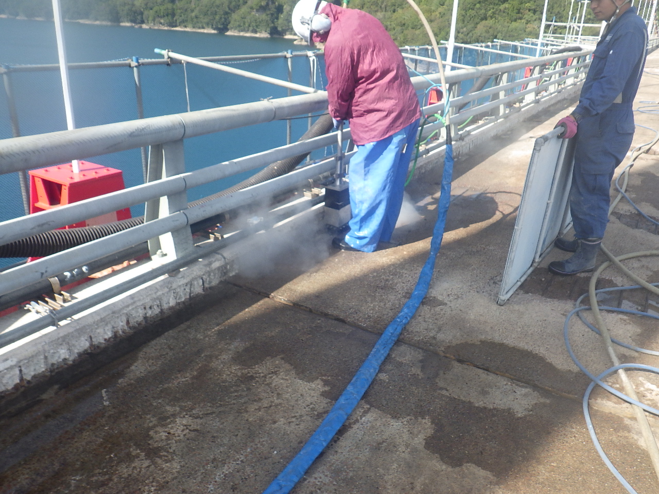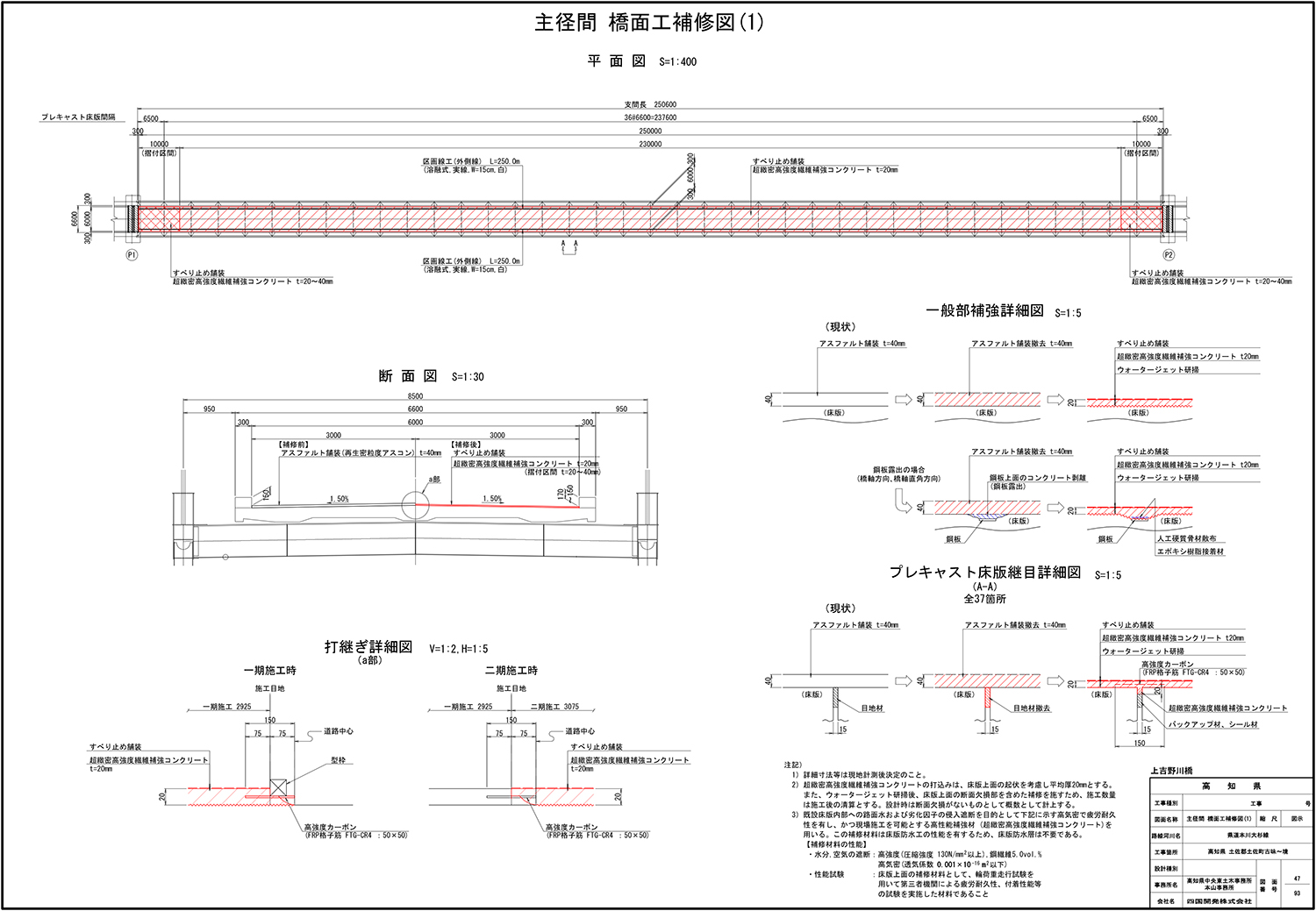 補修に関する調査は第一コンサルタンツ。工事の元請は四国開発。一次下請はサンブリッジ、二次下請は四国ニチレキ、コンクリートコーリング。