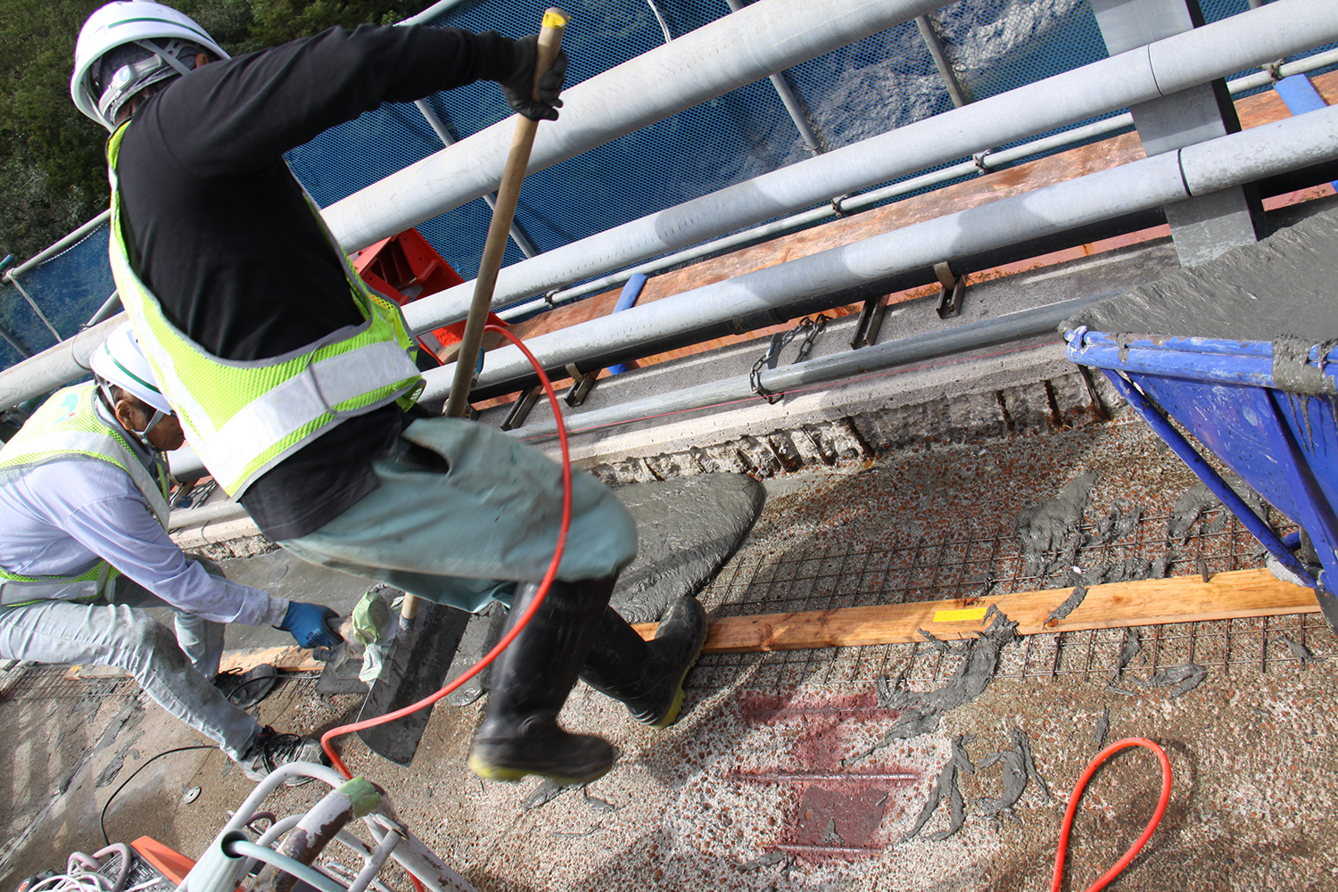 打設施工は、性能とのトレードオフで少し手間を要する。水セメント比は17%とセメントリッチであり1㎥当たりのセメント量は2tに達する。「きわめてねっとりとしたコンクリートであるが、チクソトロピー性(揺変性)がある」(サンブリッジ)ため電動レイキで施工すれば流動性は担保でき、その後の高周波振動フィニッシャによる転圧も可能であるため、良好な品質が確保できる。