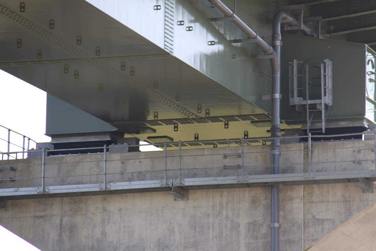 また、同橋は桁の外面に横桁が張出す形で、支承に桁を載せているが、その横梁は「曲線が厳しい現場であり、架設時には邪魔になる」(岐阜国道事務所)ことから、架設後に横梁を溶接した上でジャッキダウンし、支承上に載荷した。