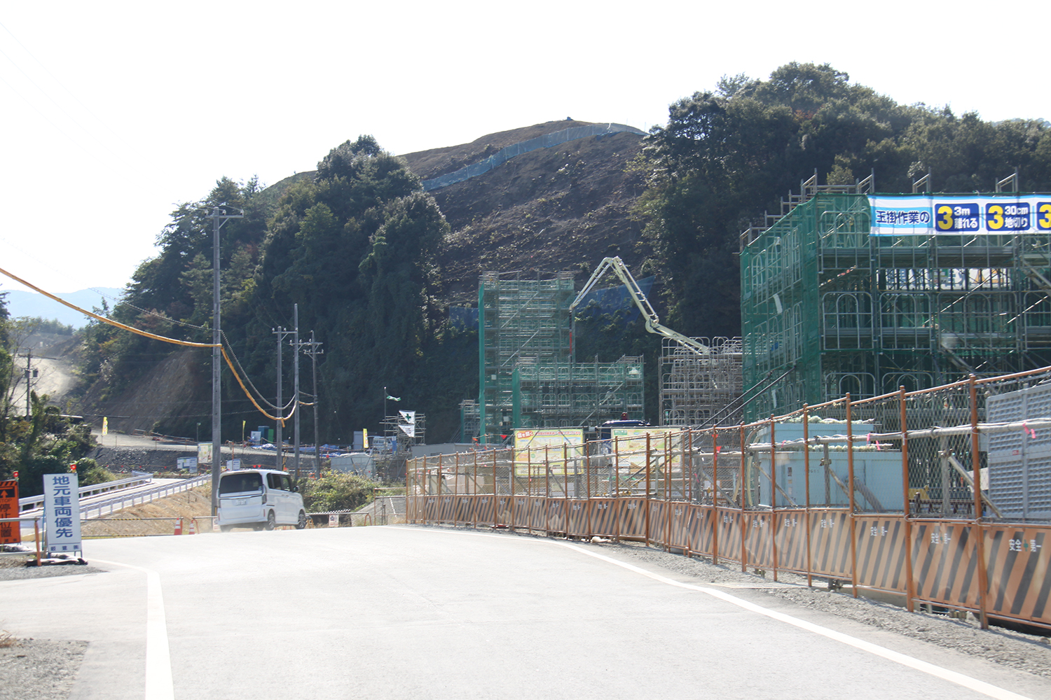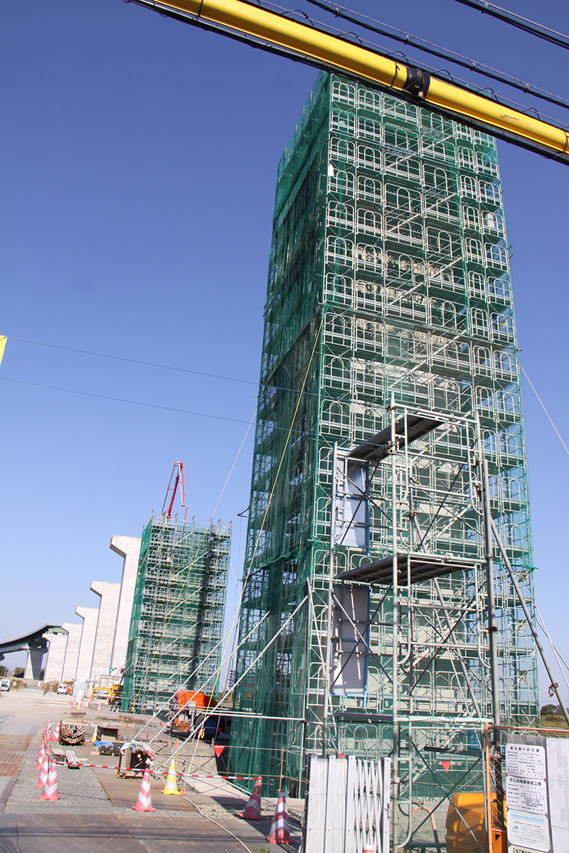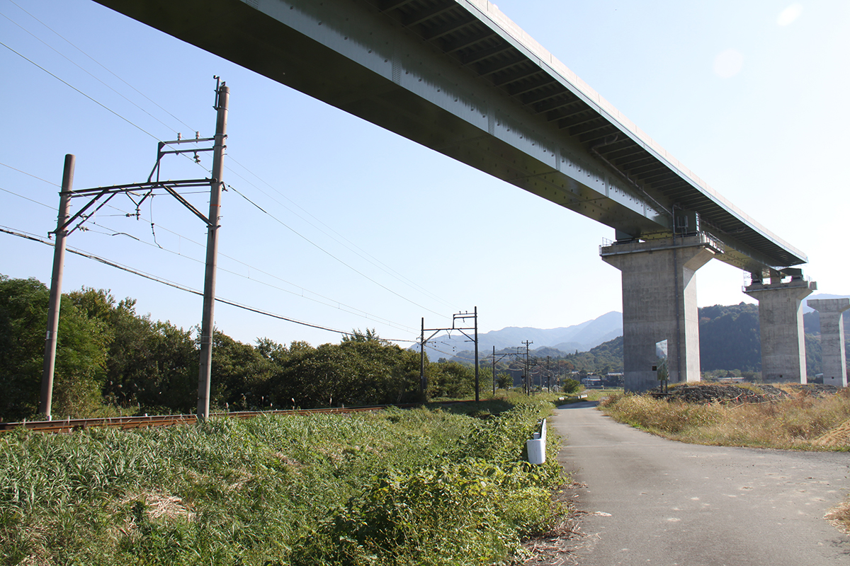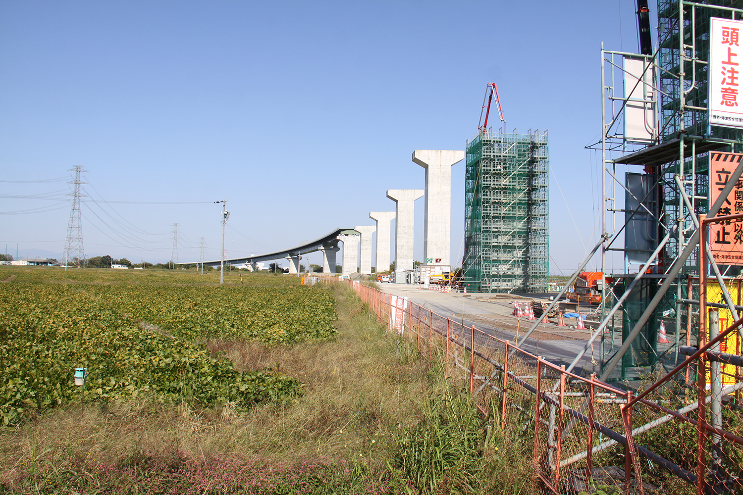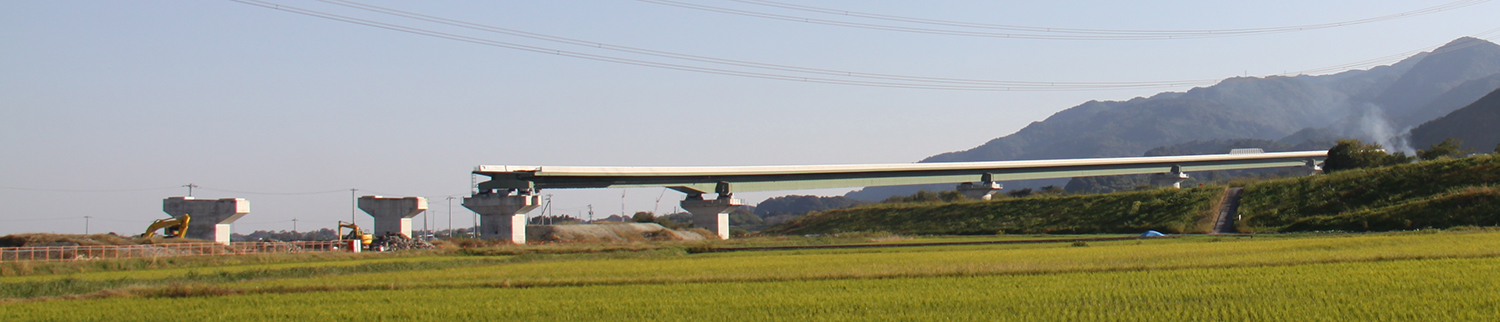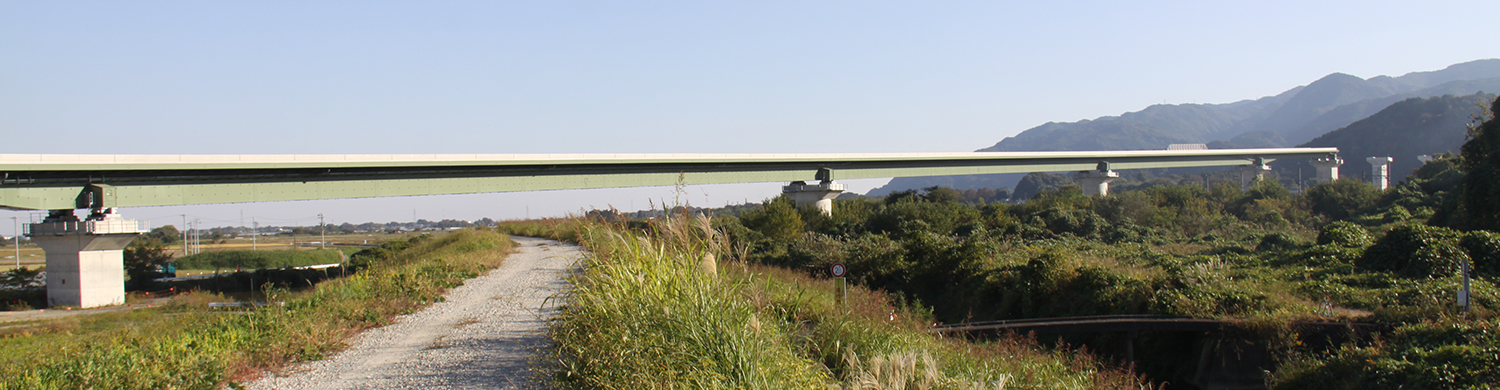 同橋以外では海津高架橋(橋長312m、鋼7径間連続少数鈑桁橋)と志津第1高架橋(240m、鋼5径間連続少数鈑桁橋)を発注済みで、現在は桁製作中であり、架設は海津高架橋が来年9月頃、志津第1高架橋が来年12月頃を予定している。その他の海津PA高架橋(93m、鋼2径間連続少数鈑桁)、志津第2高架橋(220m、鋼5径間連続少数鈑桁)、同第3高架橋(210m、鋼5径間連続少数鈑桁)、庭田高架橋(515m、PC5径間連続箱桁橋)、庭田北谷橋(21m、PCプレテン単純T桁)は未発注である。