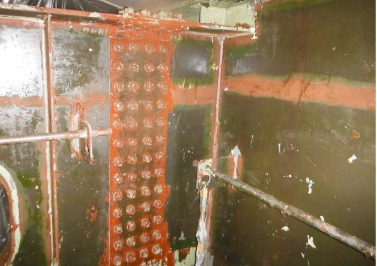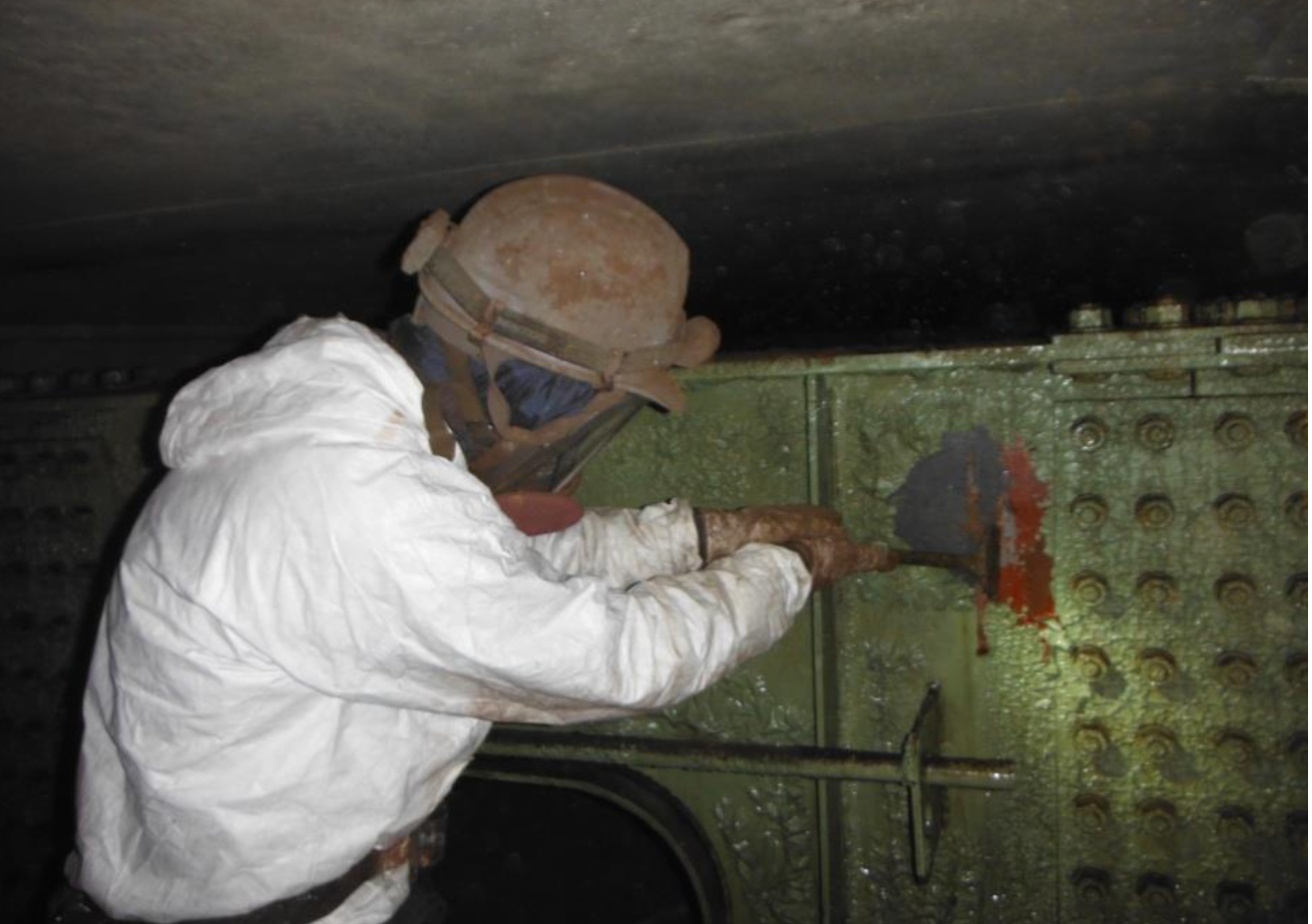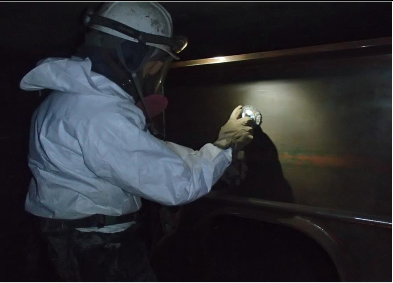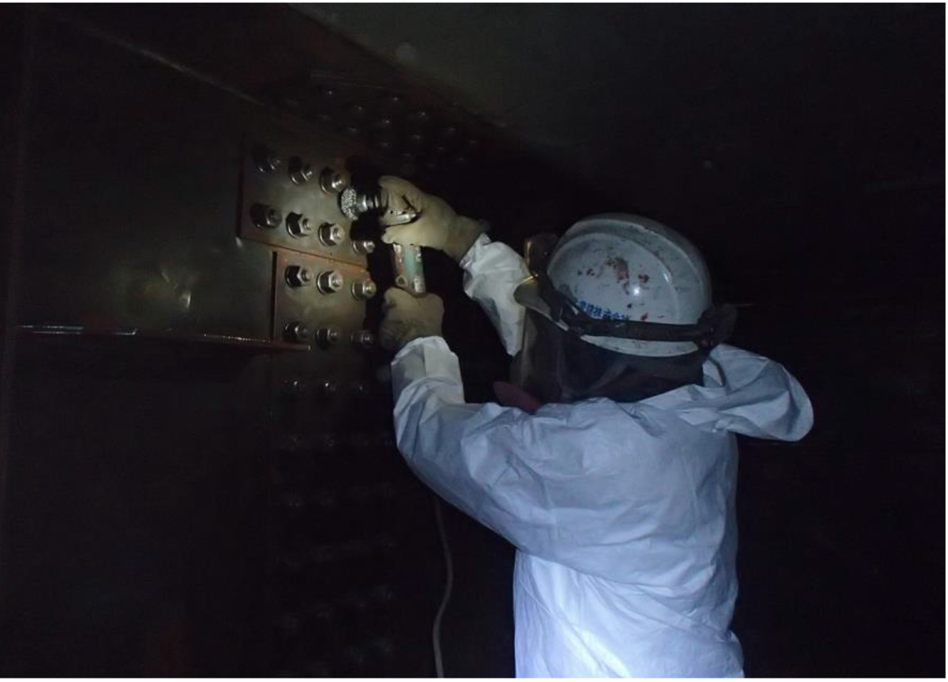 これらの作業を行っても塗り替えに必要なアンカーパターンはつかない。通常はブラストを使うところであるが、今回は粉じんを発生させないことを優先してディスクサンダーなど電動工具による2種ケレンを実施して塗り替えている。